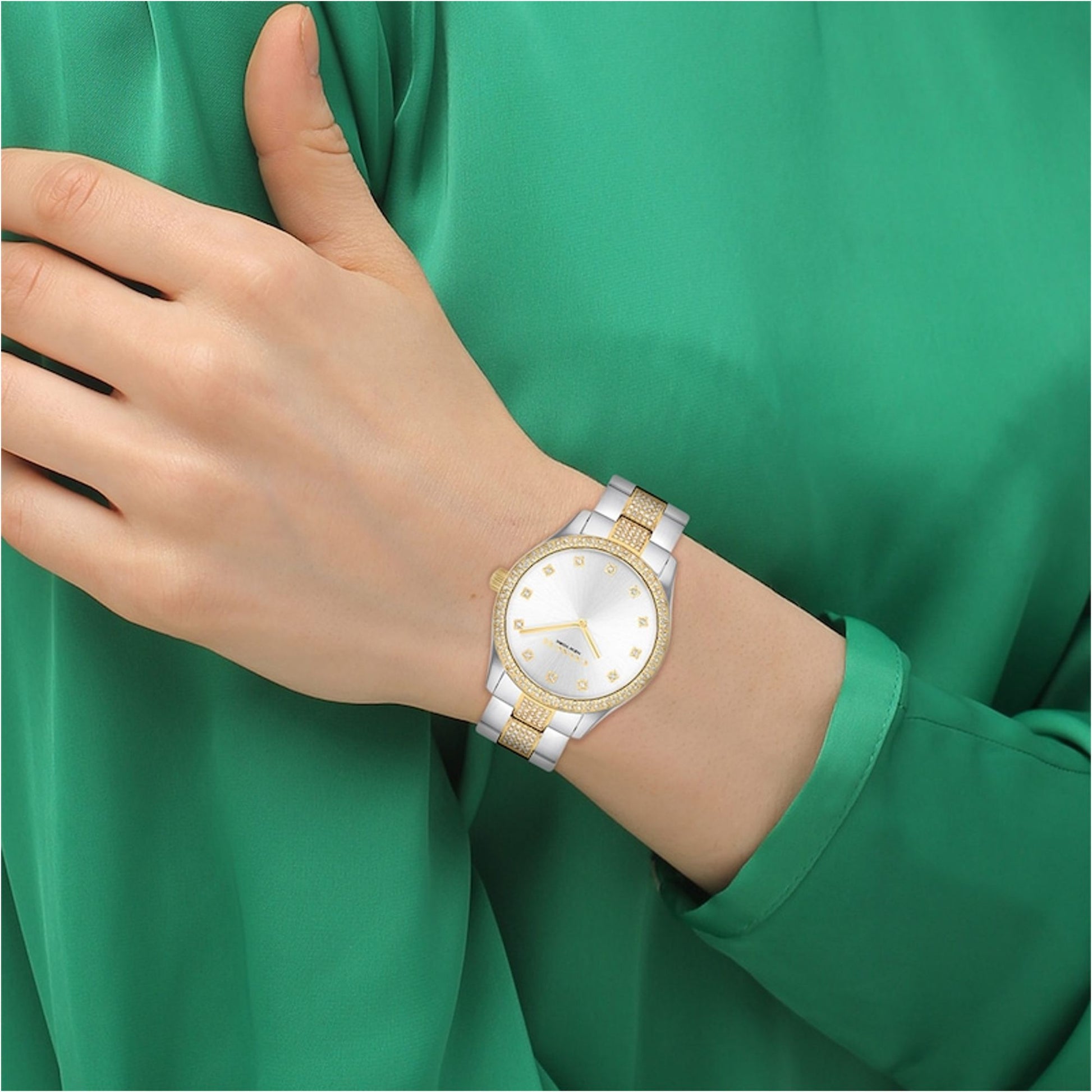 This sophisticated Brooks watch combines a timeless design with contemporary flair, perfect for both daytime and evening wear. The bracelet complements the striking sunray dial, while the bezel, markers, and center links are adorned with shimmering crystals, making it a standout accessory for any occasion.