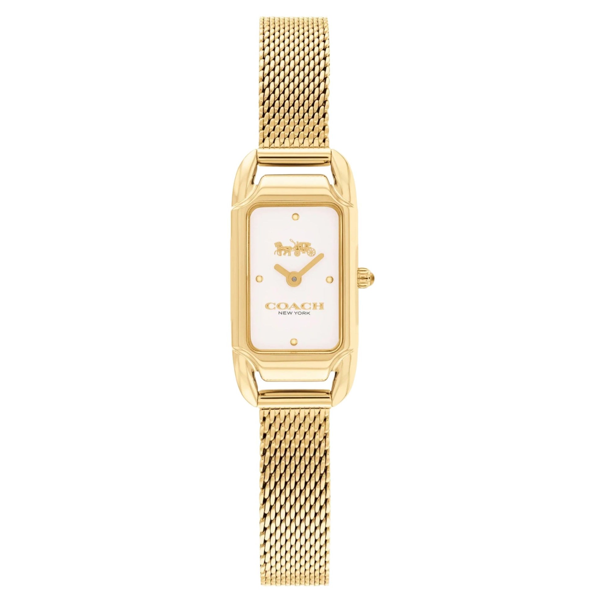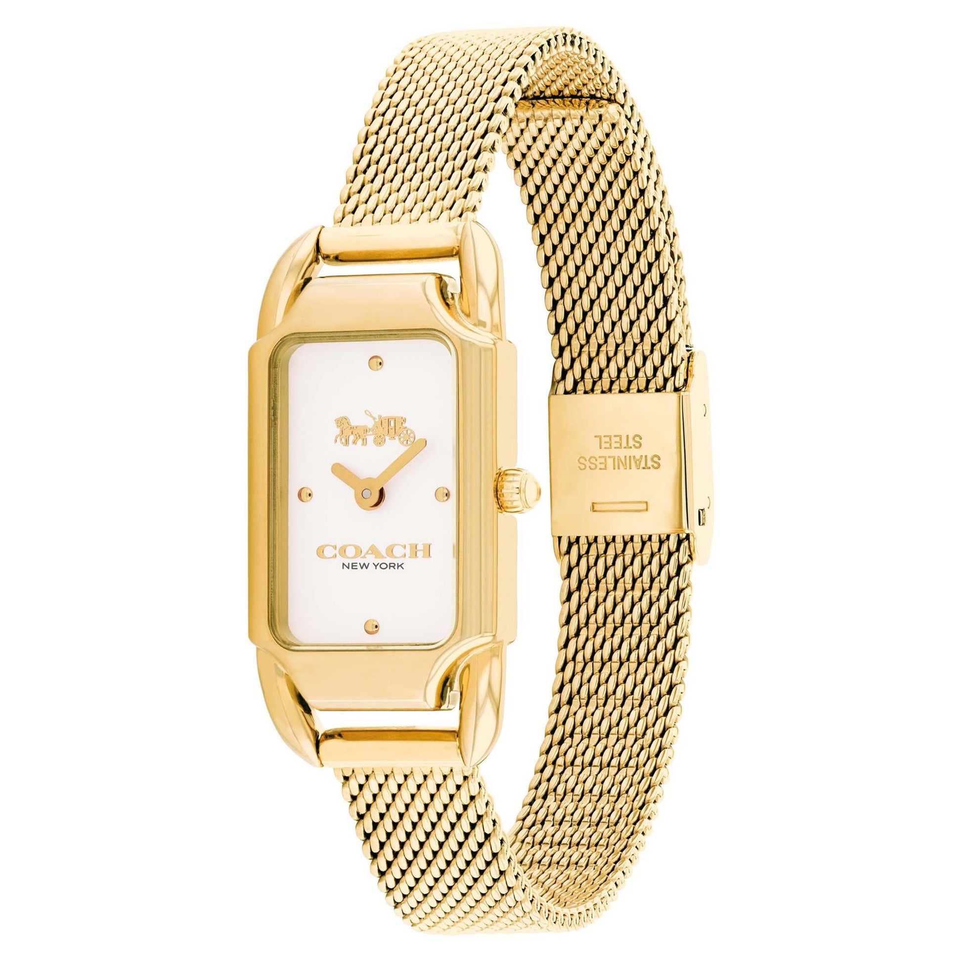 The Cadie watch by Coach exemplifies sophistication with its metallic-tone stainless steel design. This exquisite timepiece showcases a refined band and a stylish rectangular case, complemented by a striking dial adorned with the iconic horse and carriage logo, representing the rich heritage and craftsmanship of the brand.
