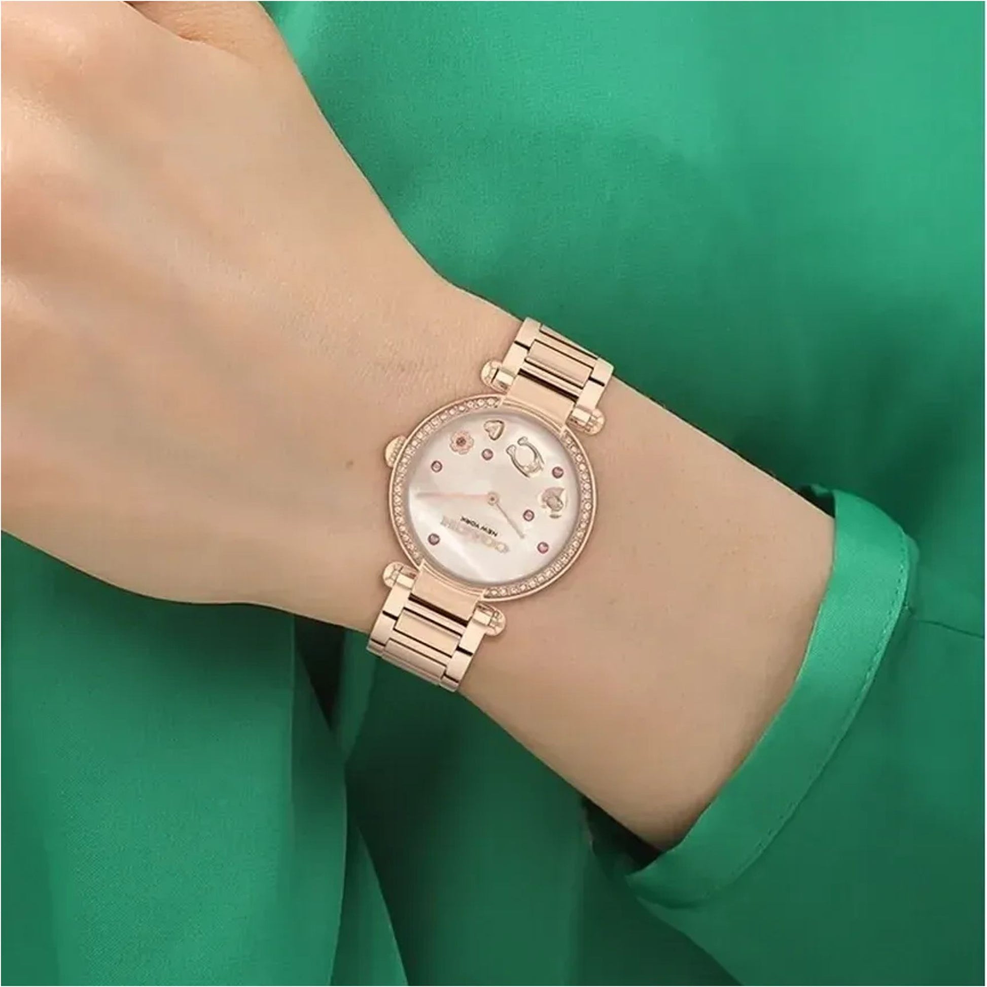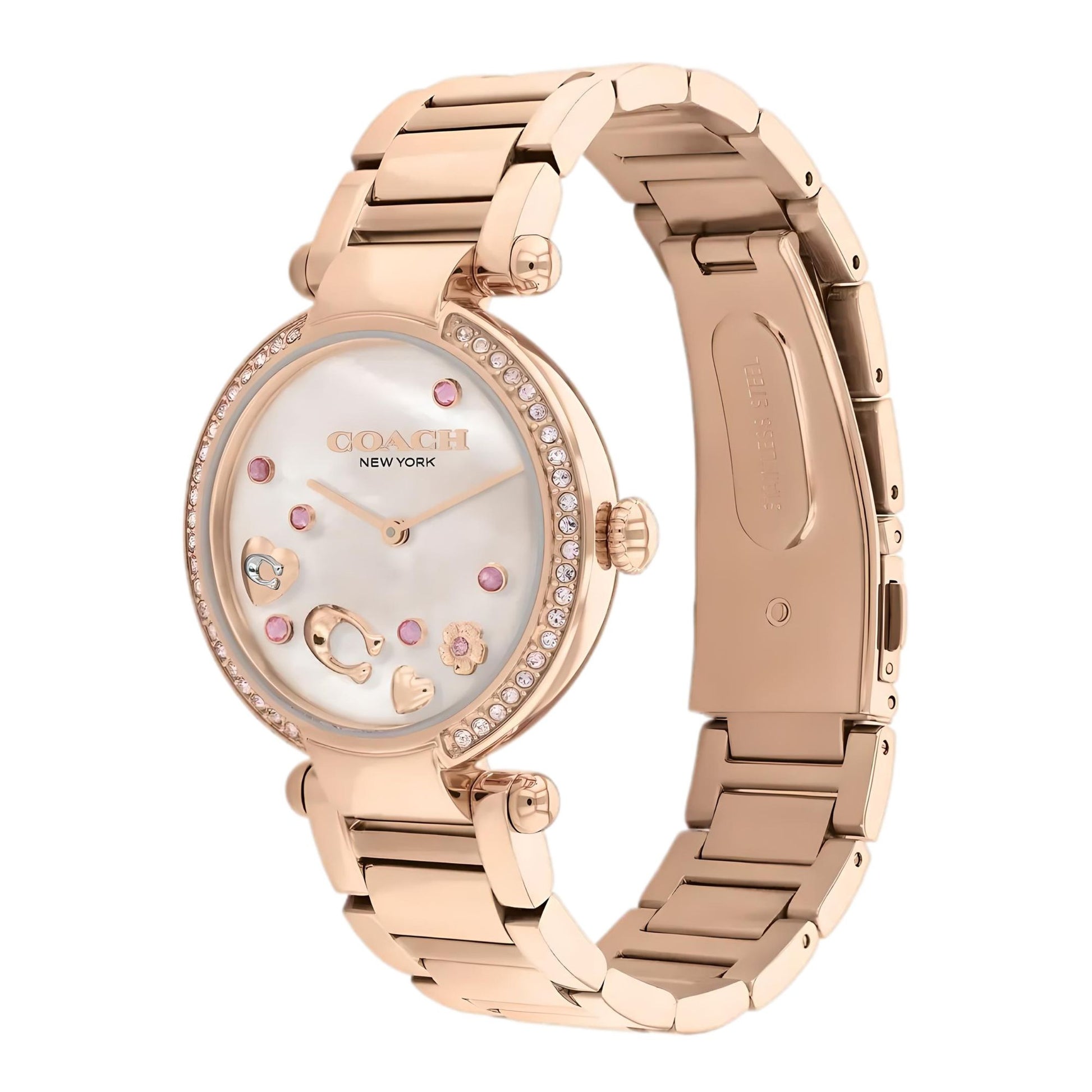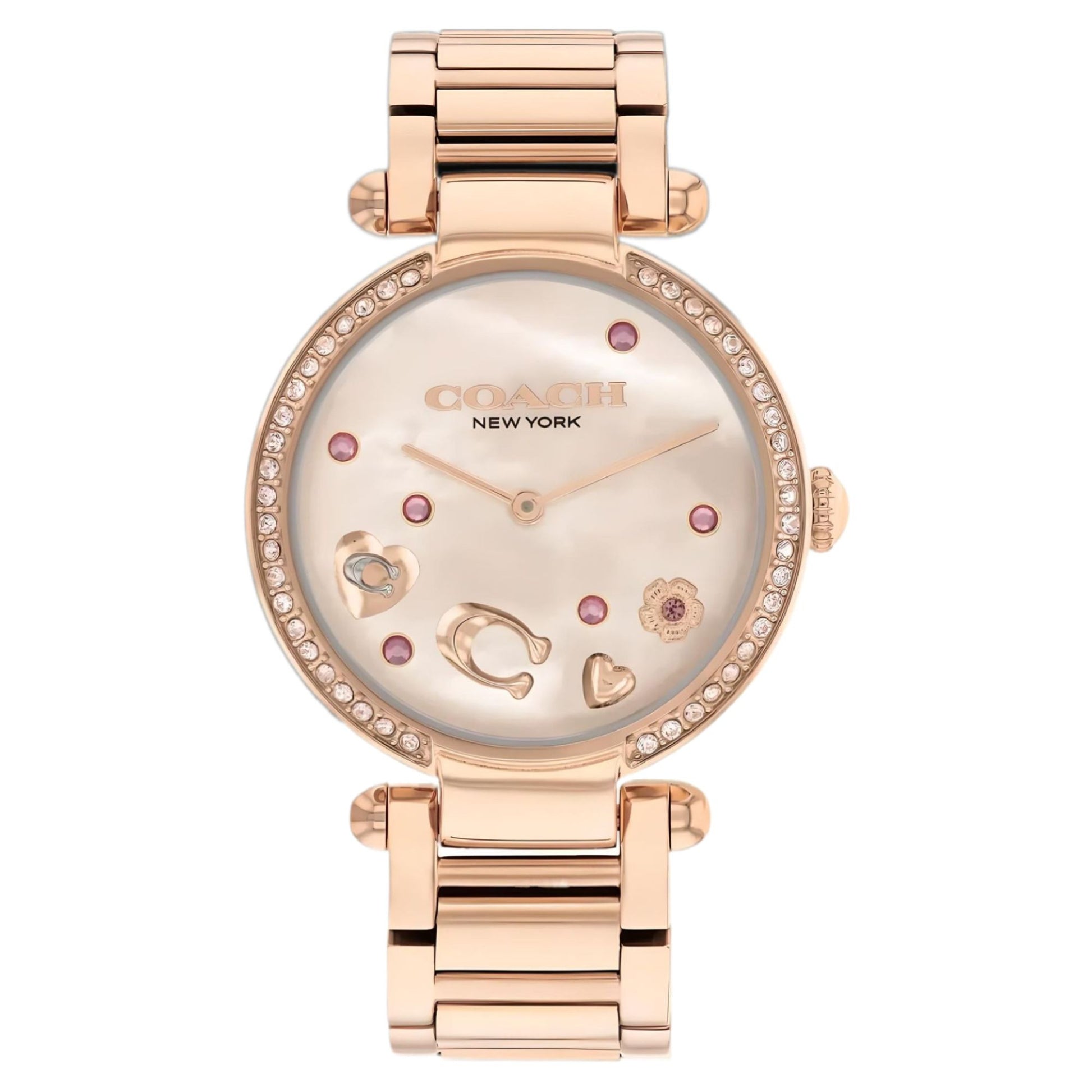 The Cary watch embodies sophistication and elegance, making it an ideal accessory for any occasion. Its rose gold bracelet, adorned with a sparkling crystal bezel, complements the radiant pink mother-of-pearl dial, which showcases a whimsical arrangement of signature Coach charms.