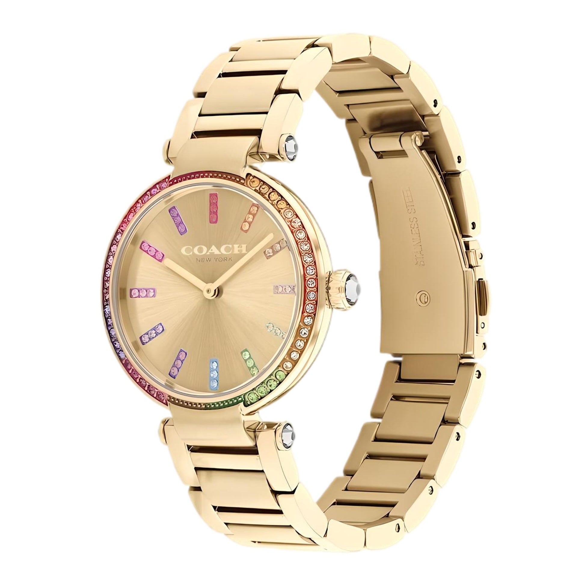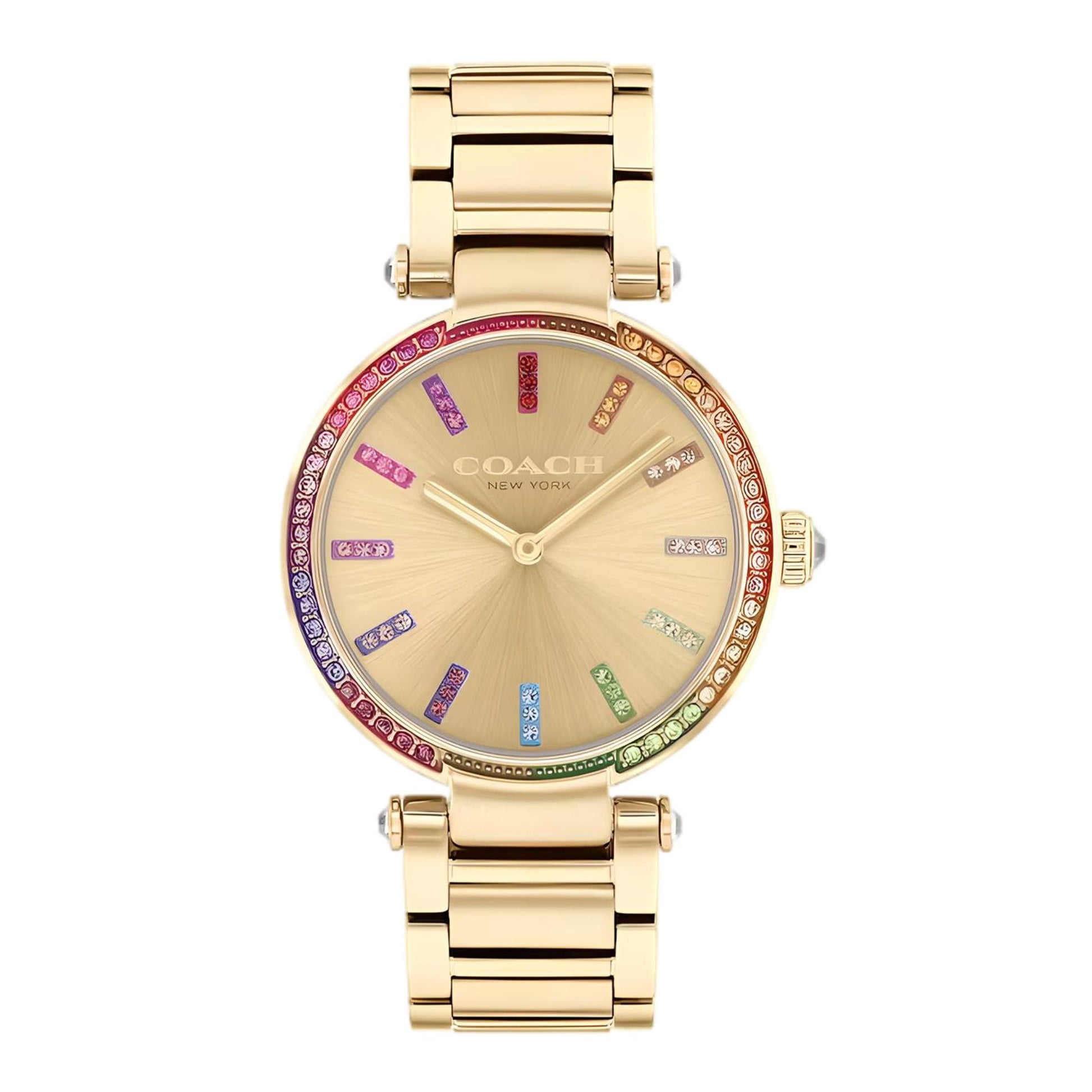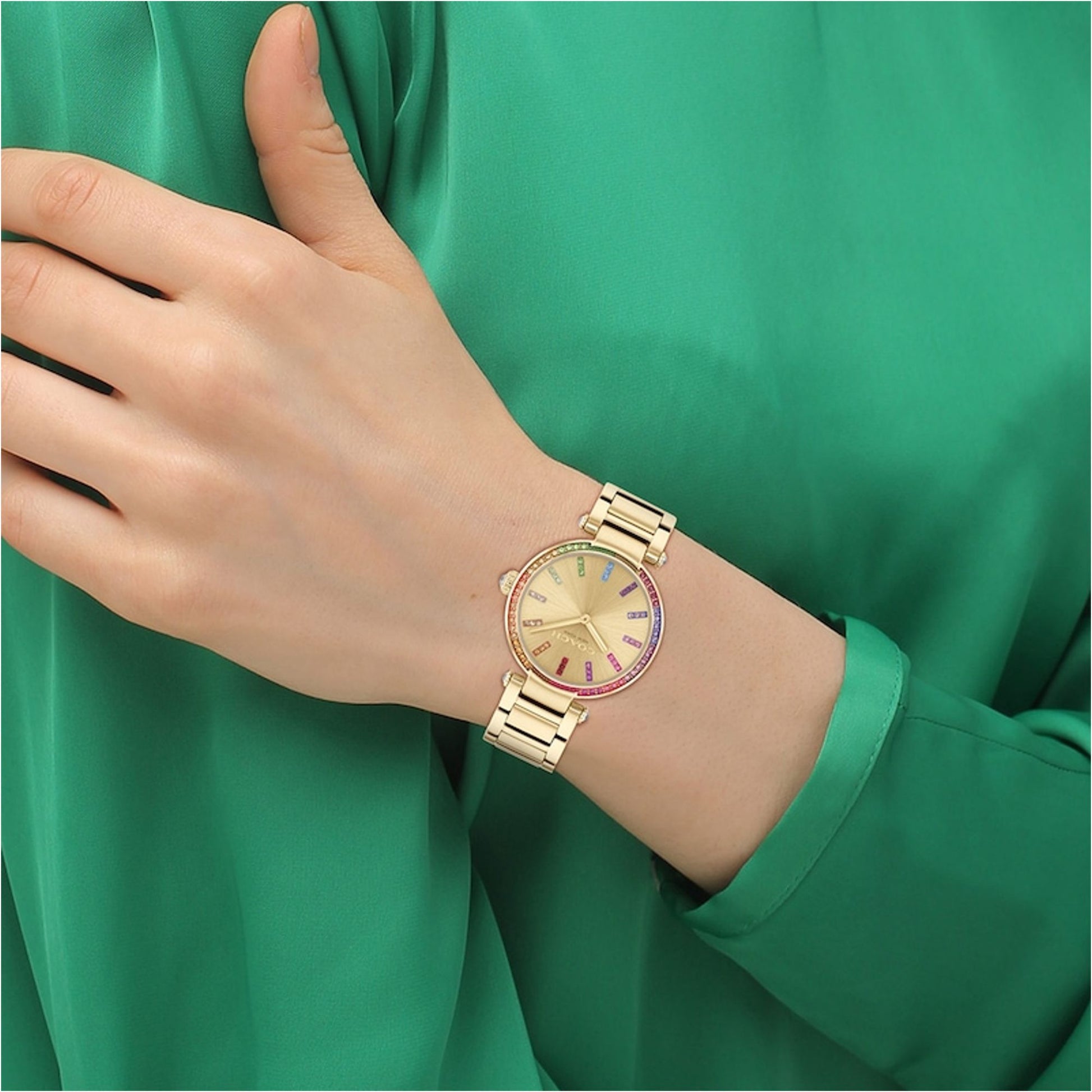 Explore the women Cary collection featuring a luxurious gold dial with vibrant rainbow crystal indices. This elegant 34mm timepiece boasts gold-tone hands, a dazzling rainbow crystal bezel, and a durable gold-tone stainless steel case. A protective mineral crystal covers the dial, and it is finished with a chic gold-tone stainless steel bracelet.