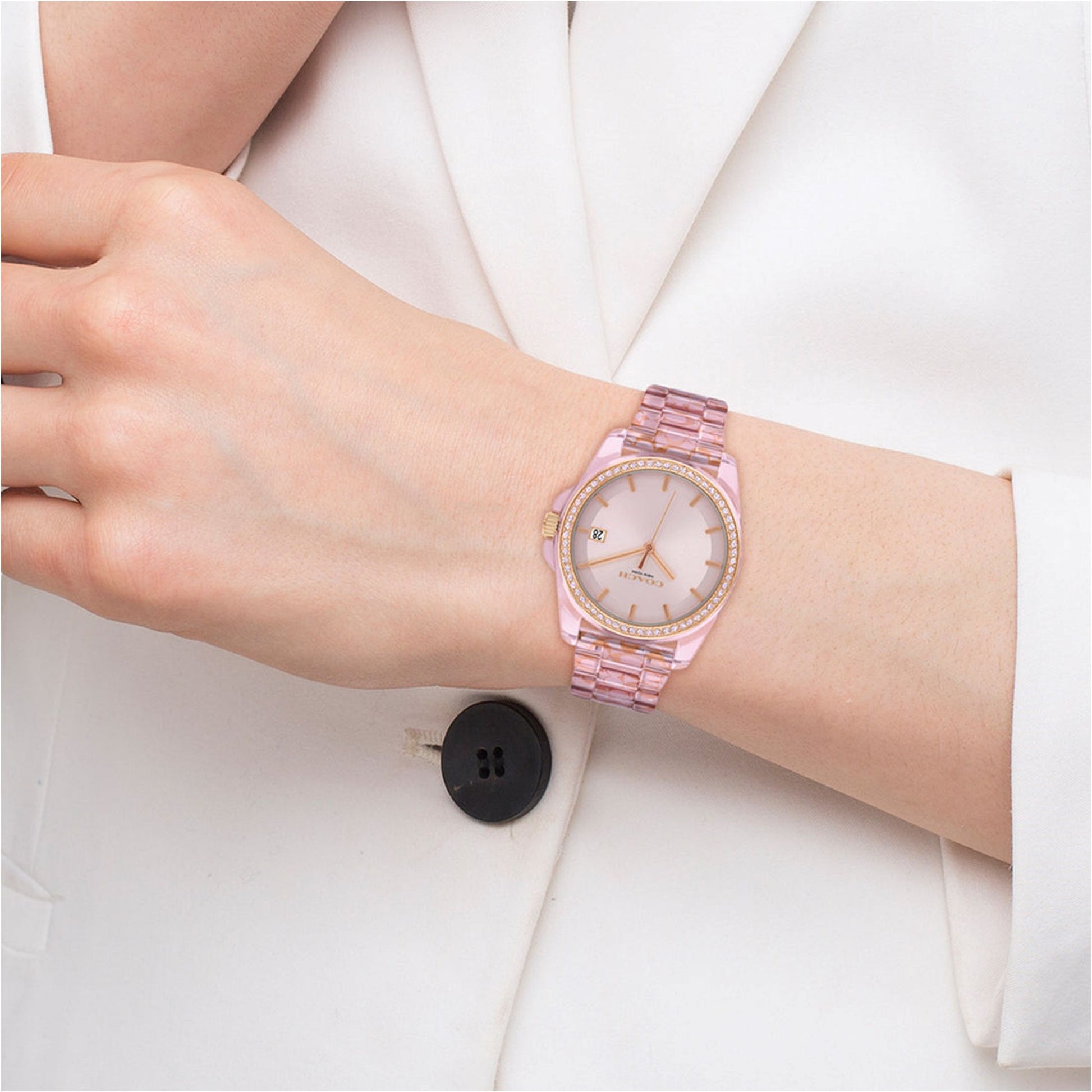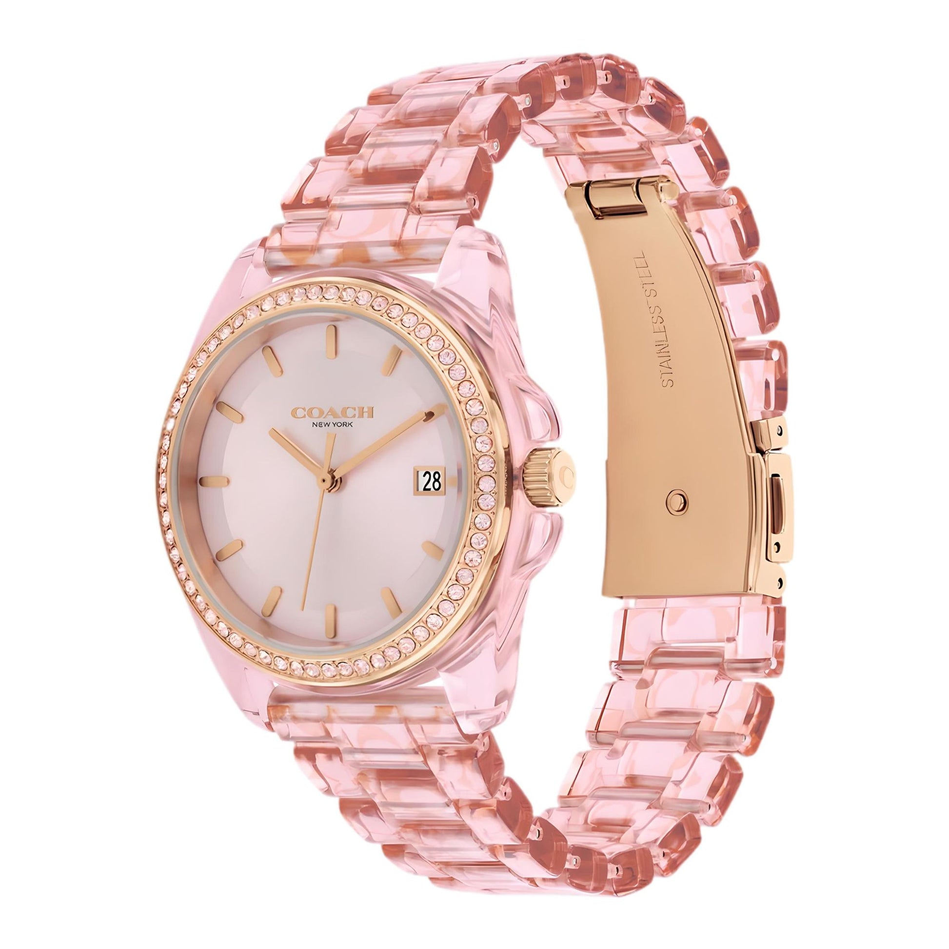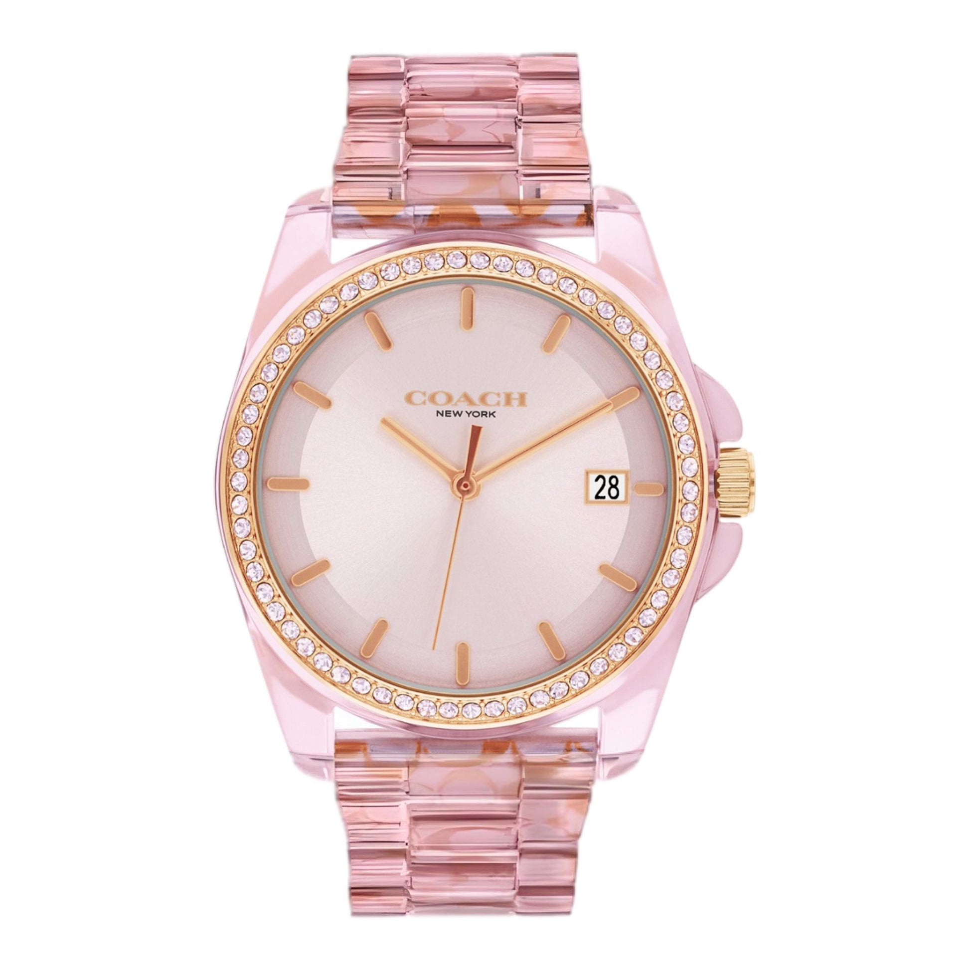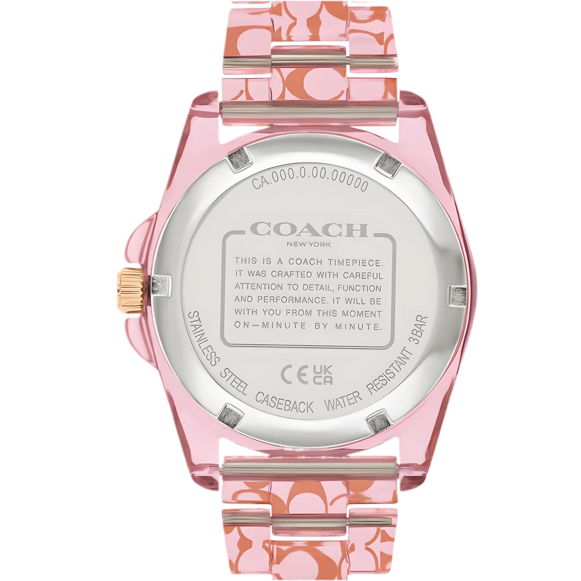 Discover the Coach Greyson women watch, a perfect blend of casual and formal style. This 30m water-resistant timepiece boasts a durable resin case and band, ensuring comfort and longevity. With a quartz movement offering approximately two years of battery life, it includes a date display and a sleek 36mm diameter, making it an ideal accessory for any occasion.