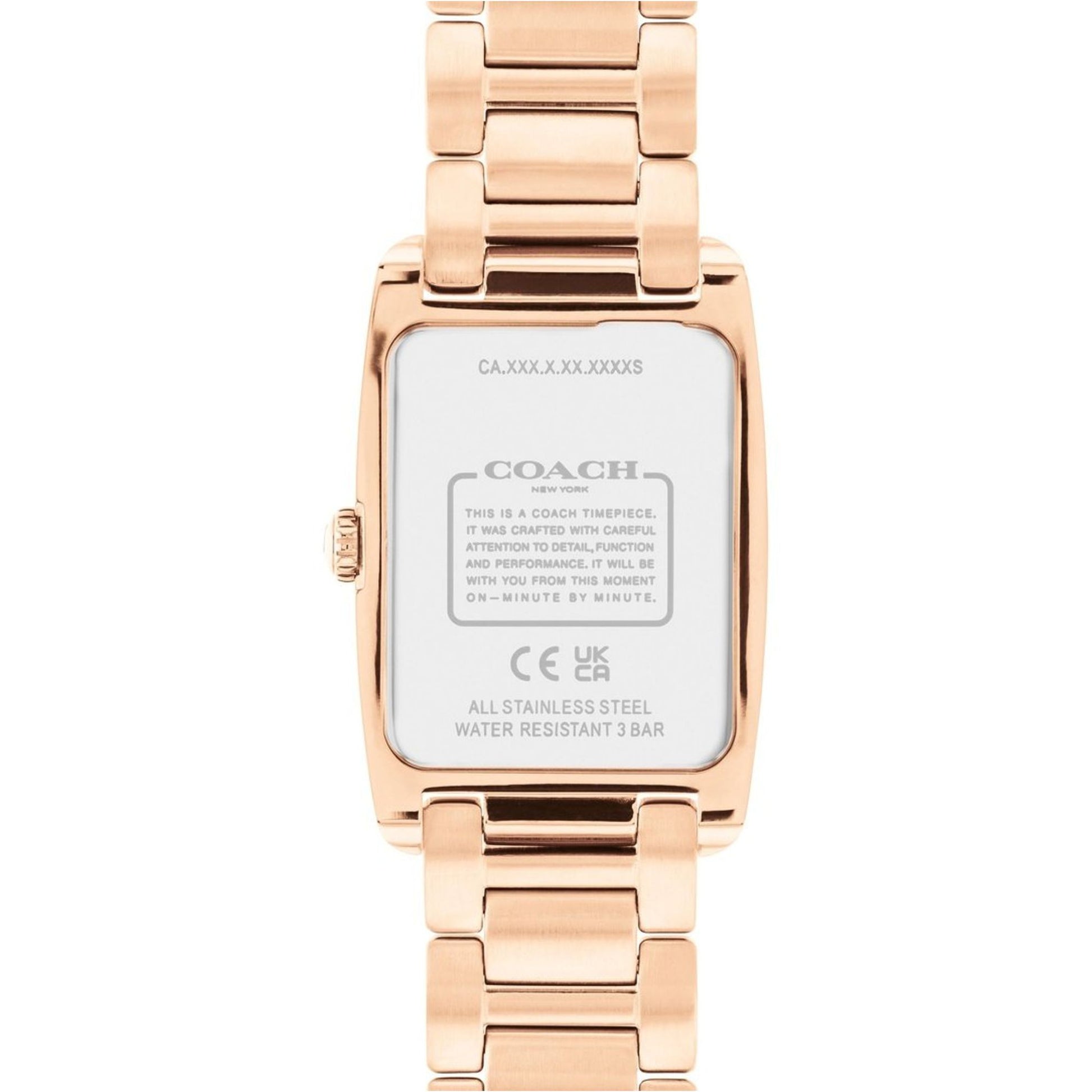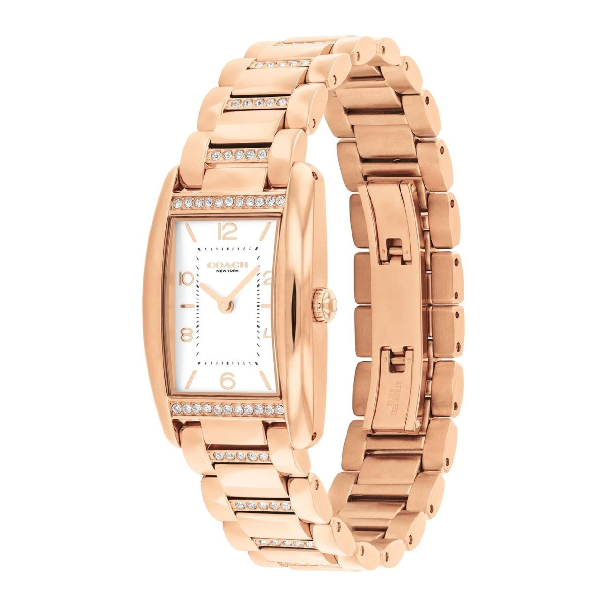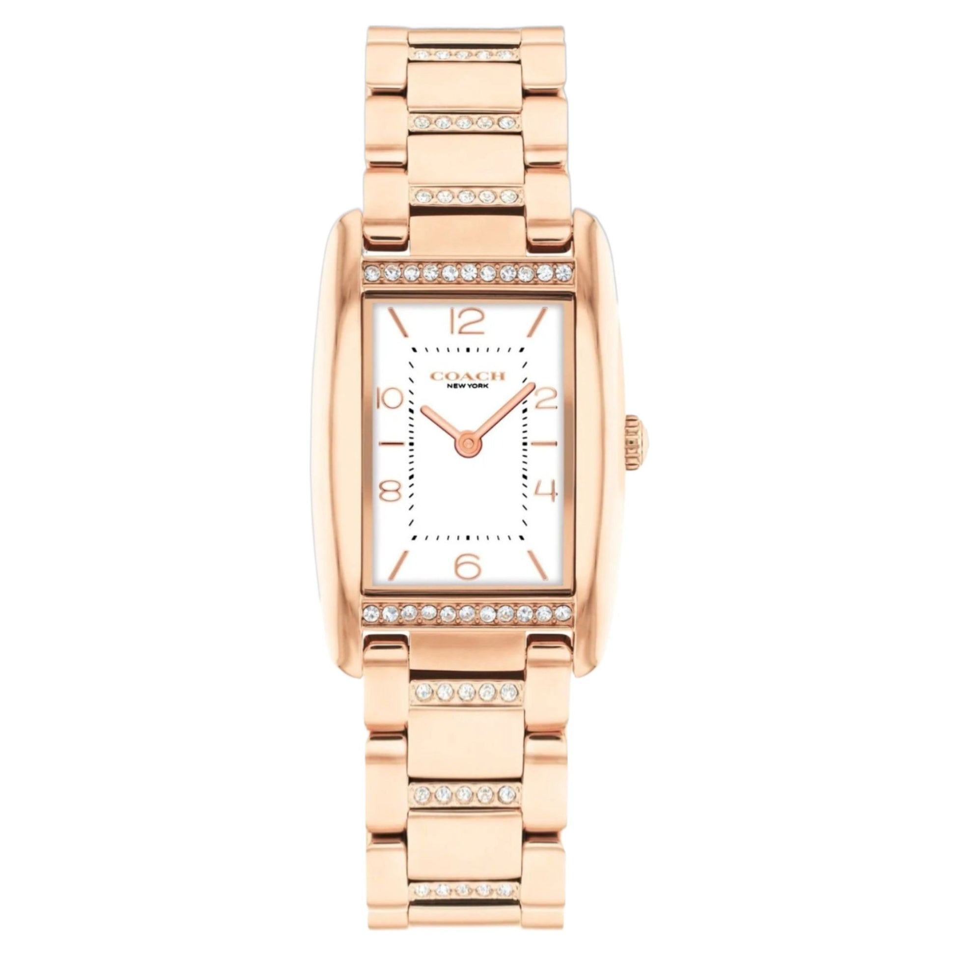 The Reese watch showcases a unique stately design perfect for daily wear. Adorned with crystals, the bracelet features a sleek satin dial with a blend of numerical and stick markers. The iconic Coach Signature on the clasp adds a touch of heritage, making it a stylish accessory for any occasion.