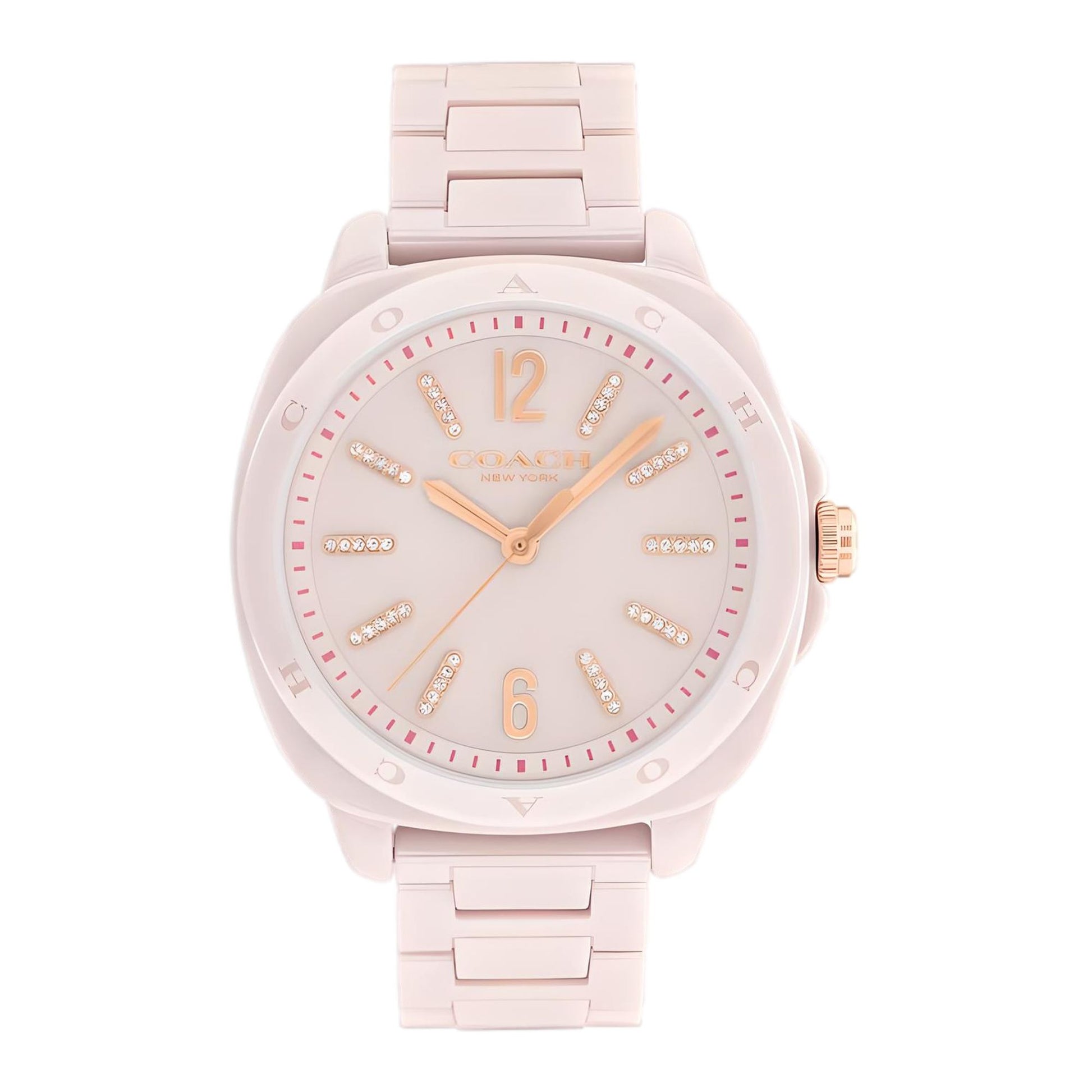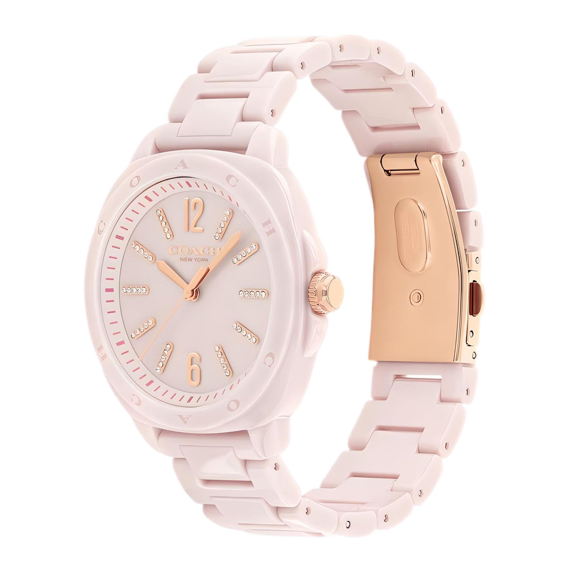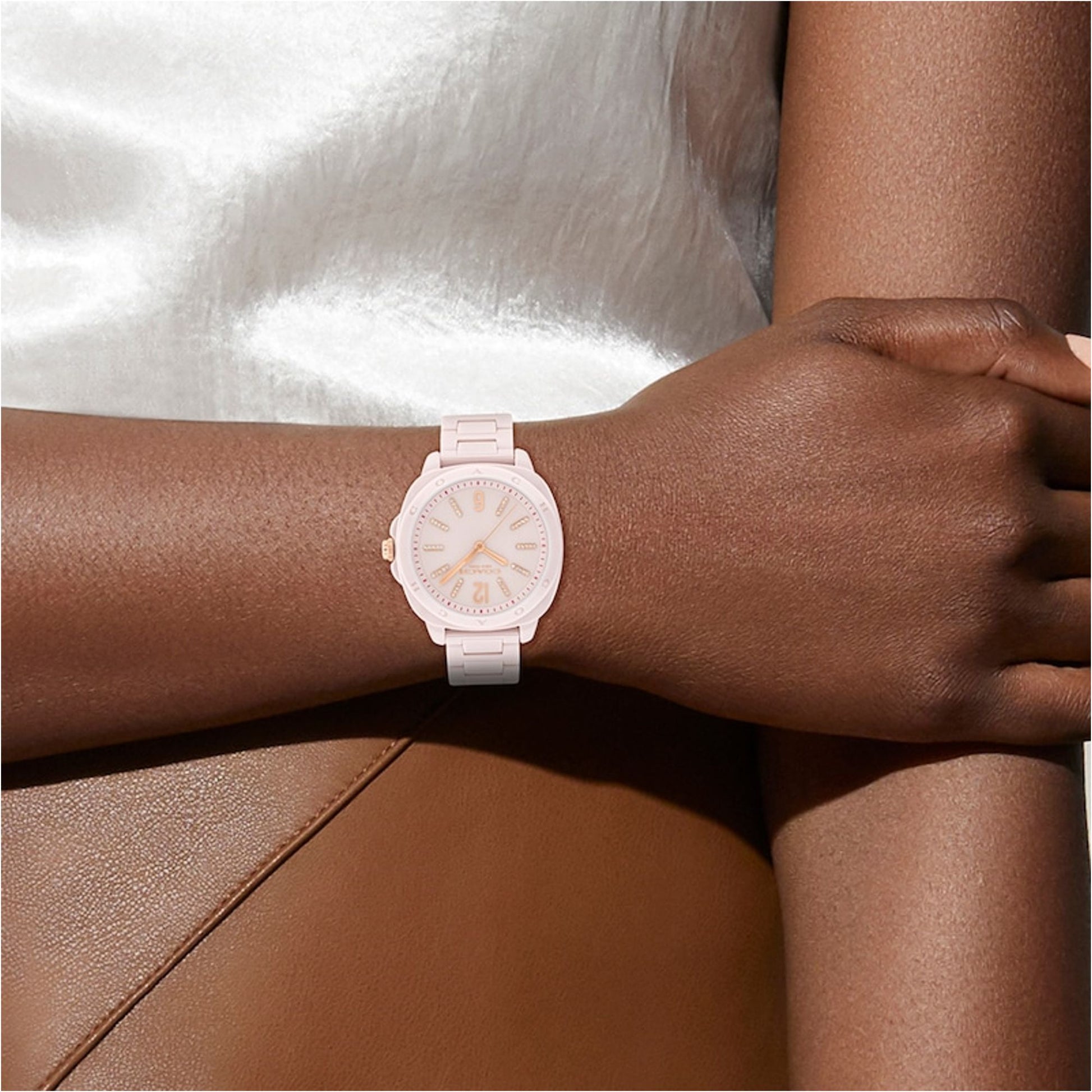 The Kitt watch embodies contemporary design, seamlessly transitioning from professional settings to casual outings. Its elegant blush ceramic bracelet complements a chic blush lacquer dial, adorned with a blend of numerical and ombre crystal markers, adding a hint of sparkle to any outfit. Perfect for those who appreciate style and versatility.