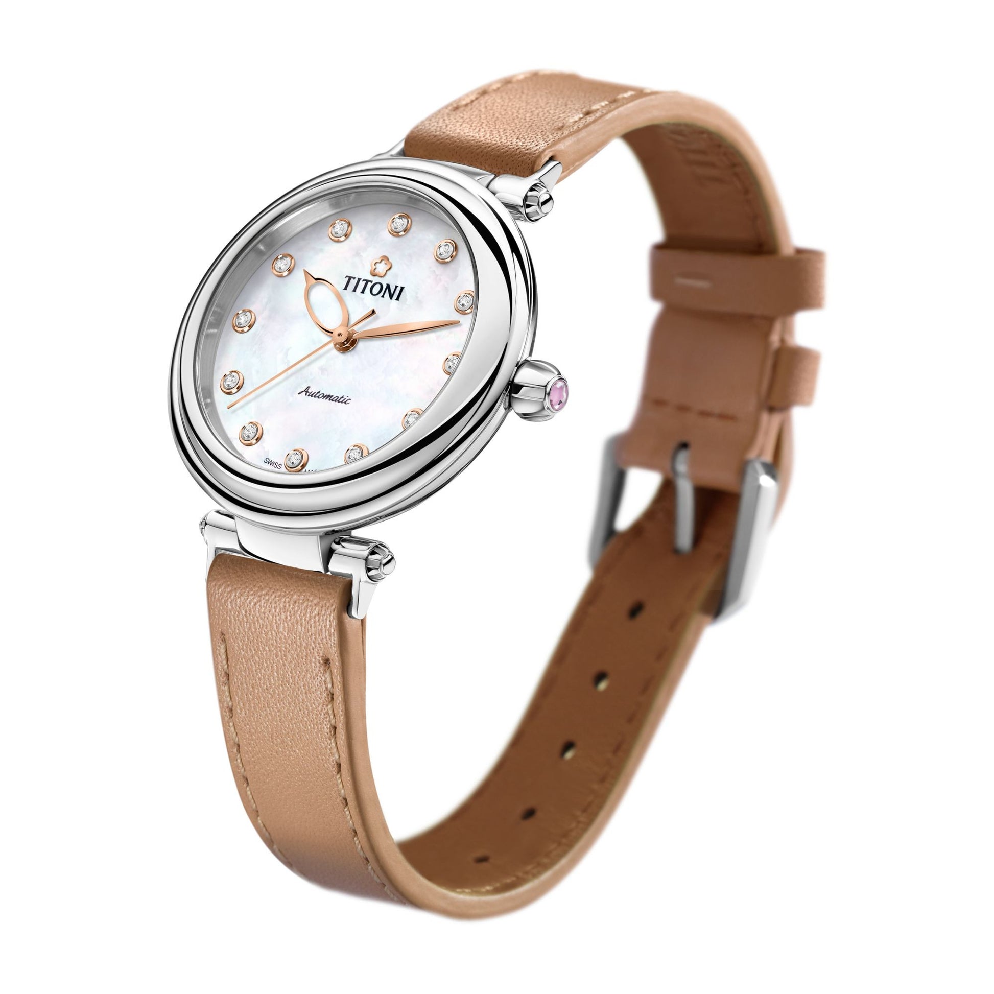 Discover the Titoni Miss Lovely 23978 series, a ladies automatic watch blending elegant Swiss craftsmanship with playful charm. It features a 33.5mm stainless steel case, a shimmering mother-of-pearl dial with stone markers, and an interchangeable strap system for effortless style changes.