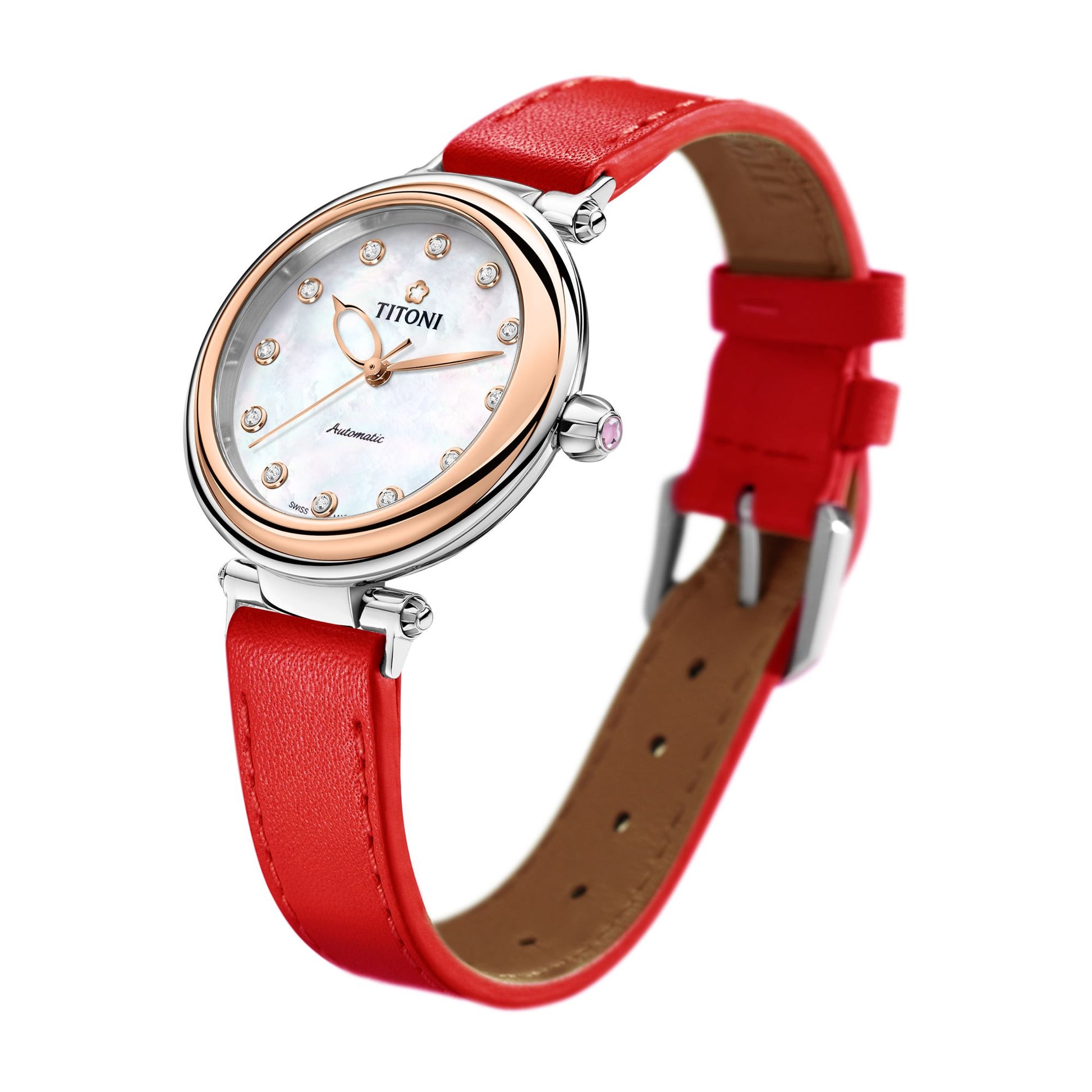 Discover the Titoni Miss Lovely 23978 series, a ladies automatic watch blending elegant Swiss craftsmanship with playful charm. It features a 33.5mm stainless steel case, a shimmering mother-of-pearl dial with stone markers, and an interchangeable strap system for effortless style changes.