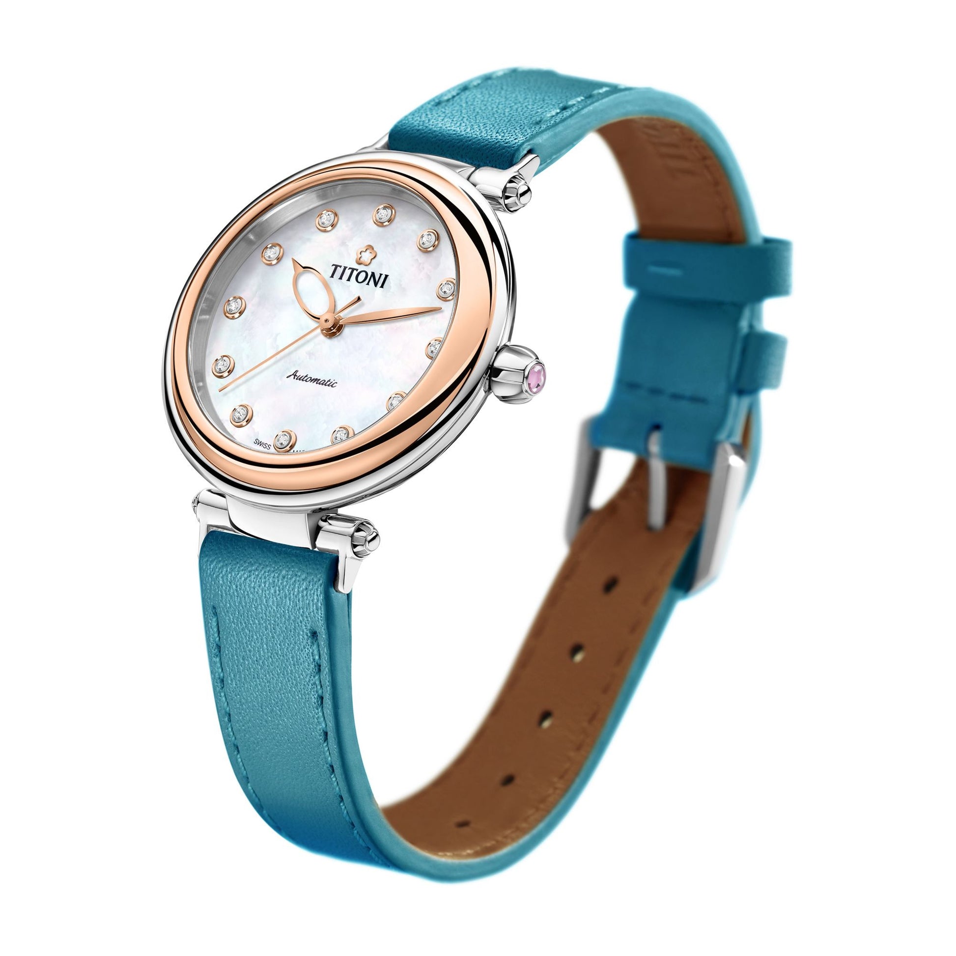Discover the Titoni Miss Lovely 23978 series, a ladies automatic watch blending elegant Swiss craftsmanship with playful charm. It features a 33.5mm stainless steel case, a shimmering mother-of-pearl dial with stone markers, and an interchangeable strap system for effortless style changes.