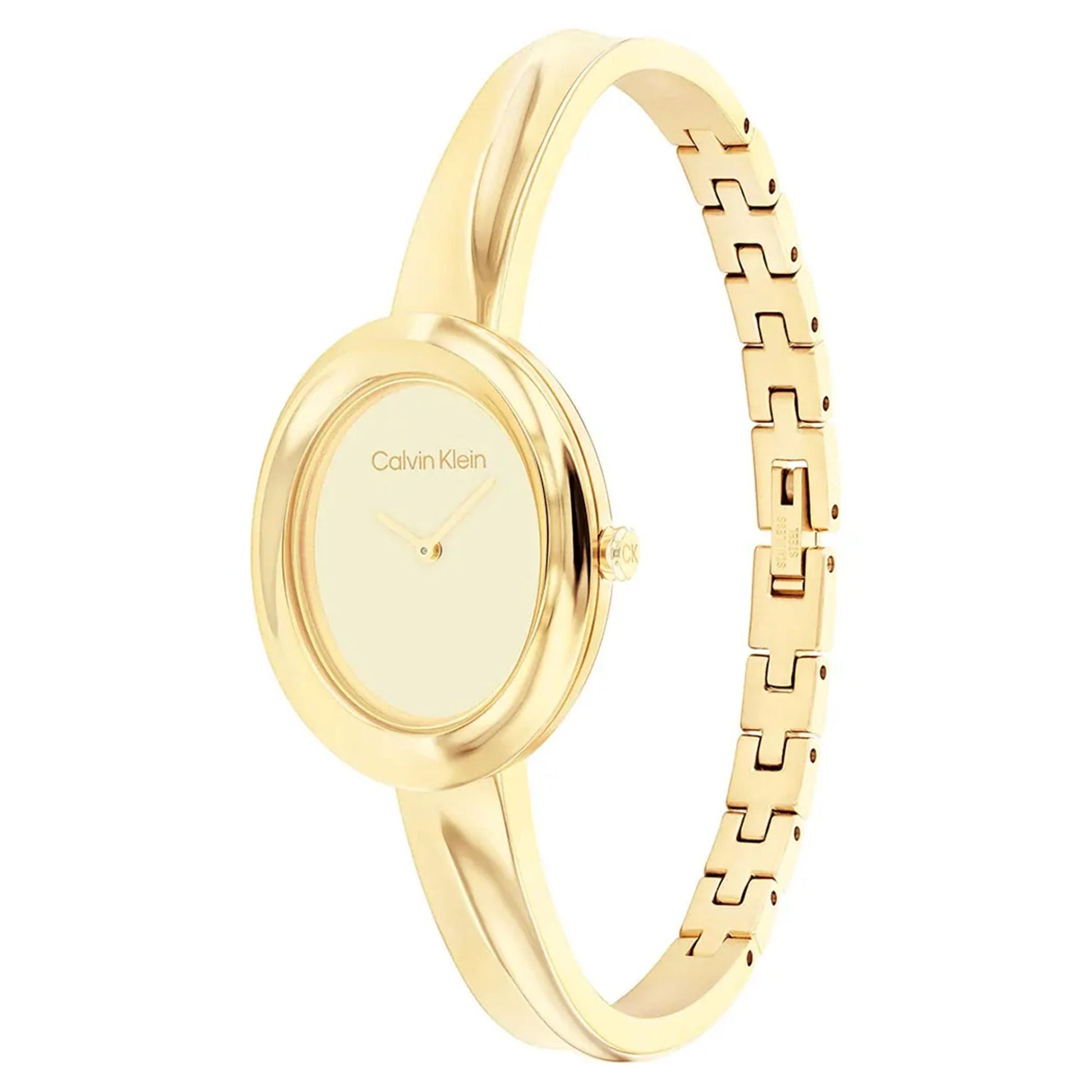 Discover the Calvin Klein Twisted Bezel watch, featuring a distinctive 26mm stainless steel case and bangle with a unique twisted design. This elegant women timepiece combines a radiant pearlized dial with reliable quartz movement and 30m water resistance for versatile everyday wear.