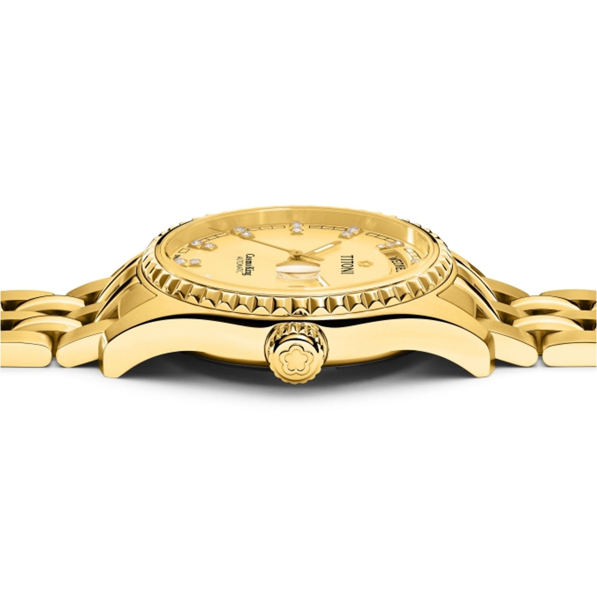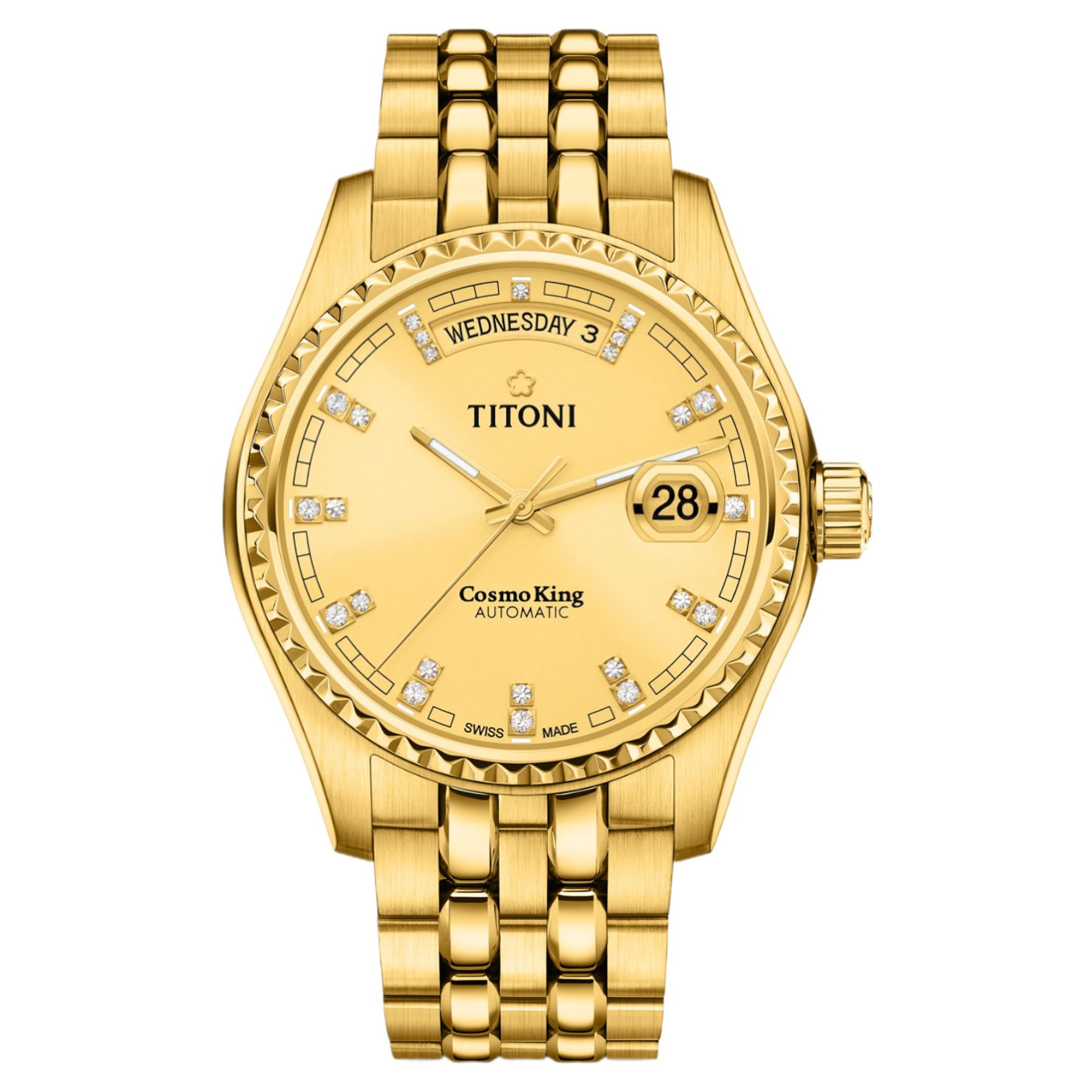 Elevate your style with the Titoni Cosmo, featuring a fluted bezel, Roman numeral dial, and cyclops date magnifier. The stainless steel King Bracelet combines brushed and polished links for exceptional comfort. With its globe-engraved case back and day-date display, this watch embodies refined European elegance for special occasions.