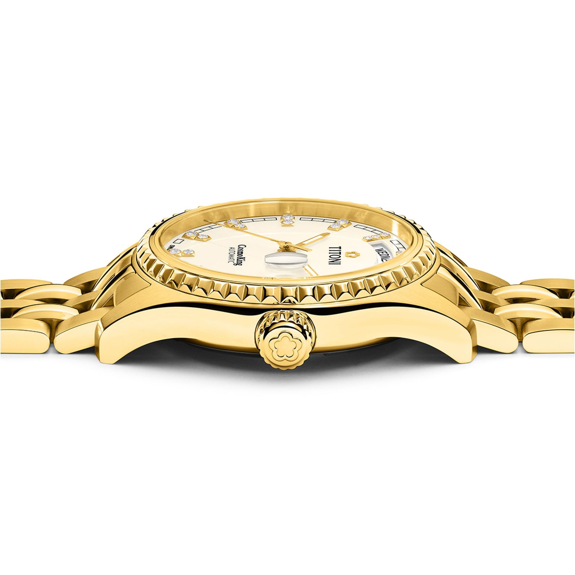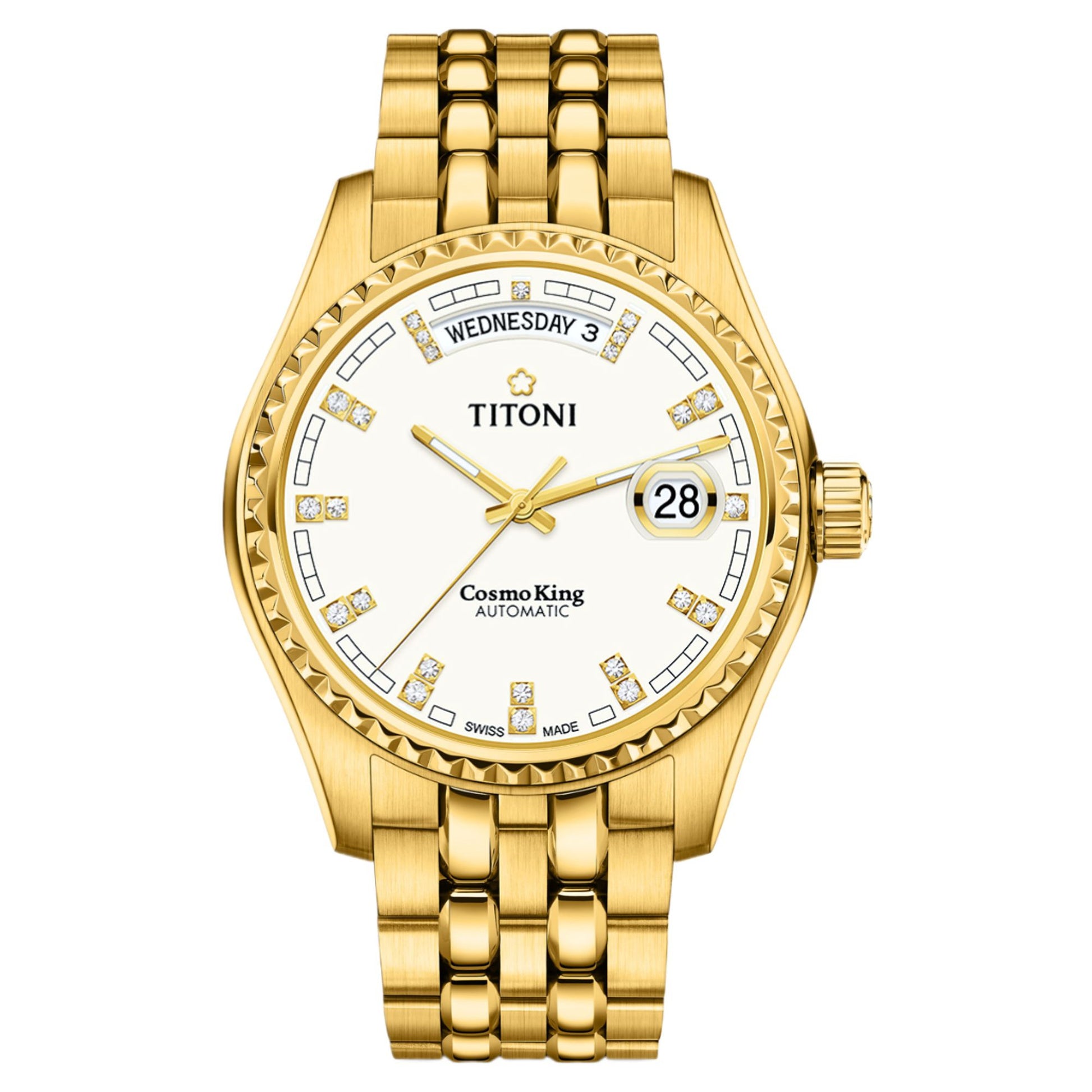 Elevate your style with the Titoni Cosmo, featuring a fluted bezel, Roman numeral dial, and cyclops date magnifier. The stainless steel King Bracelet combines brushed and polished links for exceptional comfort. With its globe-engraved case back and day-date display, this watch embodies refined European elegance for special occasions.