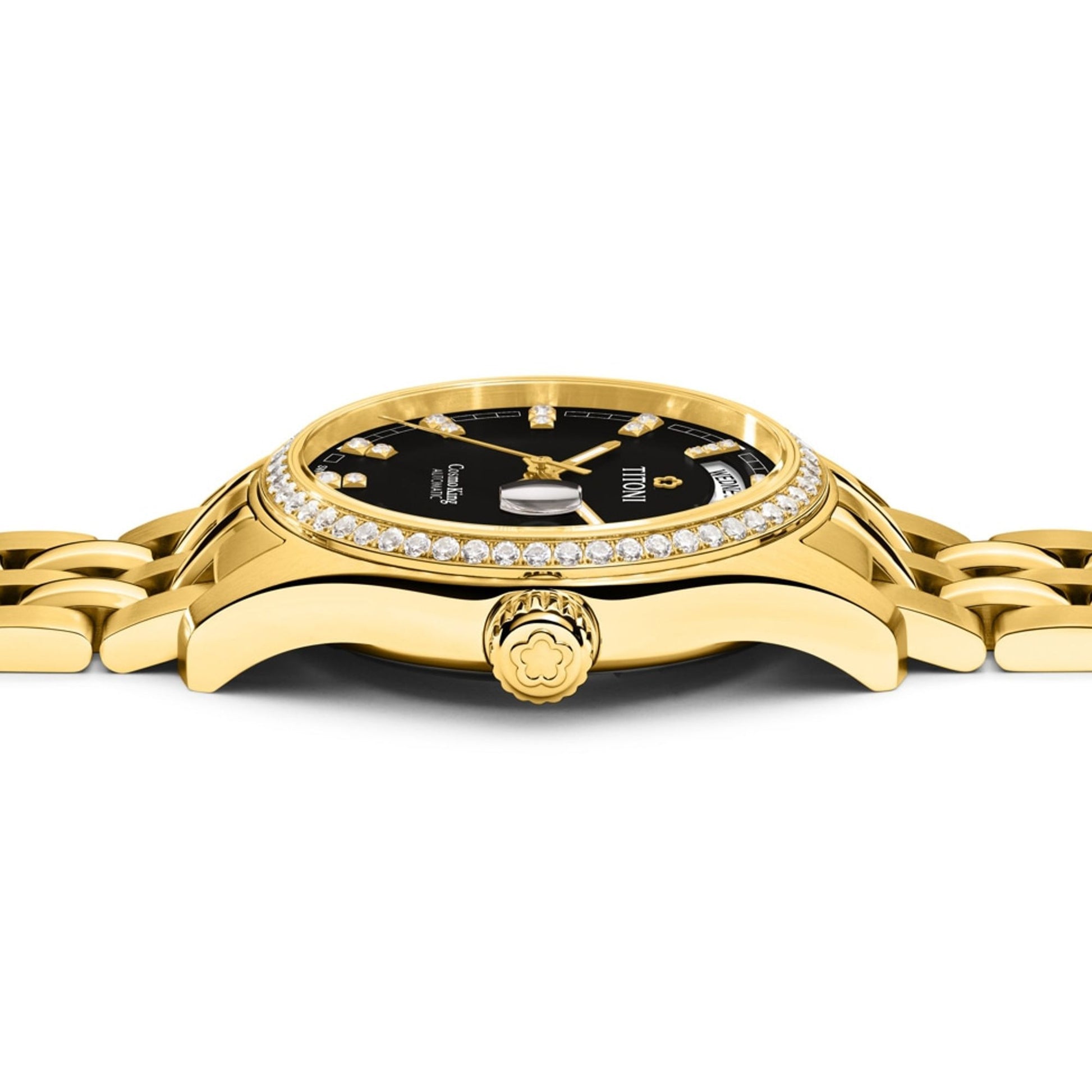 Elevate your style with the Titoni Cosmo, featuring a fluted bezel, Roman numeral dial, and cyclops date magnifier. The stainless steel King Bracelet combines brushed and polished links for exceptional comfort. With its globe-engraved case back and day-date display, this watch embodies refined European elegance for special occasions.