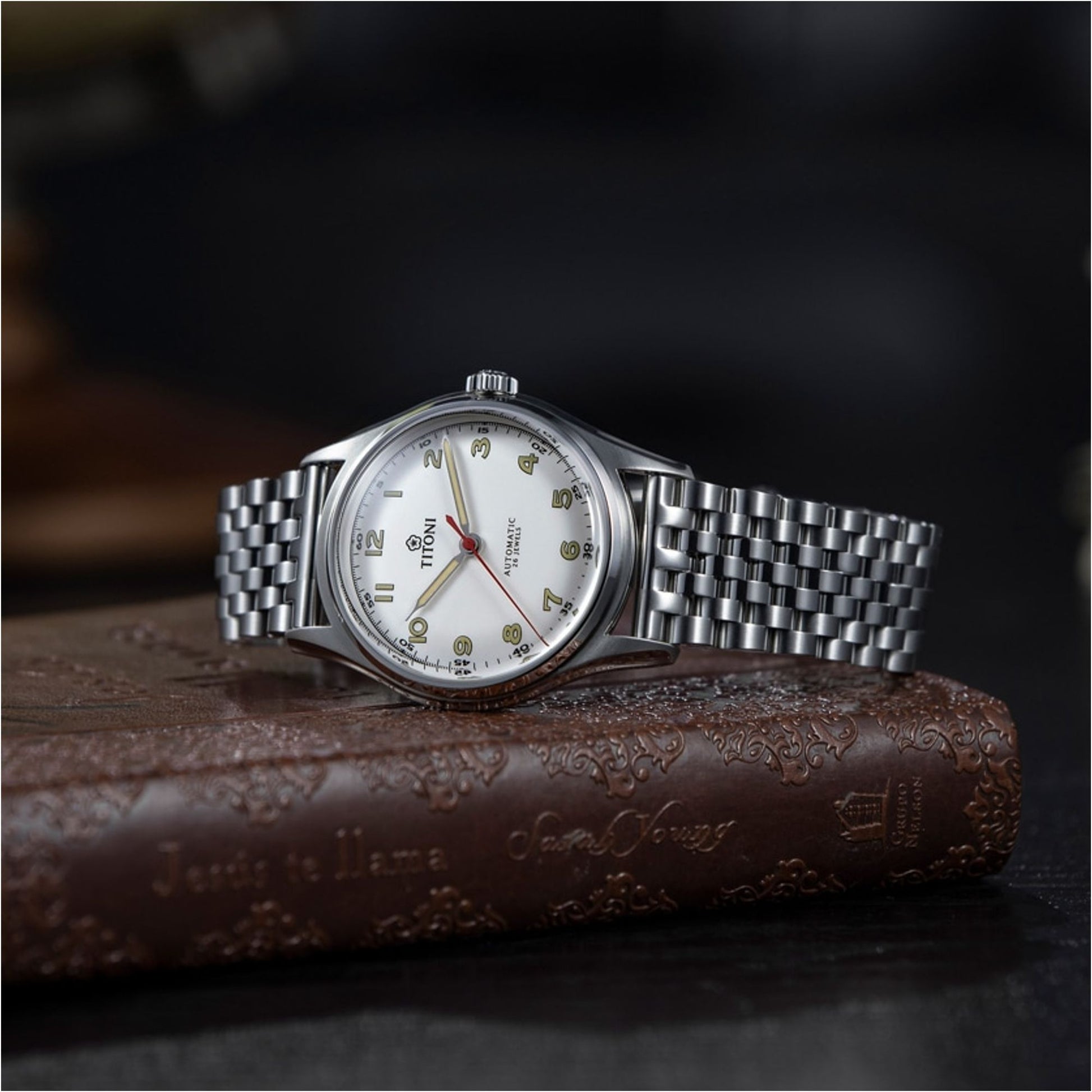 Channel 1950s nostalgia with the Titoni Retro watch, featuring Super-LumiNova-filled numerals, a domed crystal, and vintage-inspired typography. The red seconds hand and curved dial enhance its post-war charm, while the engraved car logo case back pays homage to automotive history. Swiss-made heritage meets timeless retro elegance.