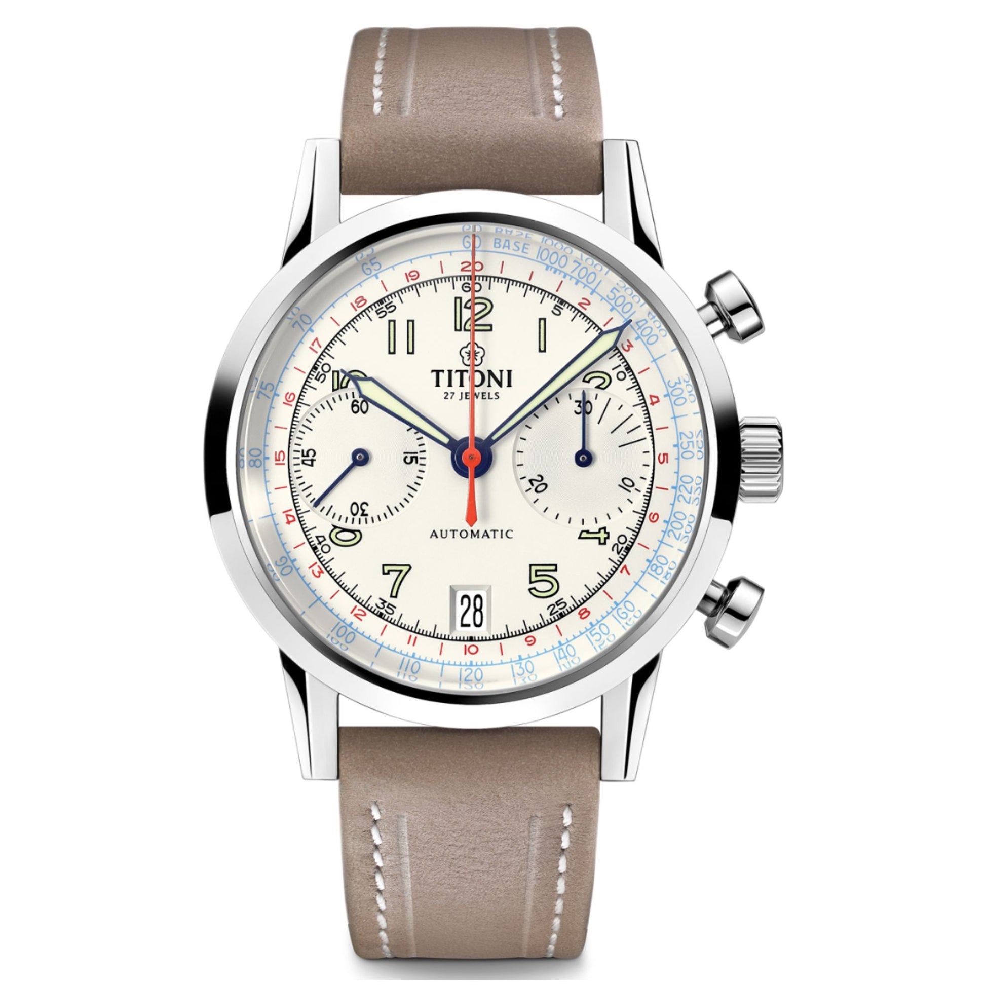 Experience vintage horology with the Titoni Chronograph, a faithful tribute to 1950s Felca watches. Featuring Cathedral-style hands, Old Radium Super-LumiNova, and domed sapphire crystal. This multifunction timepiece includes a chronograph, tachymeter, and exhibition case back showcasing the intricate movement. Swiss craftsmanship meets retro charm.