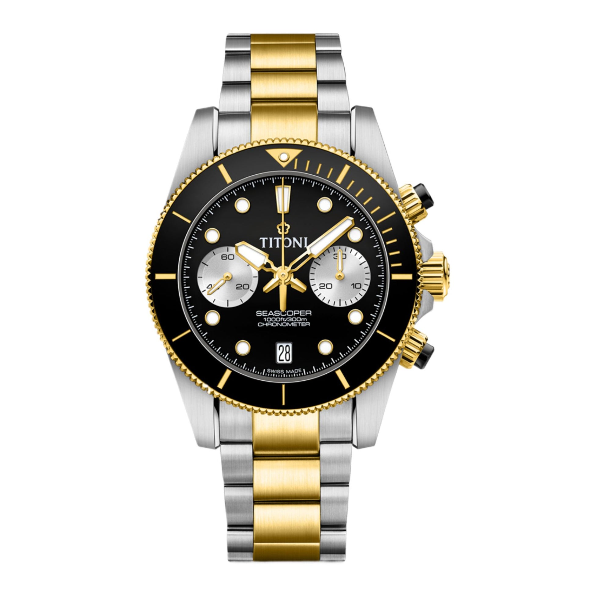 Discover the Titoni Seascoper 300 Bi-Compax Chronograph, a robust dive watch blending retro design with modern functionality. Featuring a unidirectional ceramic bezel, screw-down pushers, and a sophisticated diver extension clasp for perfect fit. With 300m water resistance and a unique porthole-inspired case back. Built for adventure.