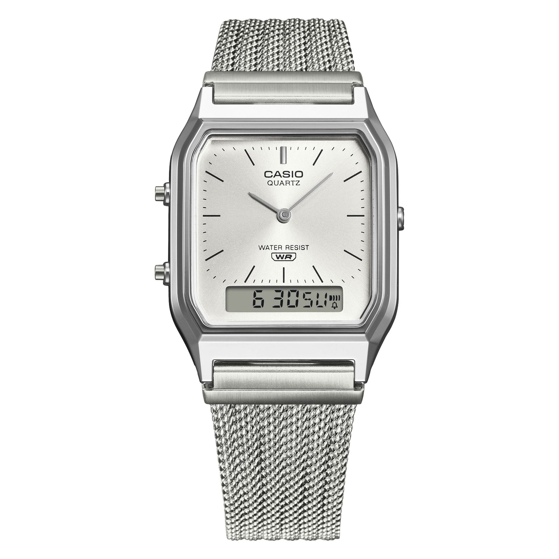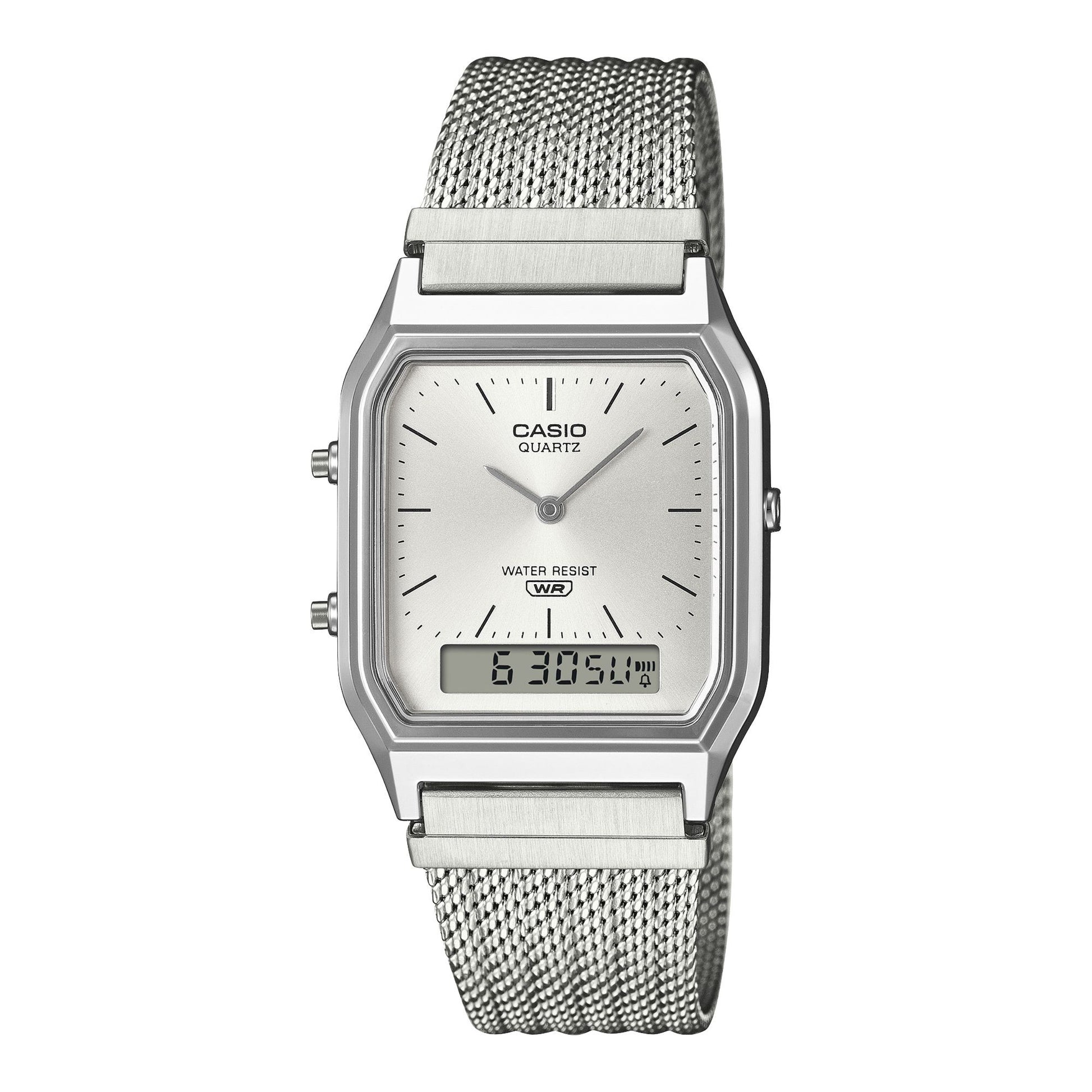 Discover the Casio AQ-230EM series, blending a unique analog-digital display with modern metal mesh bracelets for a versatile, retro-inspired look. These slim hybrid watches offer dual time zones, a stopwatch, and practical features in a classic, compact design.