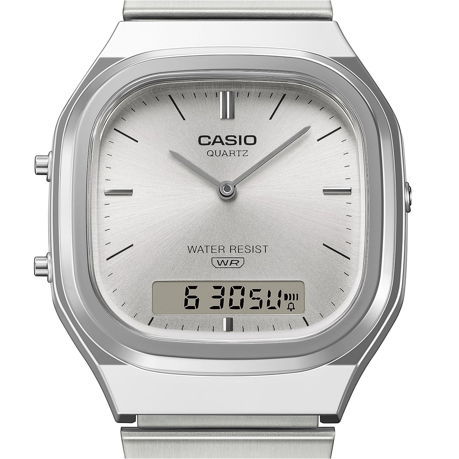 Discover the Casio AQ-240E retro-modern watch, featuring a refined squarish case with rounded curves and sun-ray dial finish. This analog-digital timepiece blends metallic vintage indexes with a highly readable LCD display for sophisticated, functional style.