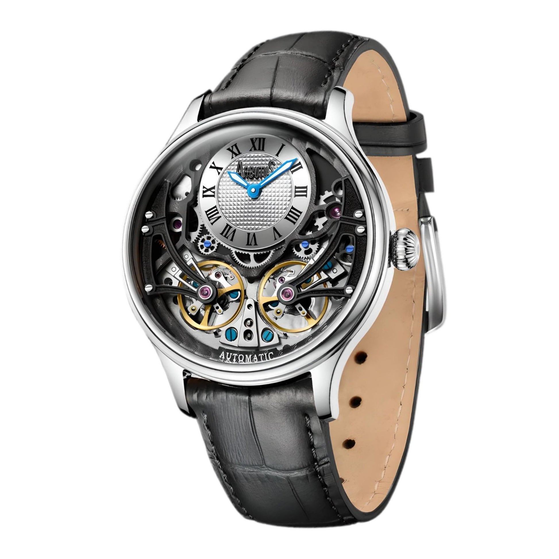 Experience the Arbutus watch, showcasing a dual balance wheel design for enhanced mechanical sophistication. Its concaved bezel maximizes the lens opening, highlighting the exquisite dial and movement while maintaining a sleek look. Paired with genuine leather straps, this classic timepiece offers a comfortable fit that evolves beautifully with your wrist.