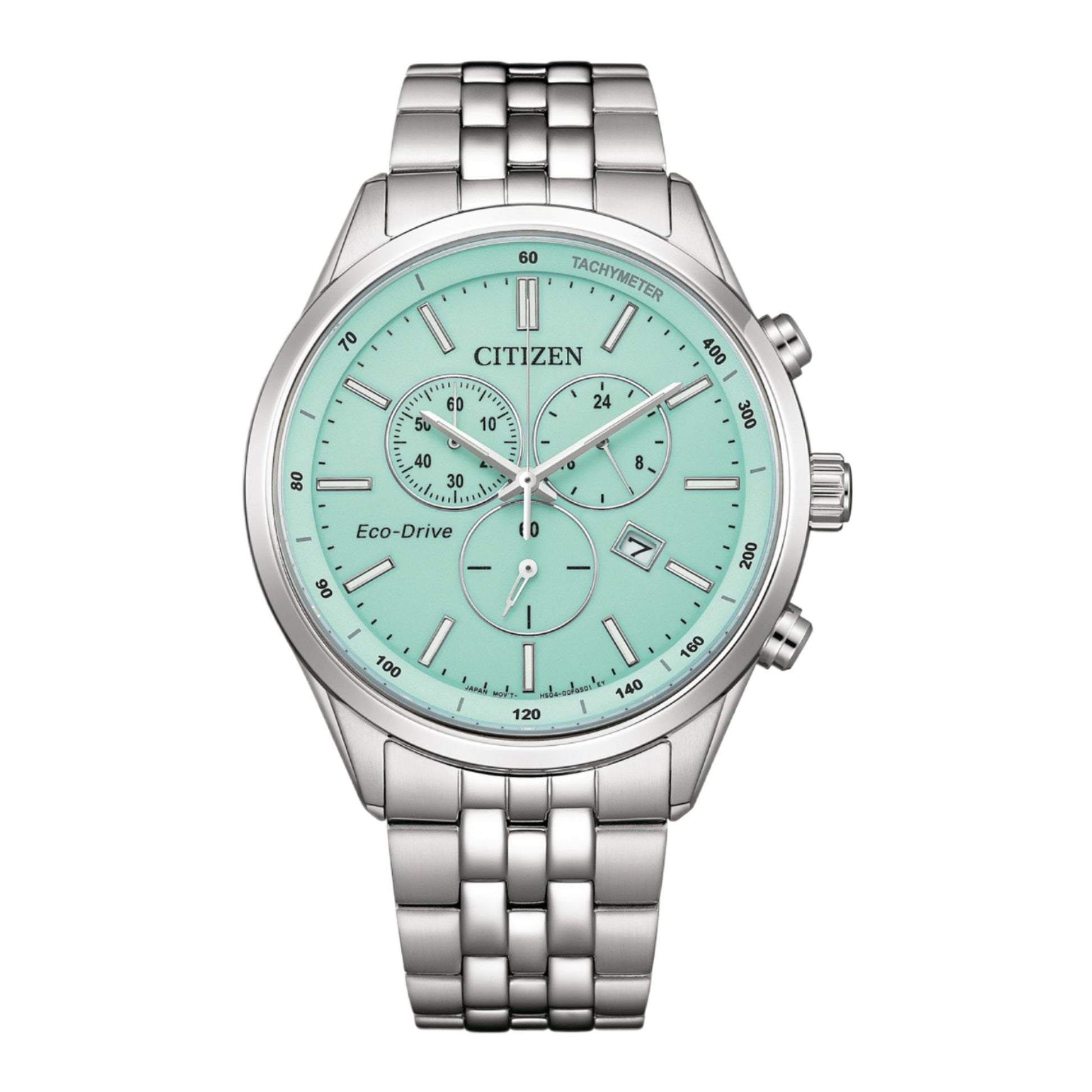 Discover the Citizen AT2570-56M men watch, featuring a sophisticated stainless steel case and bracelet with a striking turquoise dial. Powered by advanced Eco-Drive technology that converts light into energy, this chronograph timepiece offers precise timekeeping, 100-meter water resistance, and a scratch-resistant sapphire crystal for lasting elegance and durability.