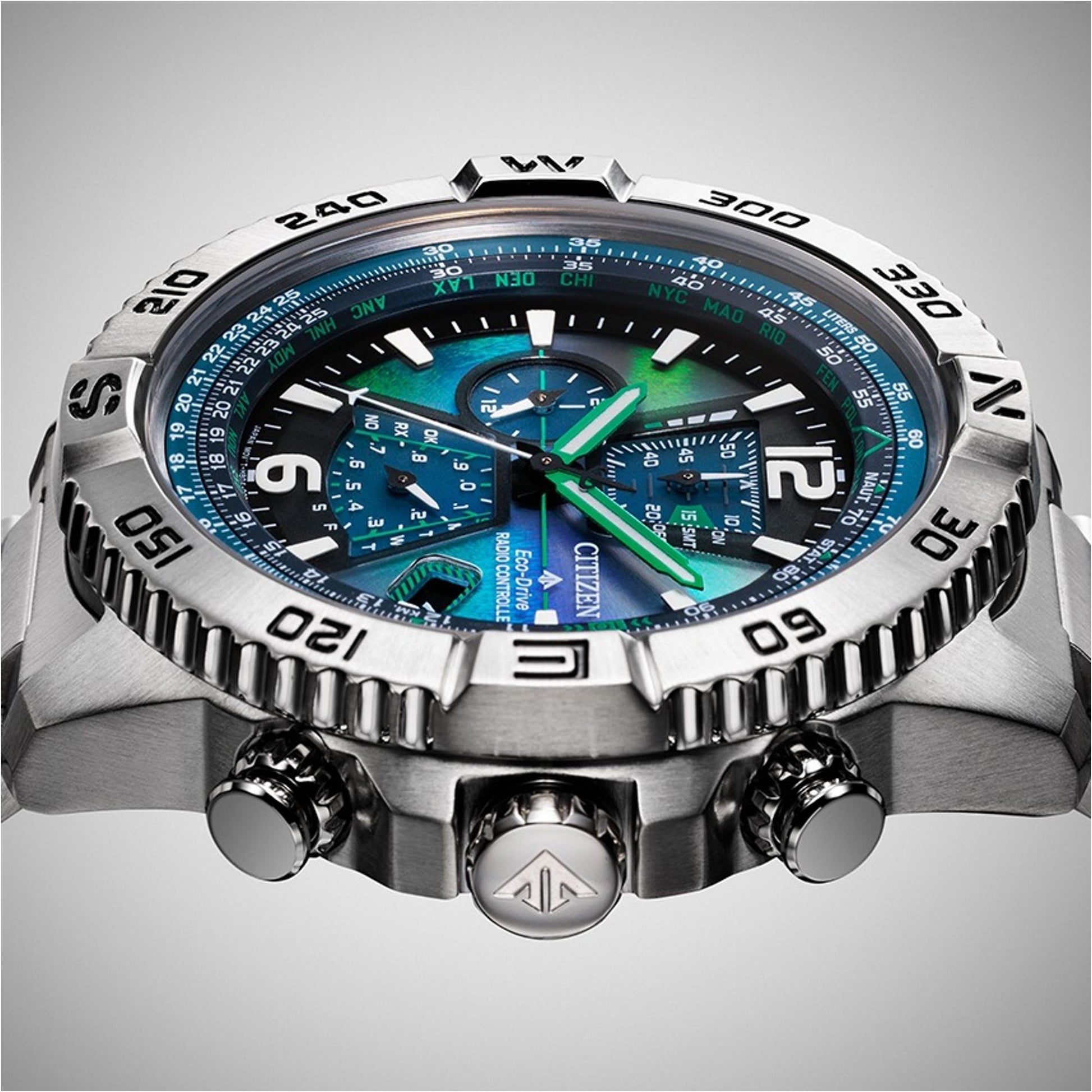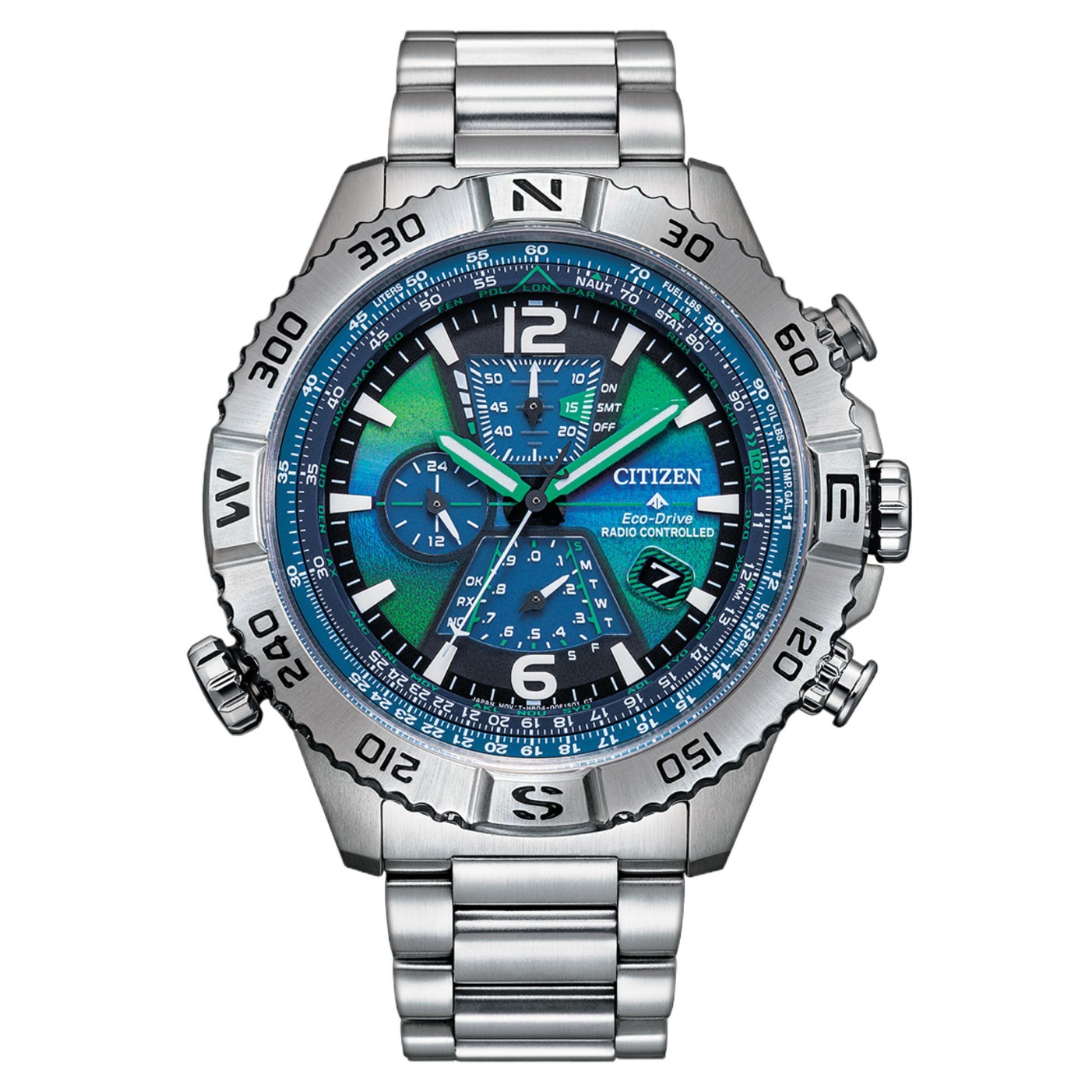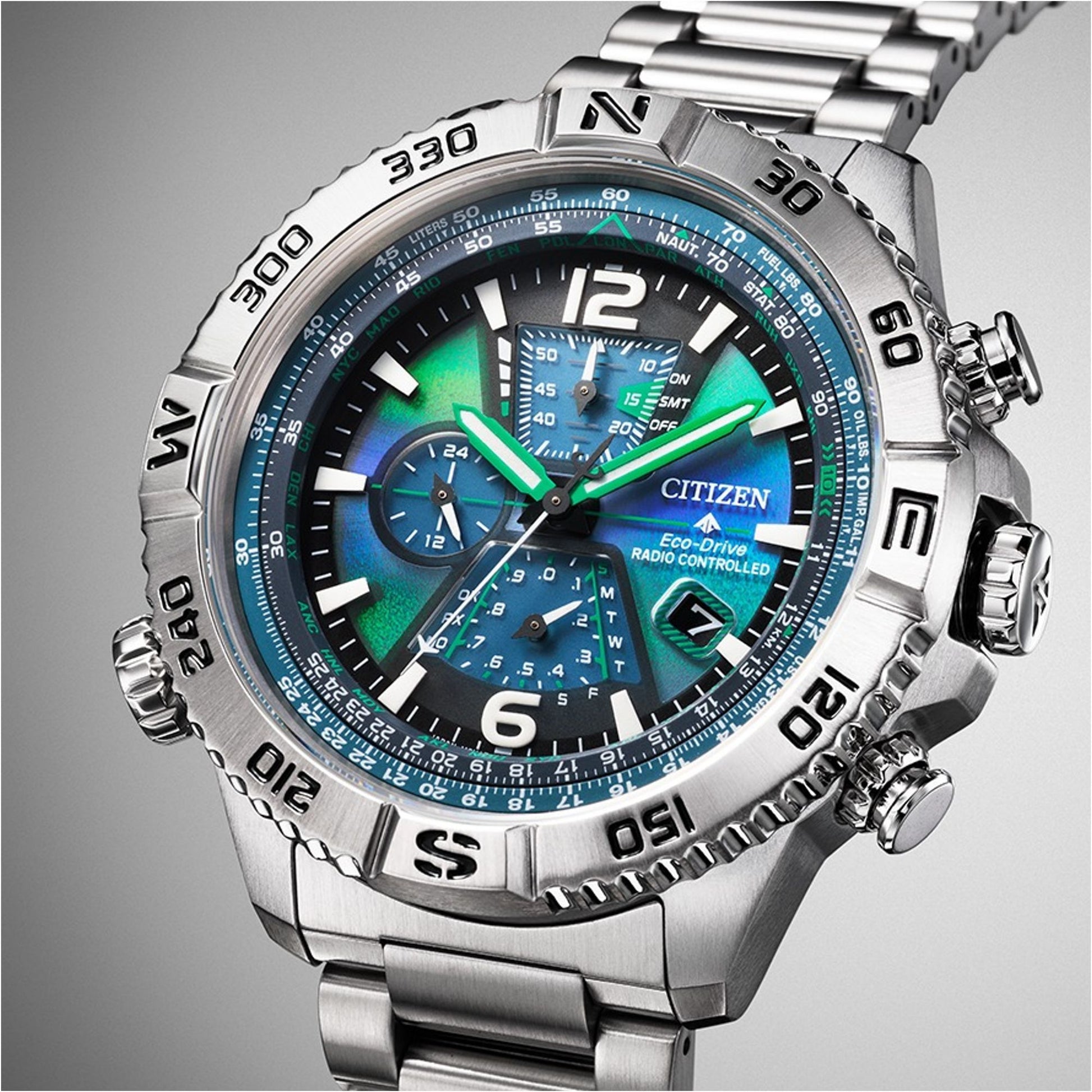 Experience the northern lights on your wrist with the limited edition Citizen Promaster Navihawk AT8220-55W. This aviation-inspired watch features a unique, color-shifting blue-green dial, solar-powered Eco-Drive movement, and radio-controlled atomic timekeeping for ultimate accuracy across 26 time zones.