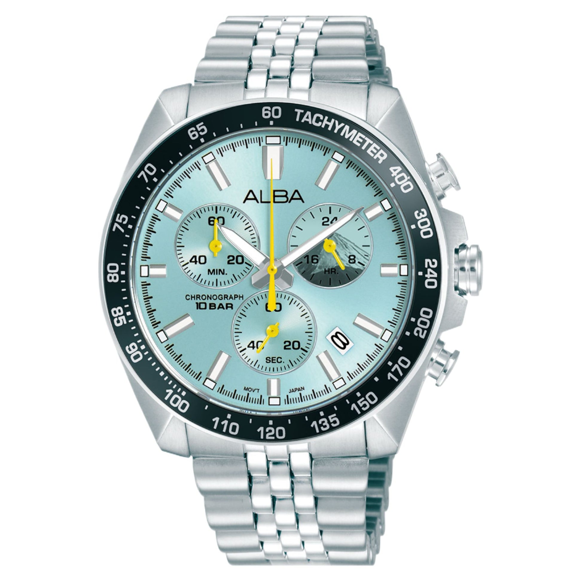 Discover the Alba (from Seiko) Signa chronograph watch, featuring a robust 43mm stainless steel case, a striking dial with sub-dials, and a durable bracelet. Powered by a VK68 quartz movement with a stopwatch function and 100m water resistance.