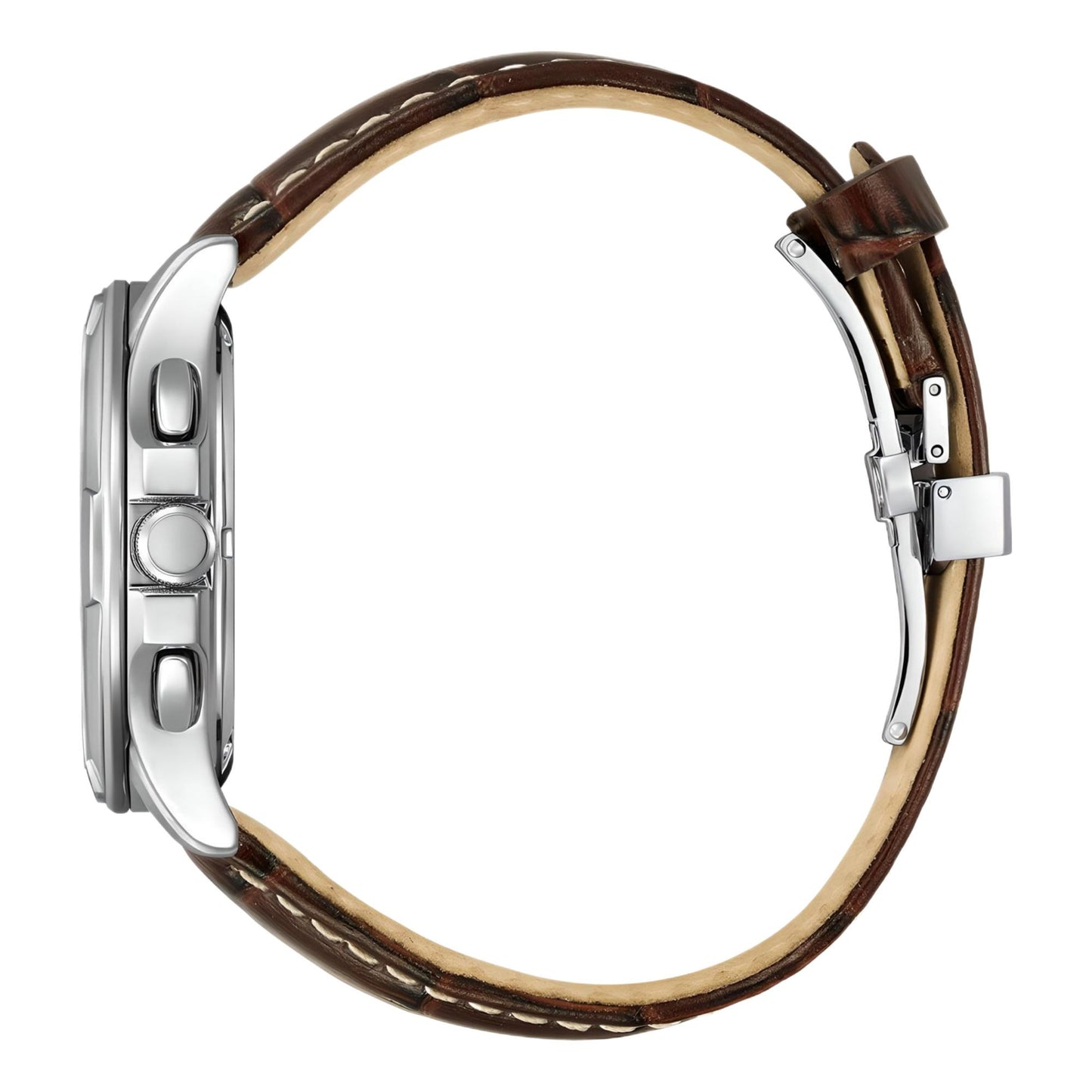 Stainless steel case with leather band (deployment clasp with push-button release)
