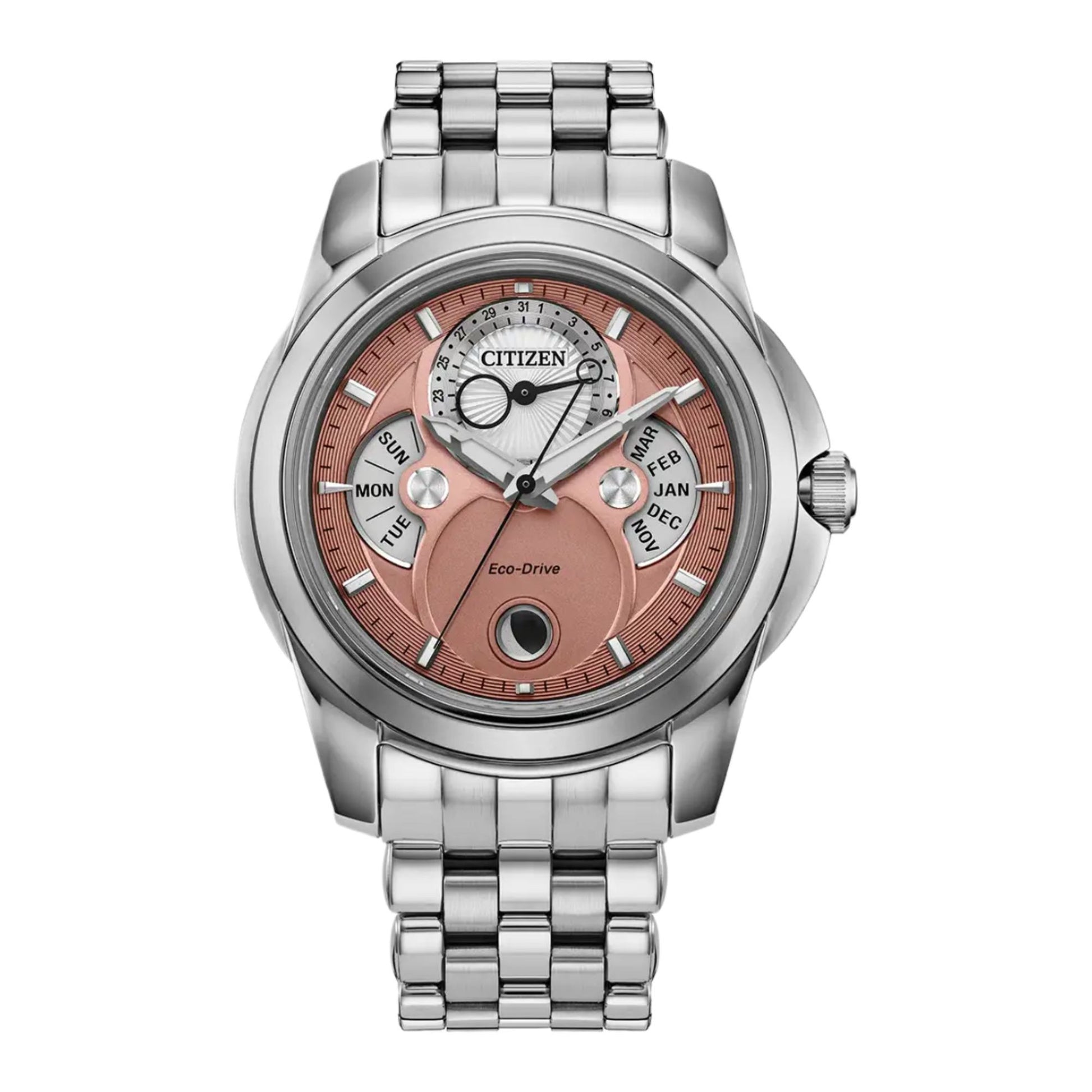 Elevate your style with the Calendrier Moon Phase watch, blending sophistication with modern functionality. This 42mm stainless steel timepiece features a multi-dimensional dial with month/day/date indicators and moon phase complication. Powered by Citizen Eco-Drive technology and 100m water resistant.