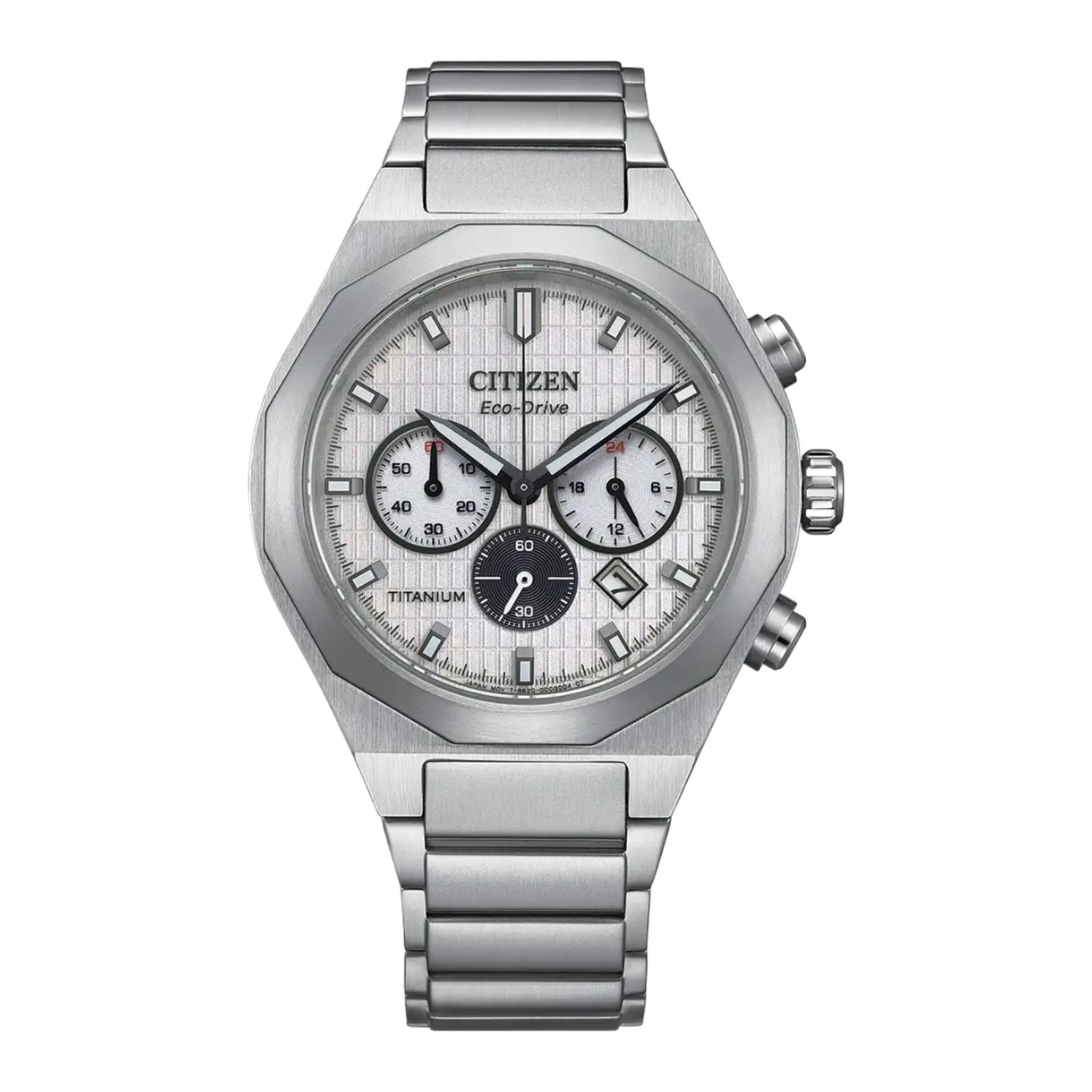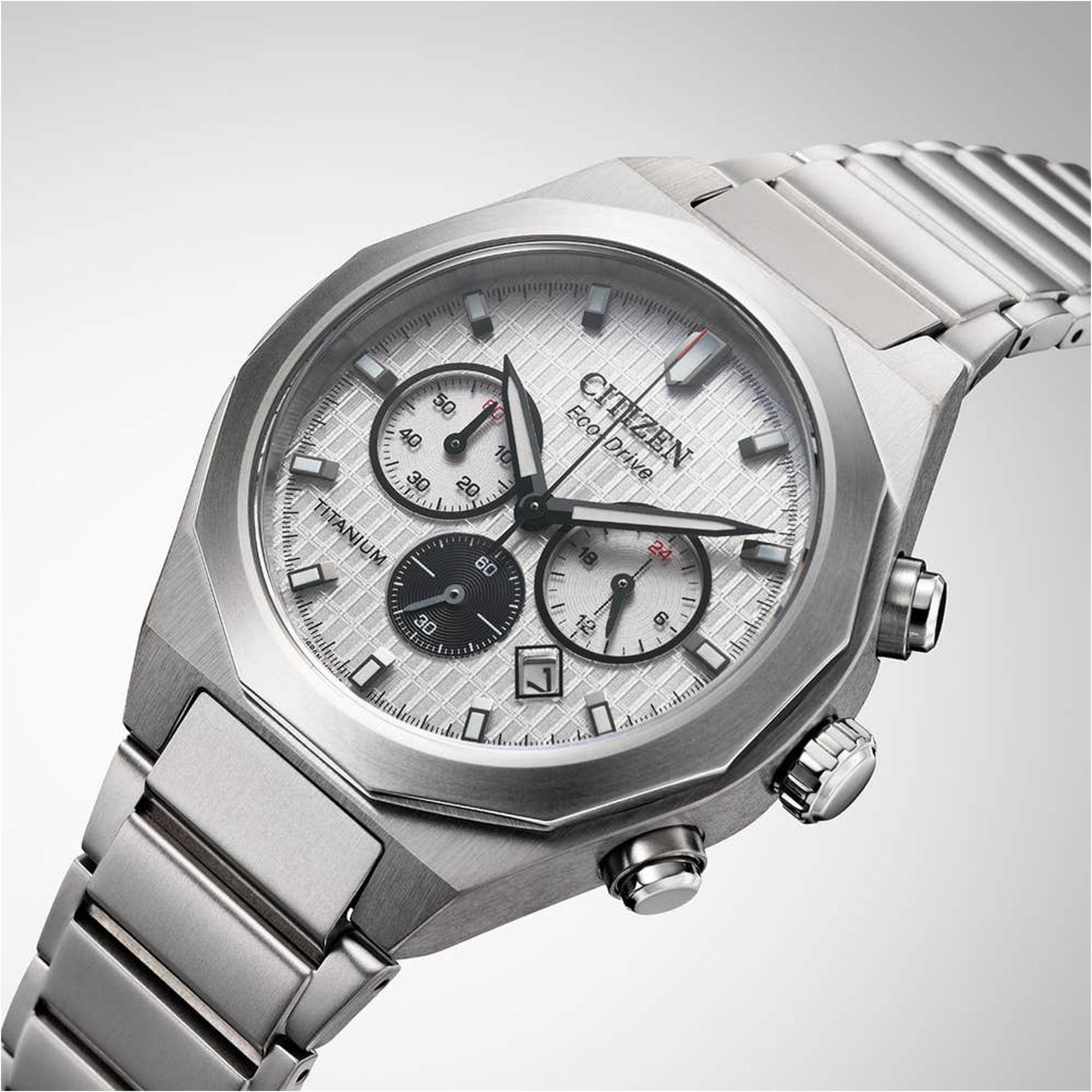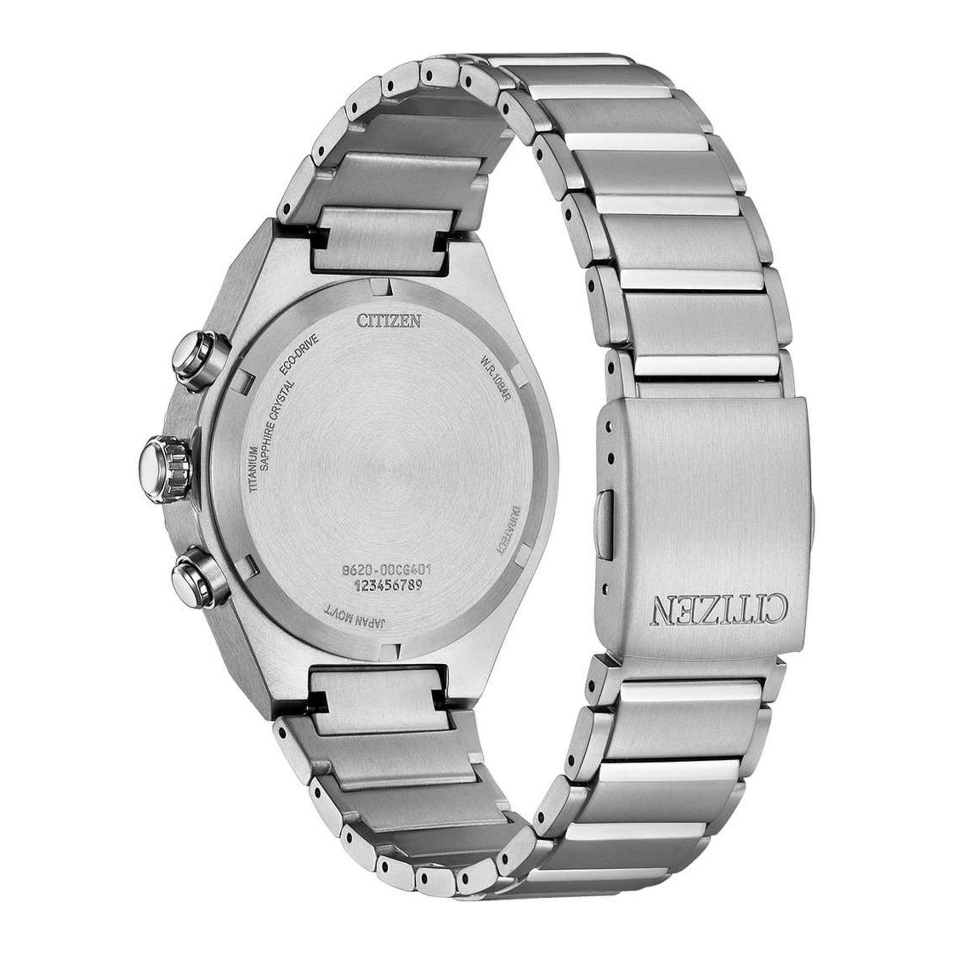 Experience lightweight durability with the Super Titanium Chronograph, crafted from Citizen proprietary Super Titanium (40% lighter, 5x harder than steel). Features a striking textured dial with 3 sub-dials and date window. Powered by Eco-Drive technology - perfect for everyday wear. A perfect blend of strength and style.