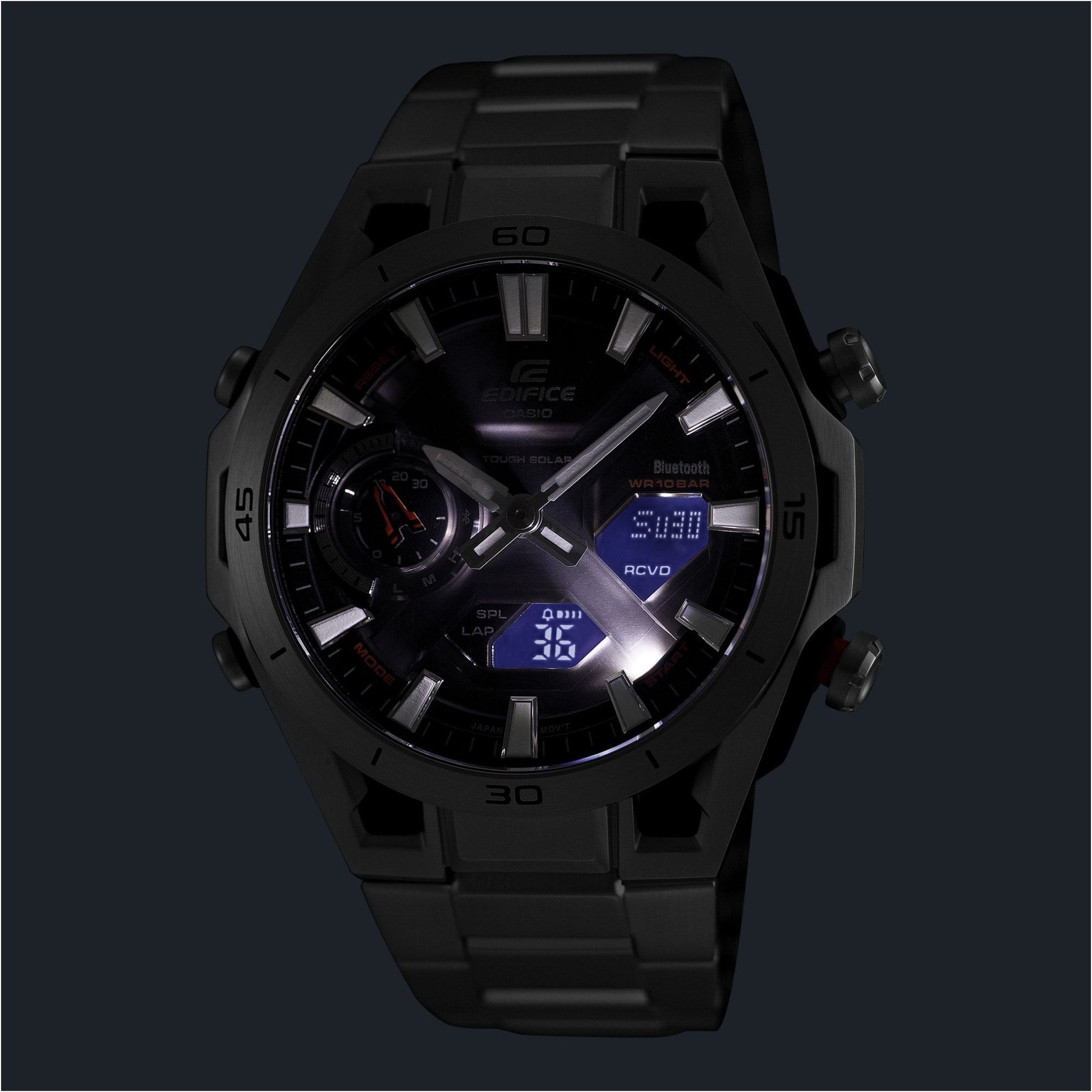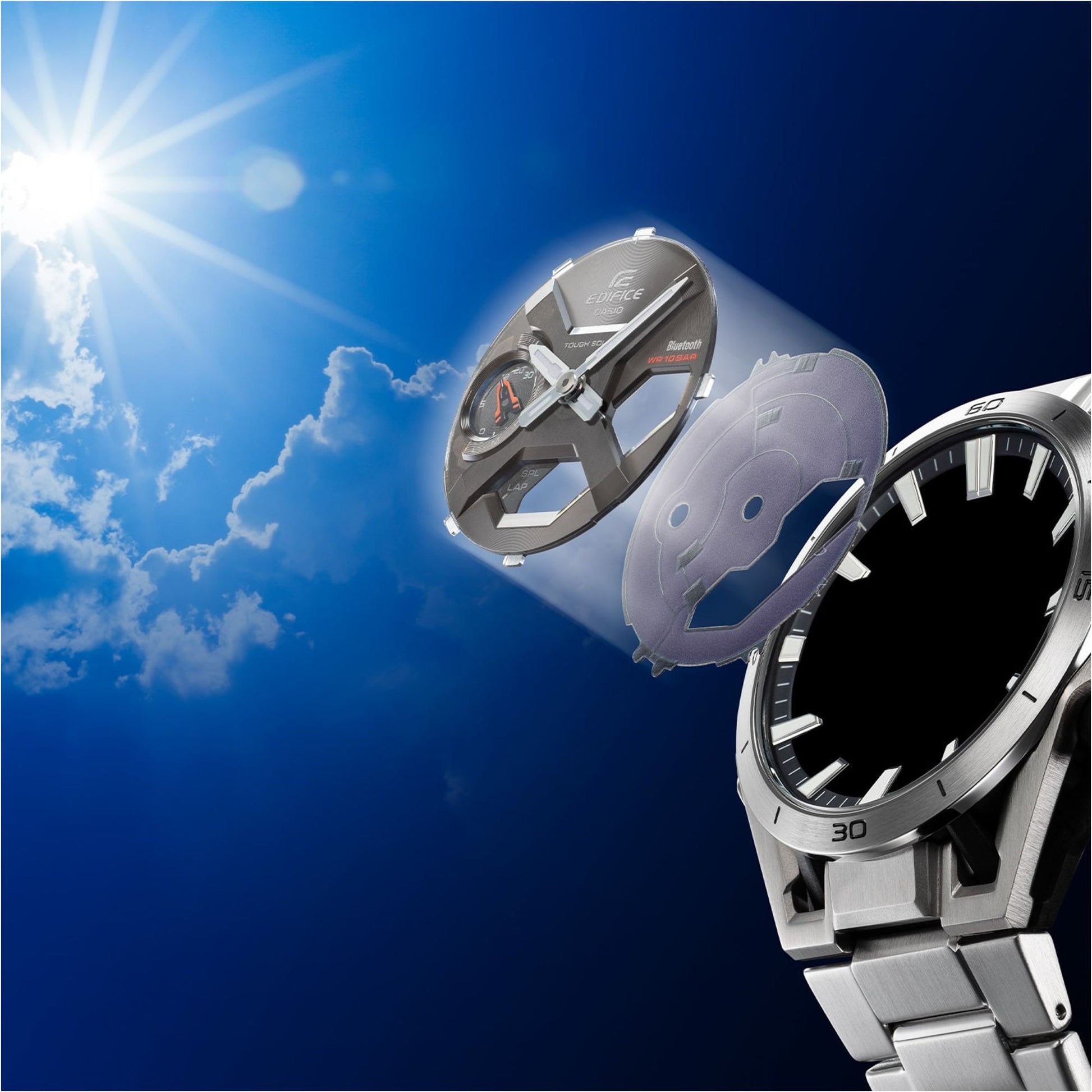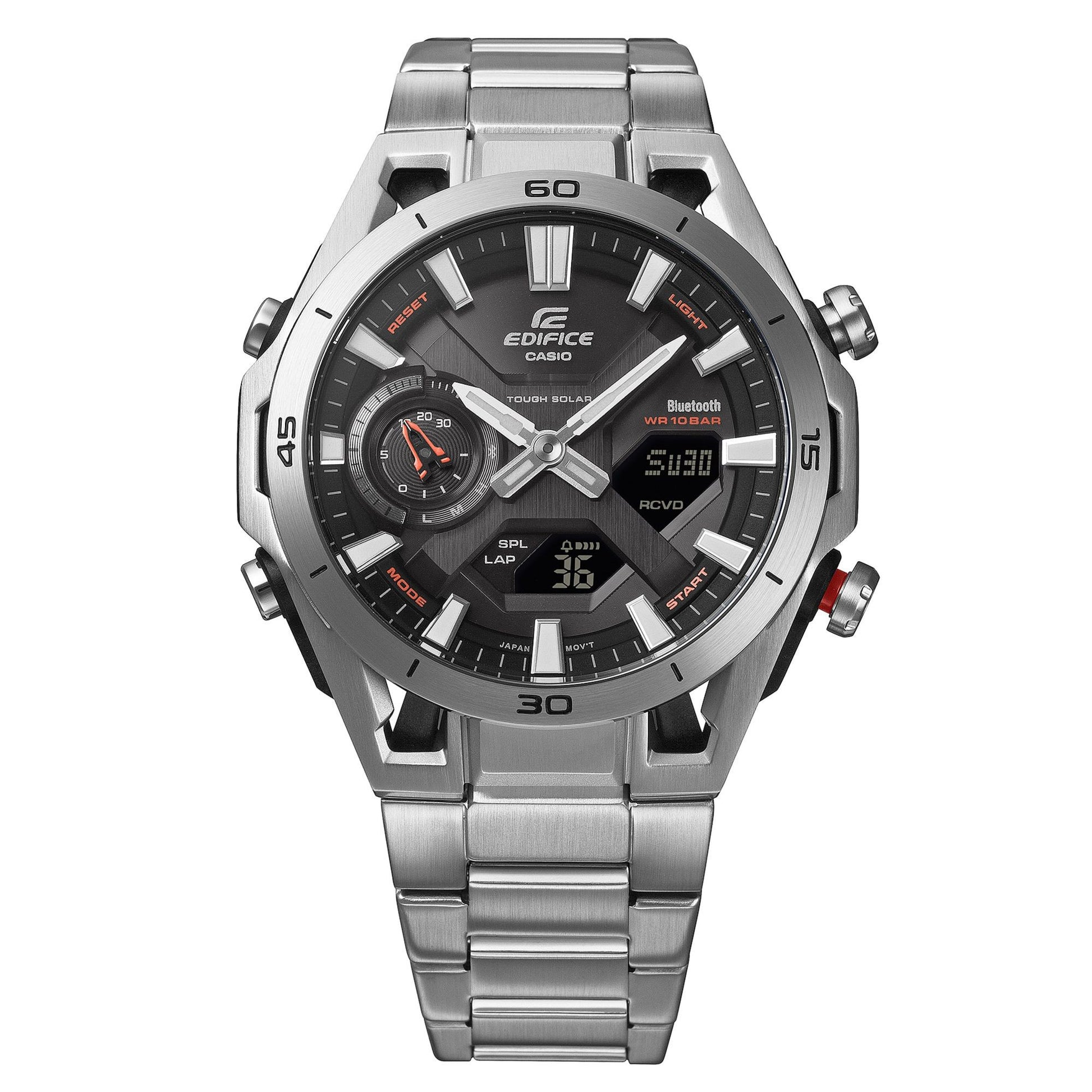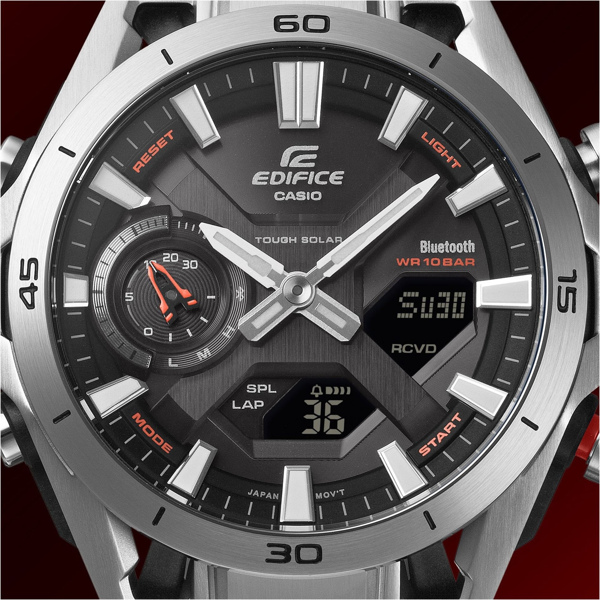 Discover the Edifice ECB-2300 Sospensione series, a motorsports-inspired watch with Bluetooth connectivity and Tough Solar power. This hybrid analog-digital chronograph features carbon fiber construction, a 100m water resistance, and a unique double-wishbone lug design.
