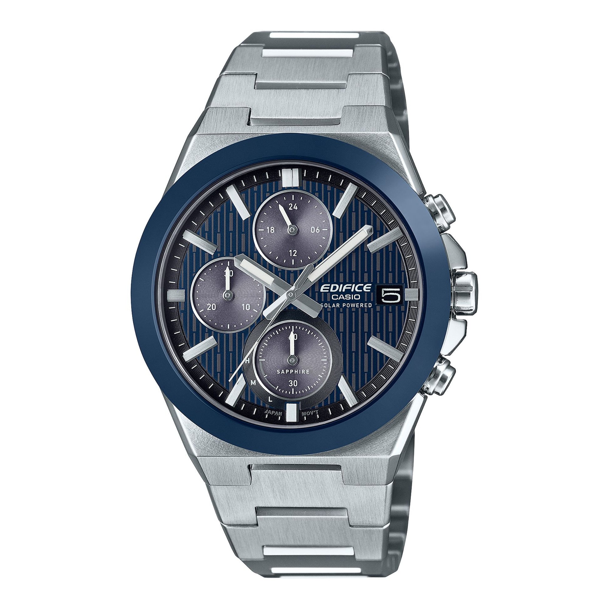 Discover the Casio Edifice EFS-S650 series, featuring a sleek stainless steel design with a durable ceramic bezel. This solar-powered chronograph boasts 100m water resistance, a sapphire crystal, and a robust stainless steel bracelet with a one-touch clasp.