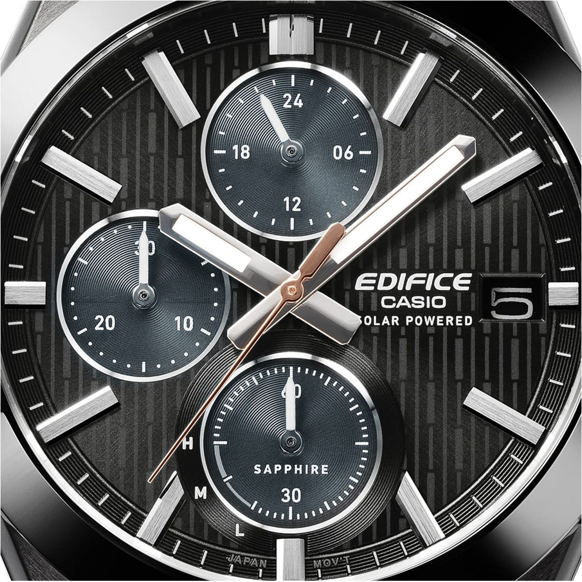Discover the Casio Edifice EFS-S650 series, featuring a sleek stainless steel design with a durable ceramic bezel. This solar-powered chronograph boasts 100m water resistance, a sapphire crystal, and a robust stainless steel bracelet with a one-touch clasp.