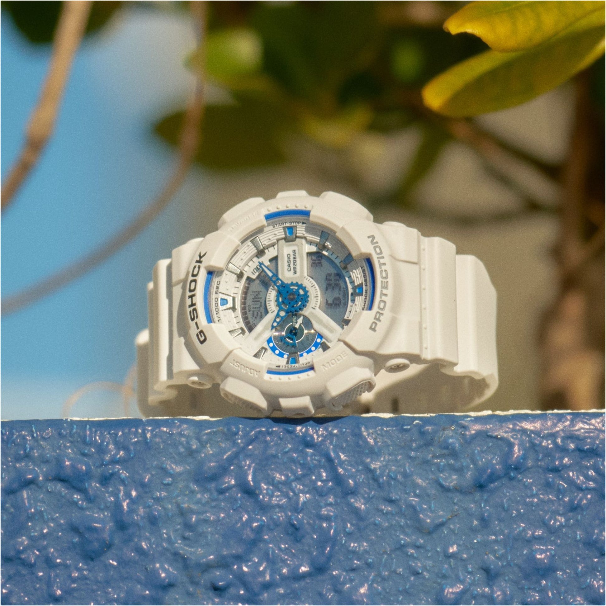 Embrace summer vibes with the G-Shock white and blue watch, inspired by the ocean glow! Its phosphorescent dial shimmers like bioluminescent plankton at night. Perfect for beach days or everyday wear, this stylish yet rugged watch transitions effortlessly from casual to work. Dive into adventure with timeless design!