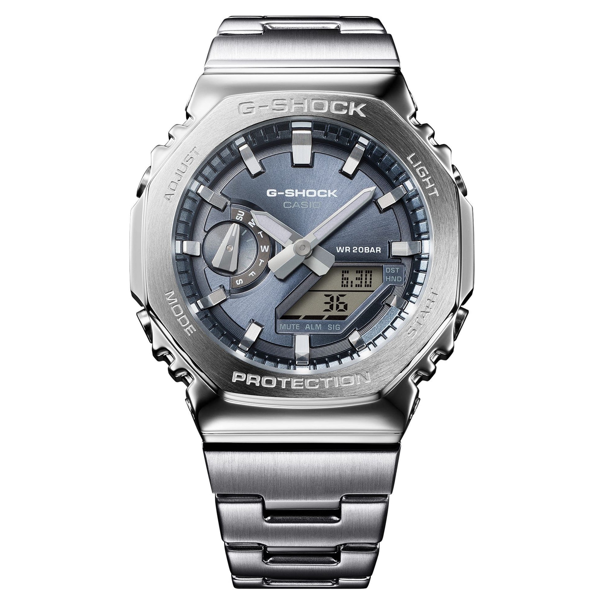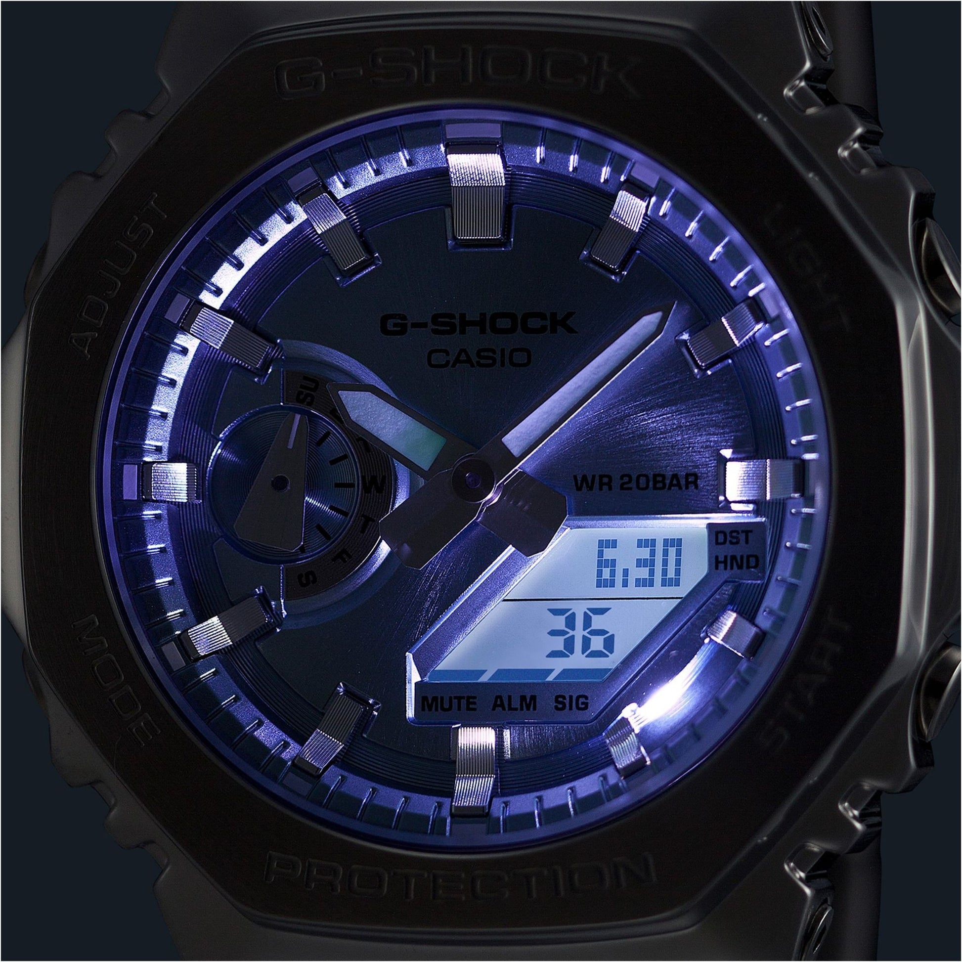 Discover the GM-2110D, an impressive analog-digital G-Steel model inspired by the GA-2100. It features a sleek octagonal stainless-steel bezel and a slim 11.8 mm case made from durable glass-fiber-reinforced resin. The versatile metal band and vibrant brass dial suit any occasion, while the high-brightness double LED light ensures visibility in low light.