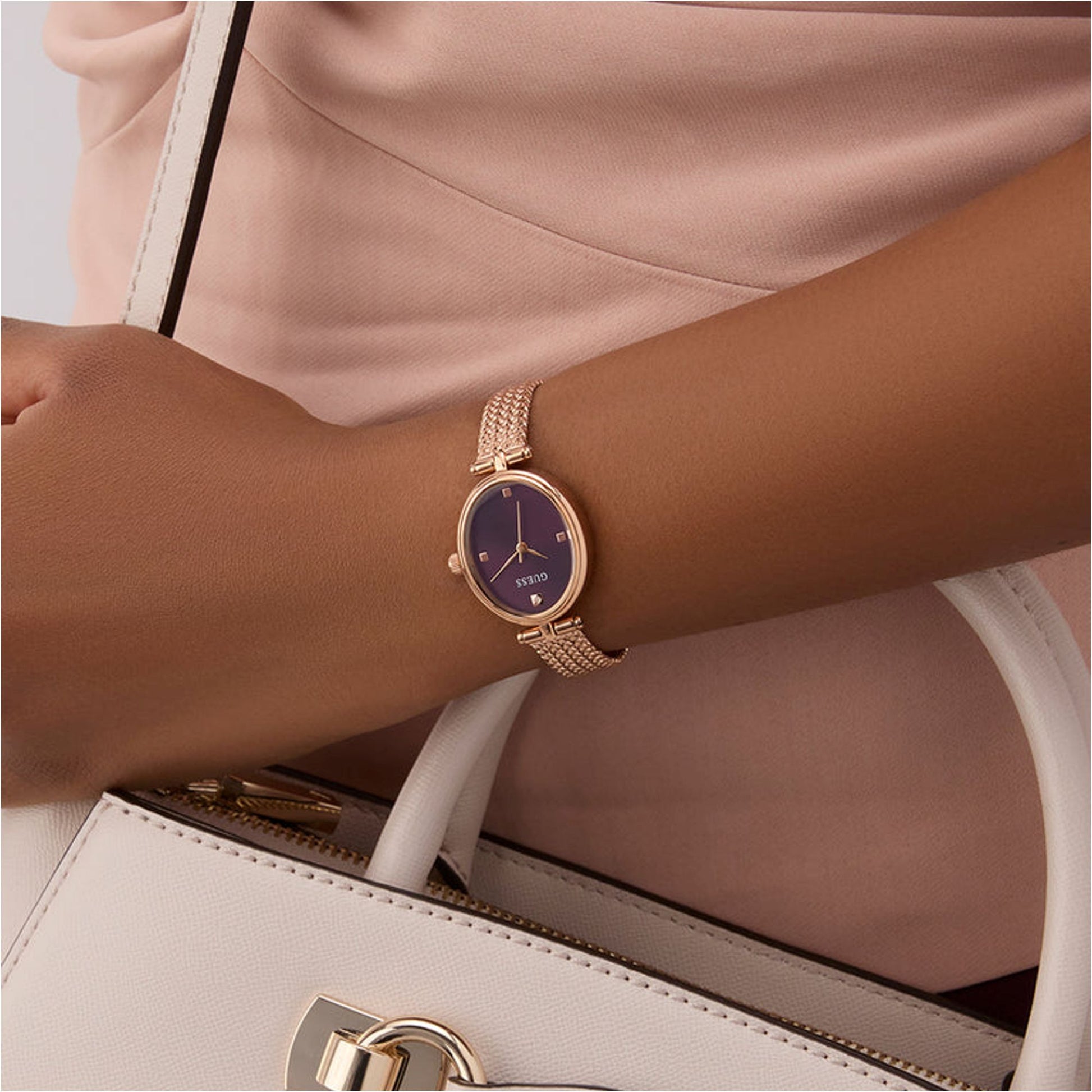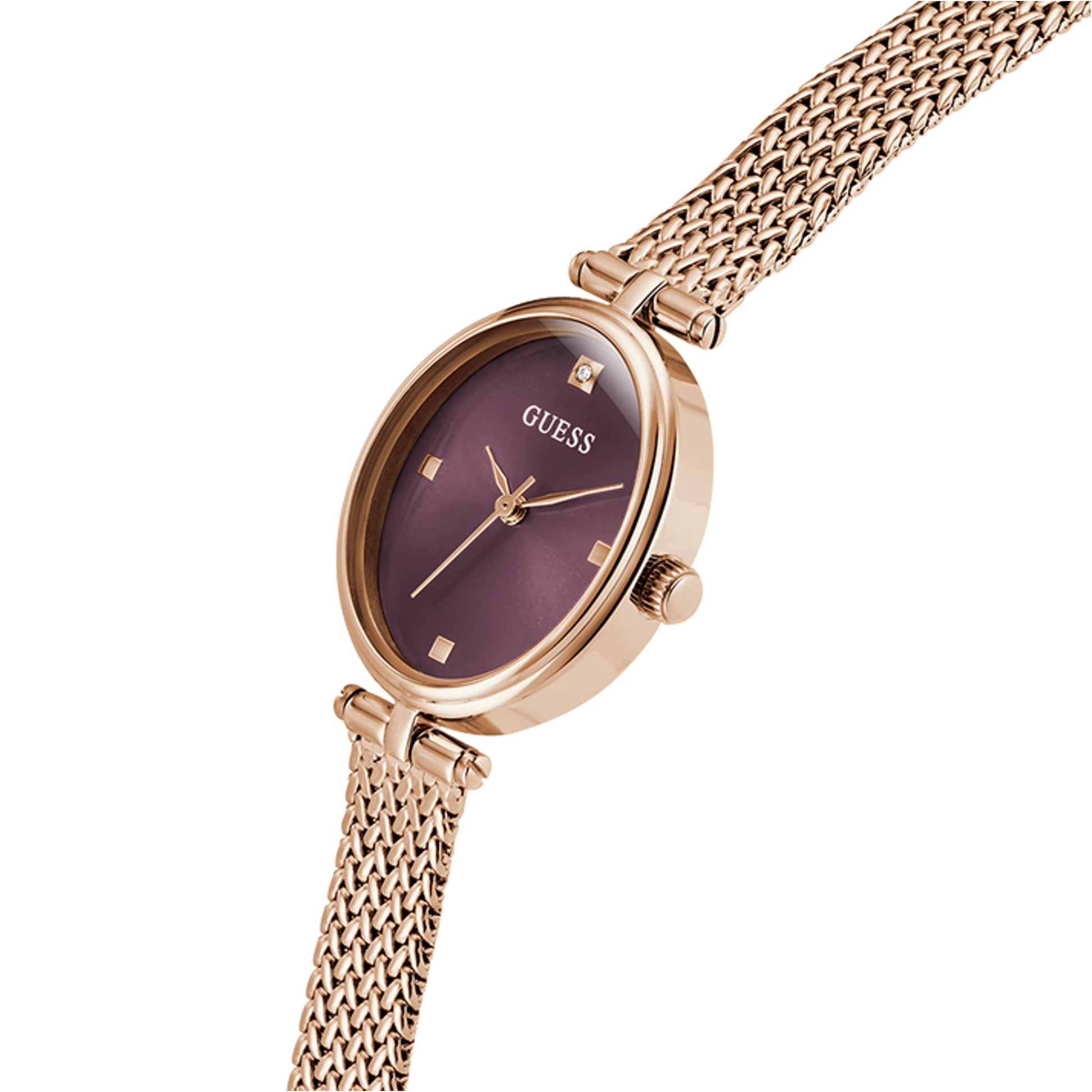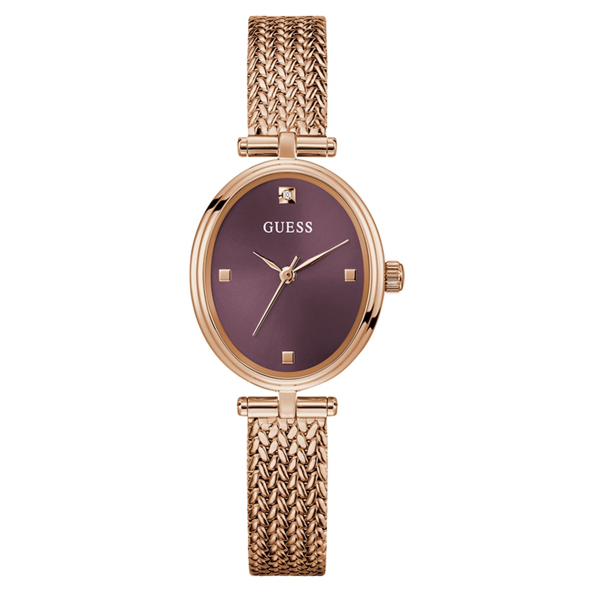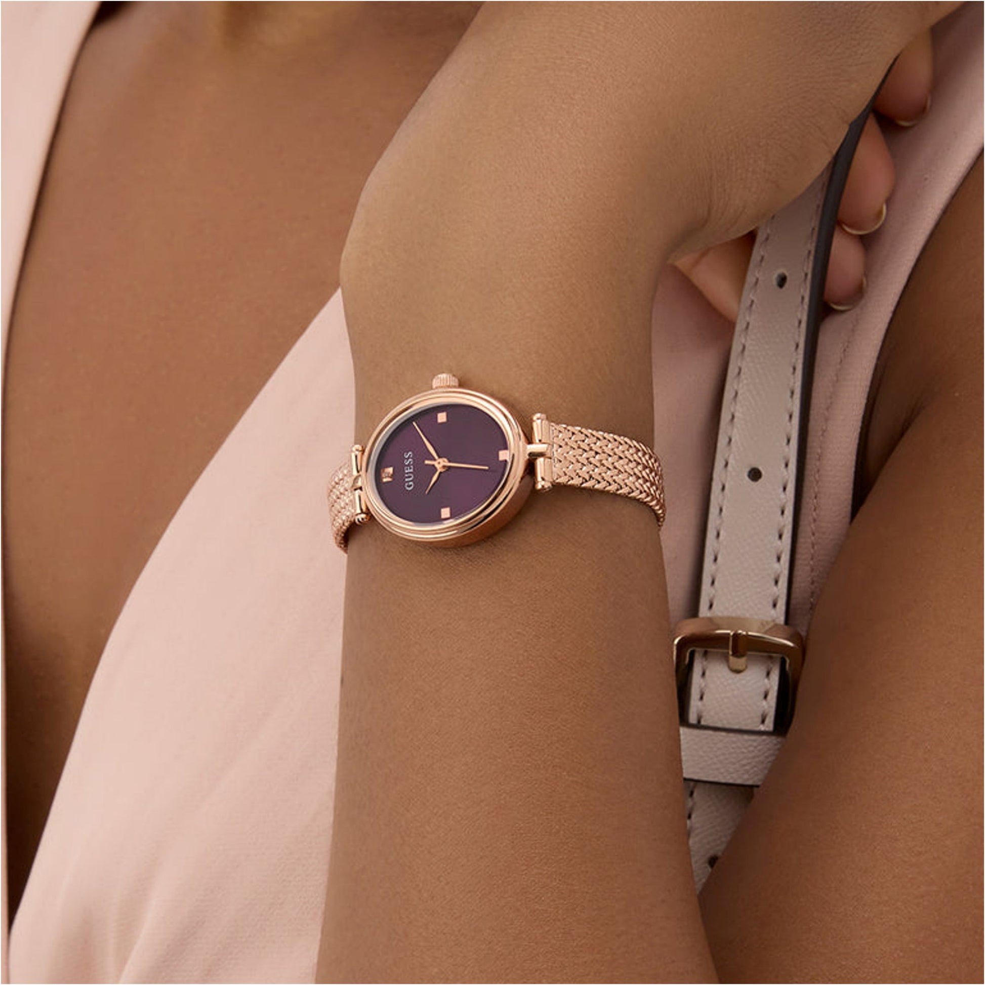 Discover the Guess Ruby GW0935L3, a women watch blending modern elegance with classic details. This elegant oval watch features a petite 24mm recycled stainless steel case, a sleek purple dial with sparkling crystal hour markers, and a herringbone-textured, adjustable mesh bracelet for everyday versatility.