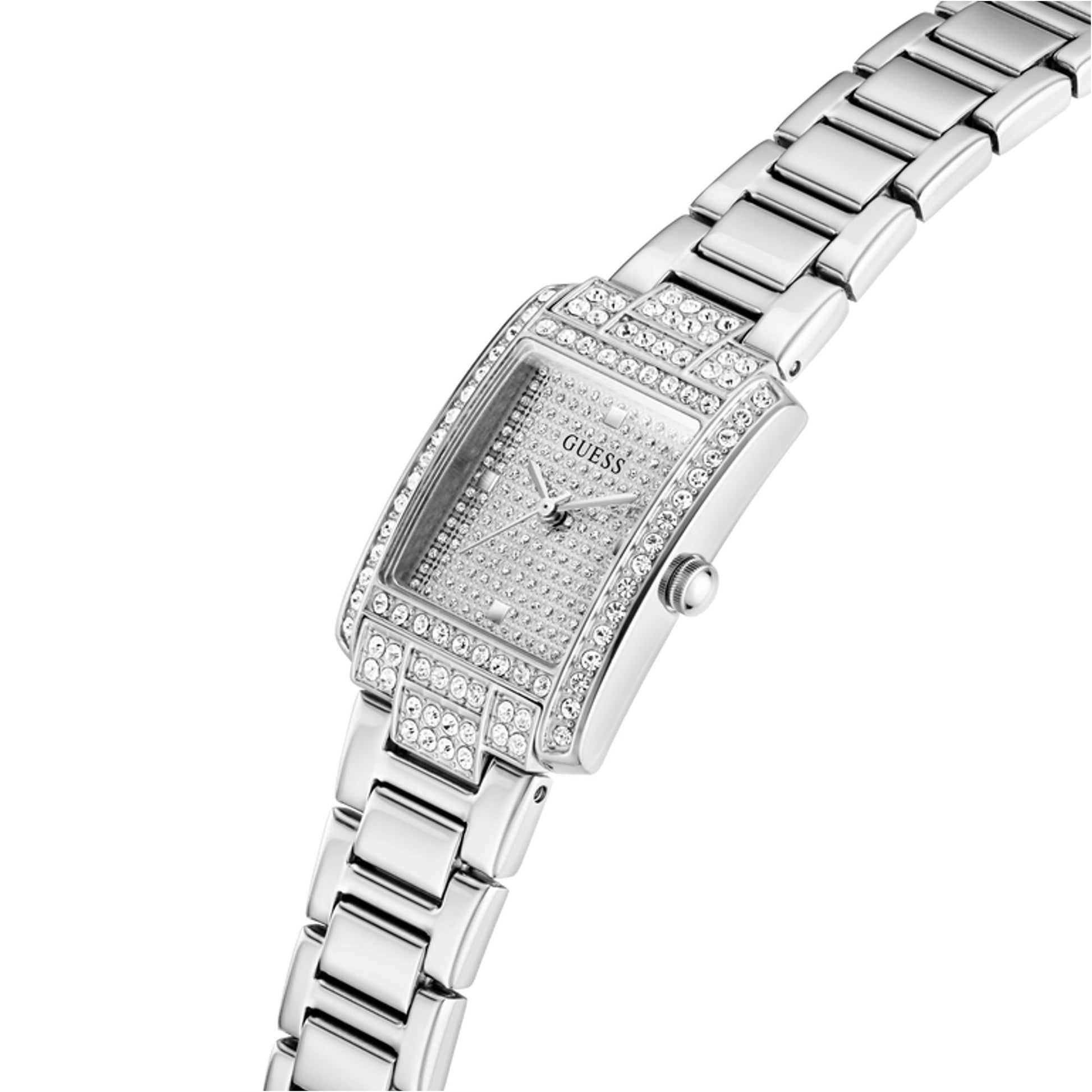 Adorn your wrist with the elegant Guess Bonnet GW0995L1 watch, featuring a distinctive rectangular stainless steel case, a shimmering silver dial, and a matching bracelet with a deployment clasp. Perfect for the modern wardrobe, this women fashion timepiece blends Guess's signature style with reliable quartz movement and water resistance for everyday sophistication.
