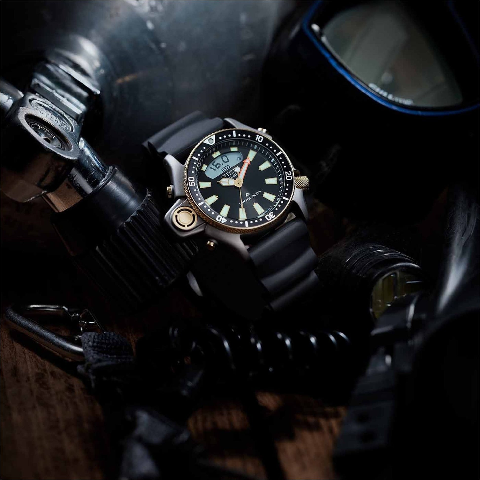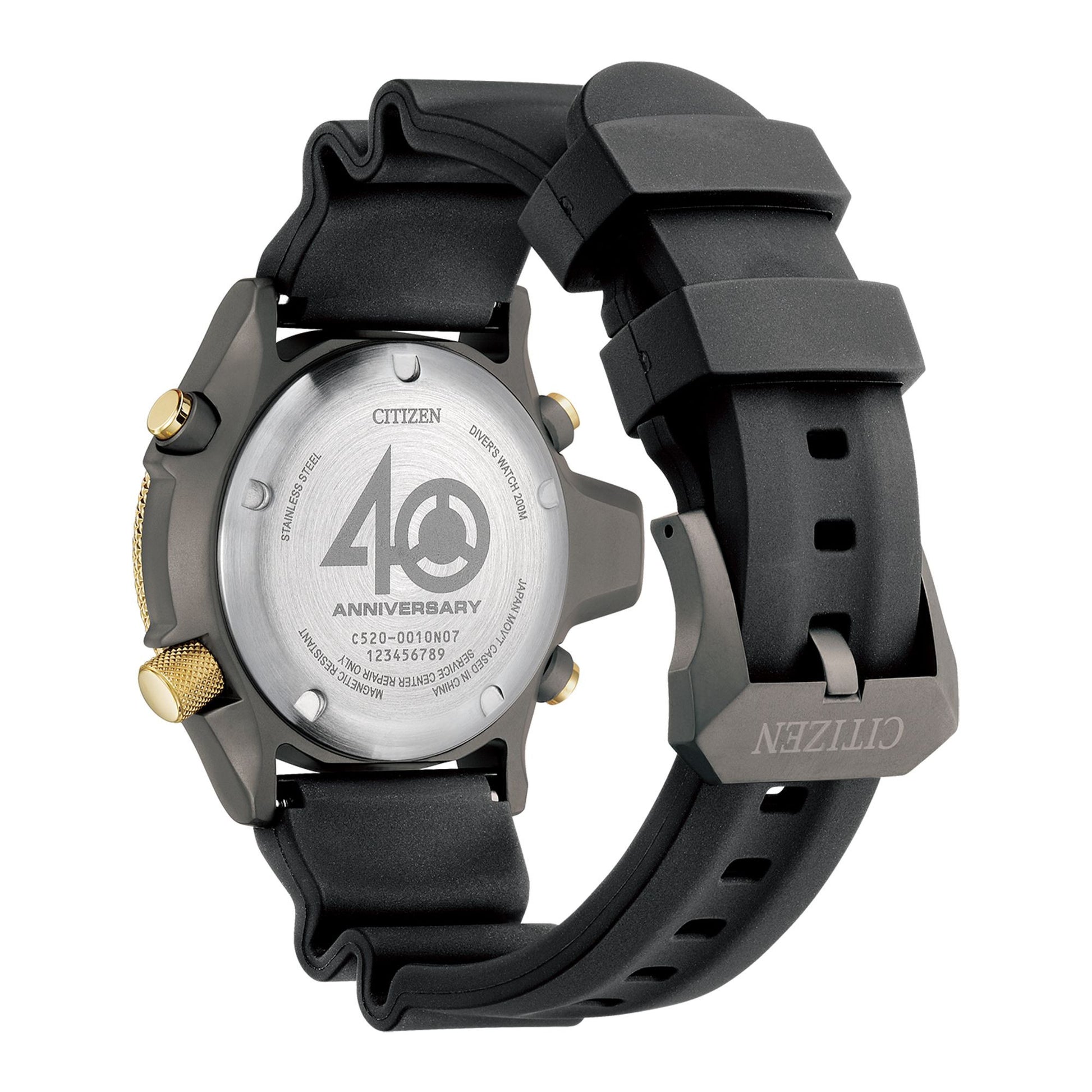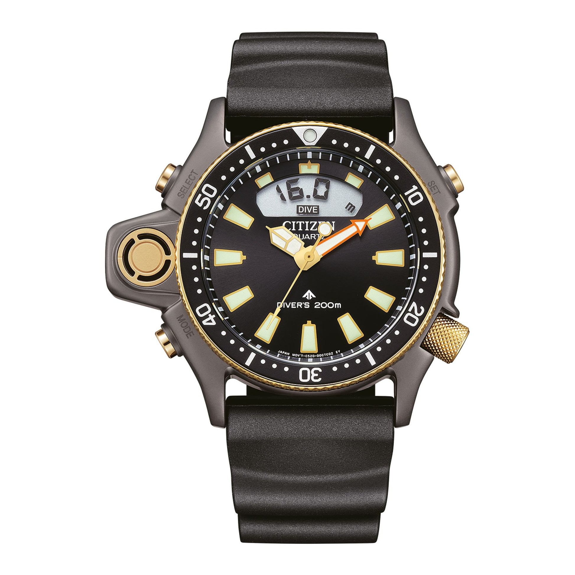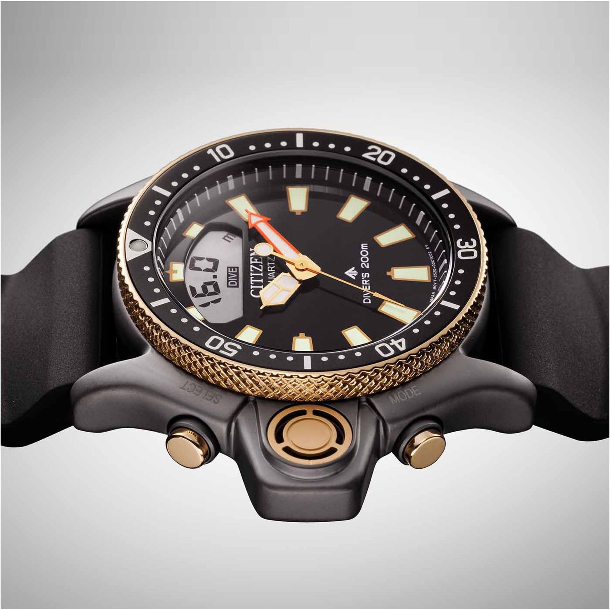 Discover the limited edition Citizen Promaster Aqualand 40th Anniversary JP2008-06E. This iconic dive watch features the world first electronic depth sensor, a gray brushed case with gold accents, and a plant-based rubber strap. Measures depth, dive time, and ascent speed. A tribute to 40 years of innovation.