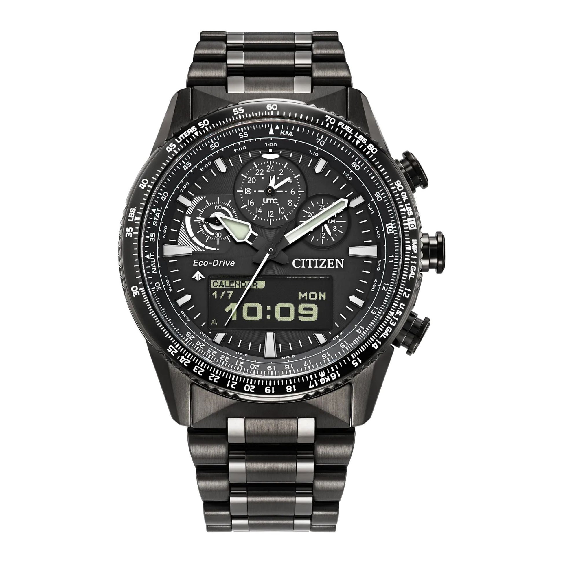 Elevate your performance with the Citizen Promaster Skyhawk U830 - a 43mm chronograph featuring an analog-digital dial and slide-rule bezel. Built for action with 200m water resistance, 1/100-second chronograph, perpetual calendar, and countdown timer. Powered by Eco-Drive technology for precision in any adventure.