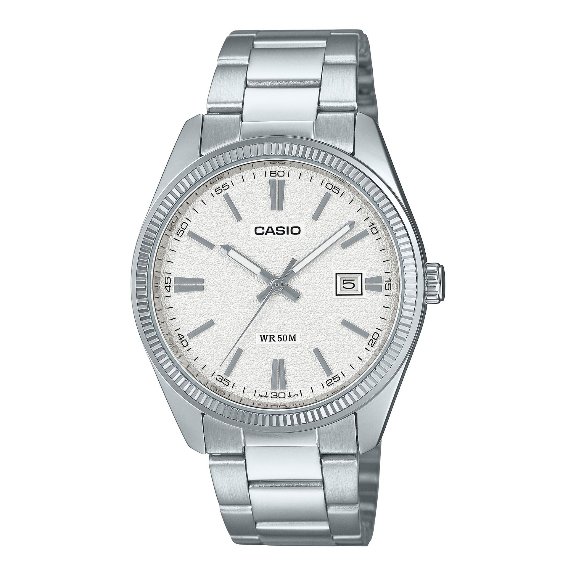 Discover the Casio MTP-1302DA, a classic men dress watch featuring a 38.5mm metal case, textured matte dial, and luminous hands. Powered by reliable quartz with 3-year battery life, mineral crystal, and 50m water resistance. Perfect for formal occasions.