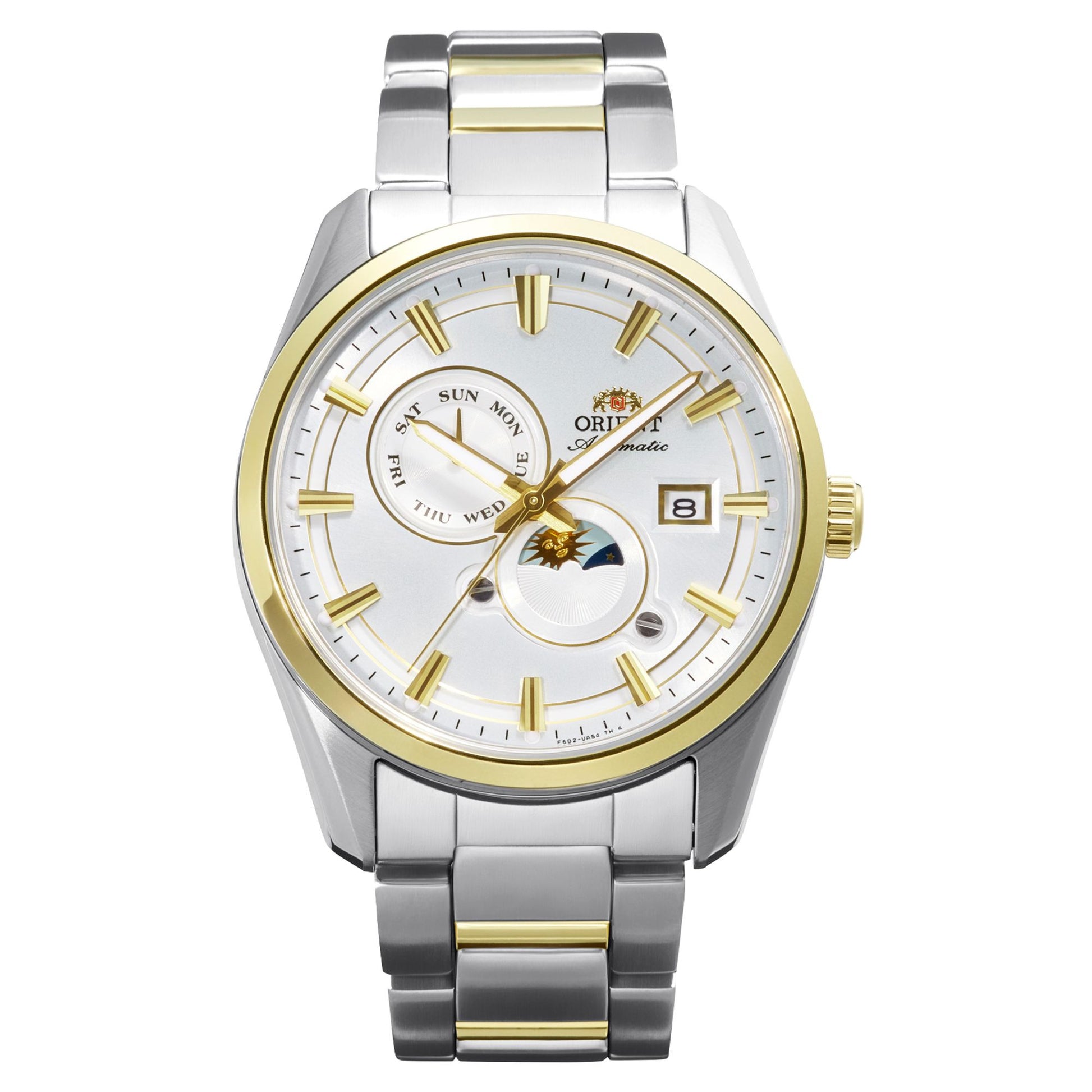 Discover the Orient Stretto Sun and Moon series, featuring a 40.8mm stainless steel case and a sophisticated automatic movement with a distinctive day/night indicator. Powered by the in-house Caliber F6B24 with 40-hour power reserve, this elegant timepiece offers sapphire crystal, luminous hands, and a 50m water-resistant design with exhibition case back.