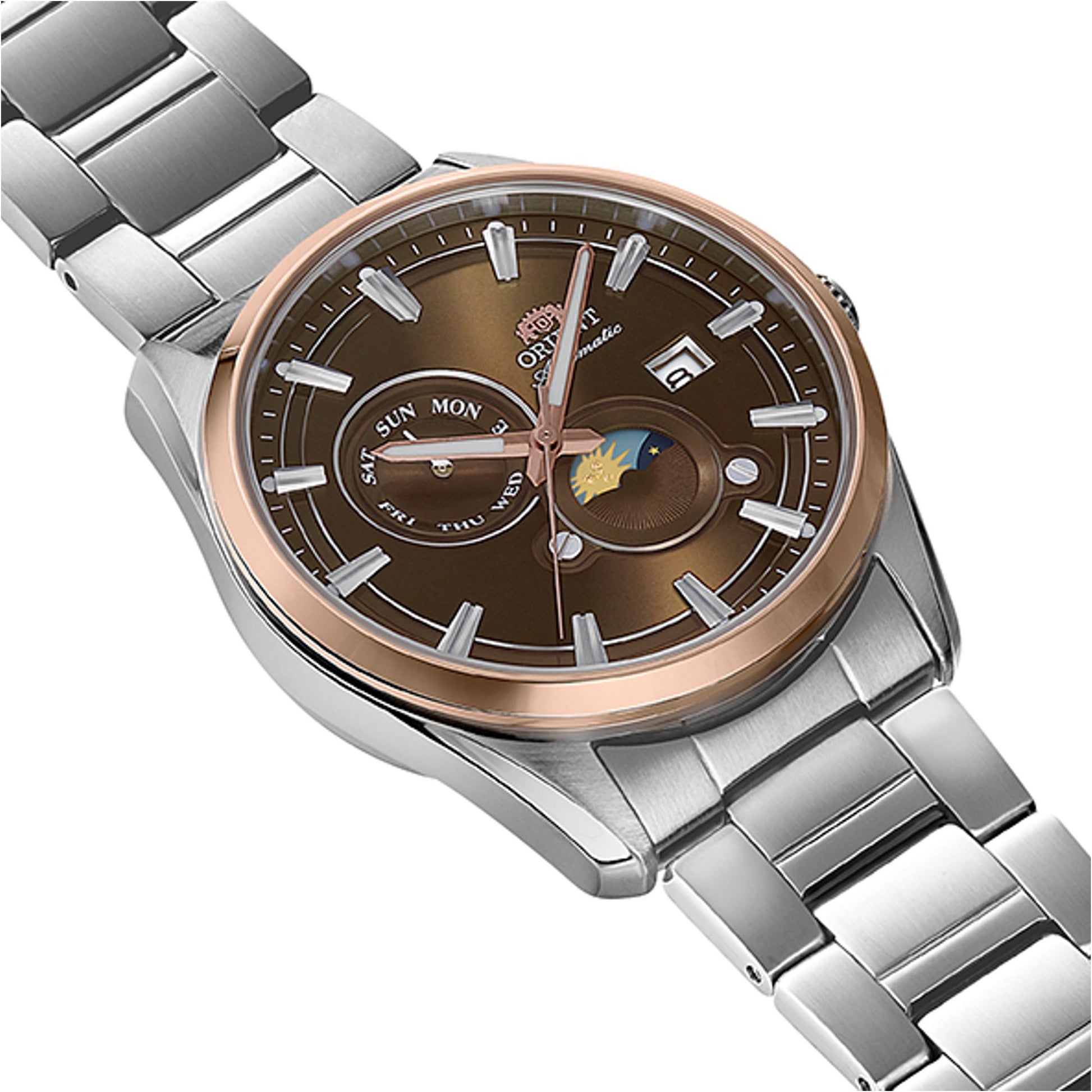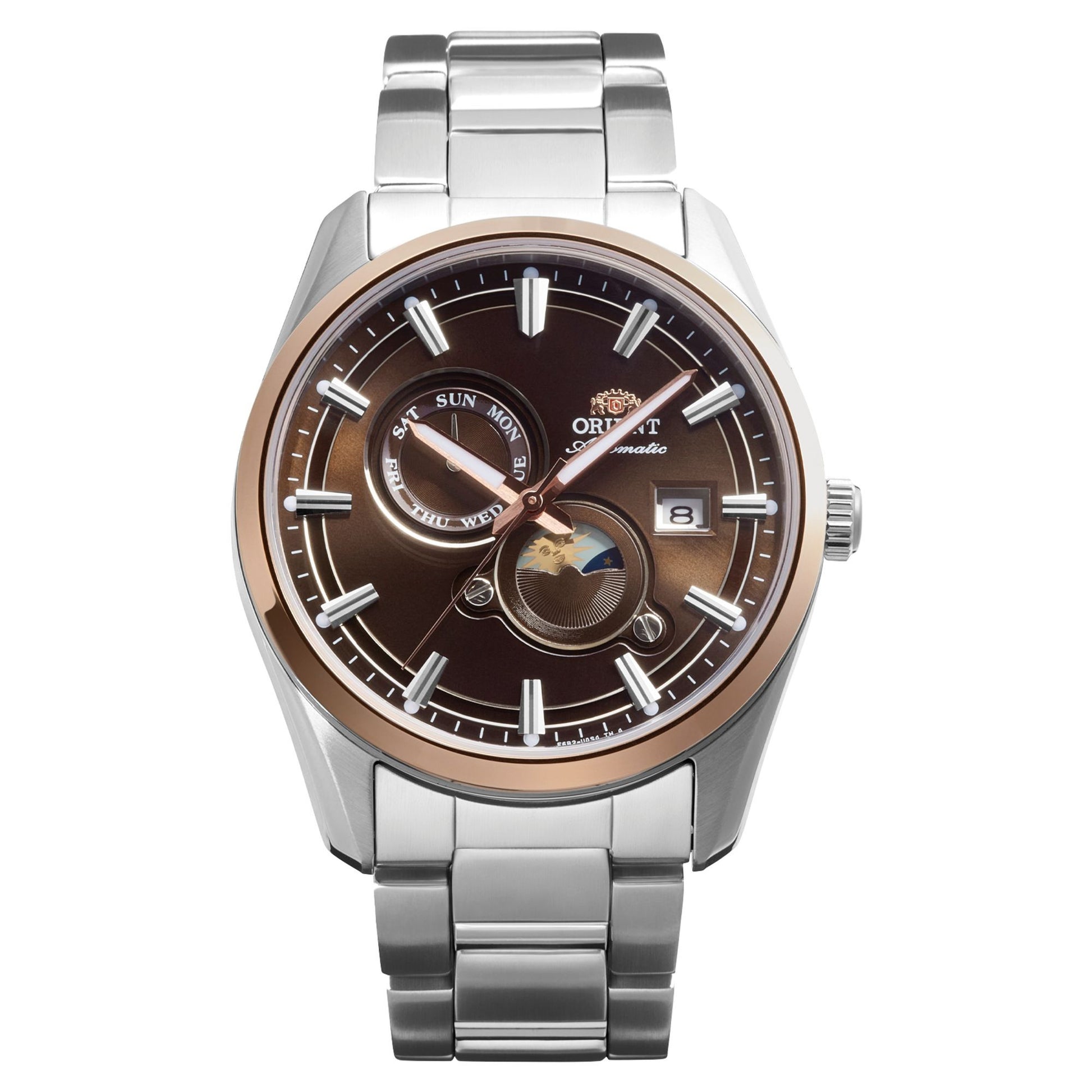 Discover the Orient Stretto Sun and Moon series, featuring a 40.8mm stainless steel case and a sophisticated automatic movement with a distinctive day/night indicator. Powered by the in-house Caliber F6B24 with 40-hour power reserve, this elegant timepiece offers sapphire crystal, luminous hands, and a 50m water-resistant design with exhibition case back.