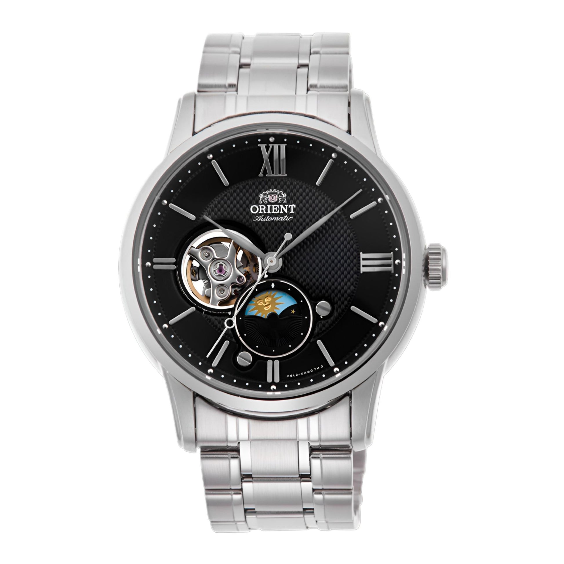 Discover the Orient RA-AS0008B mechanical watch featuring a unique sun and moon day/night display and semi-skeleton dial. This contemporary timepiece combines a stainless steel case, curved sapphire crystal, and automatic movement for sophisticated watch enthusiasts.