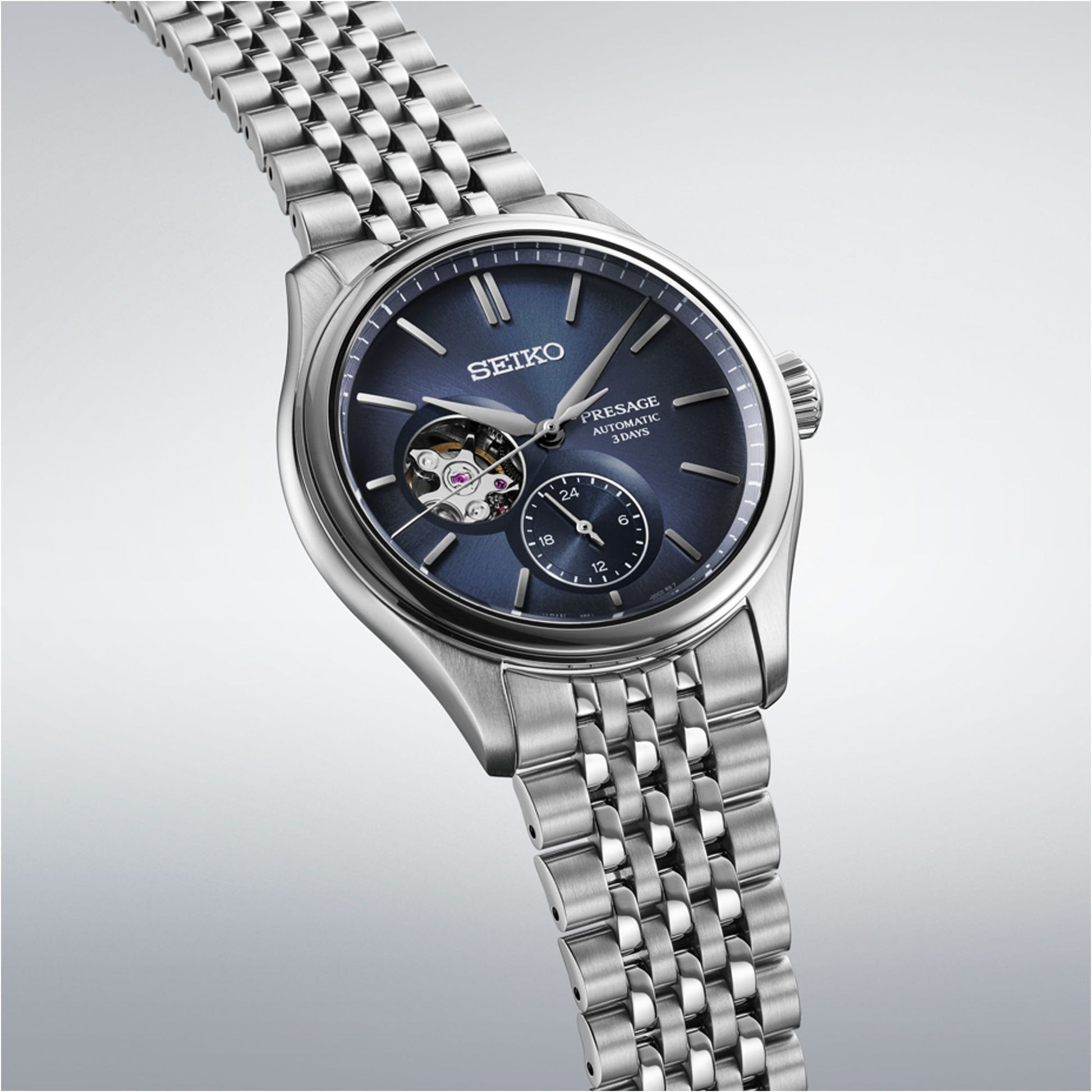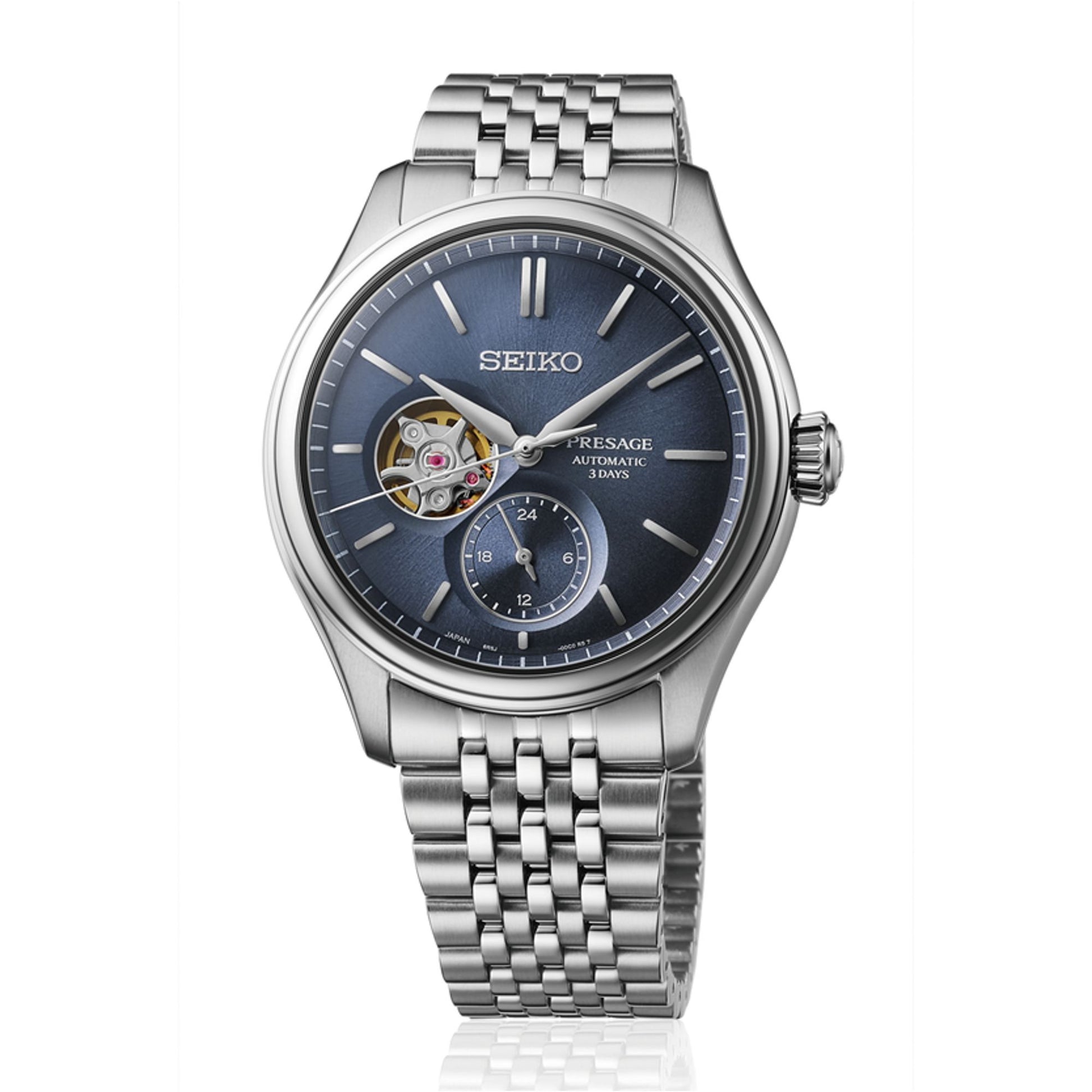 Experience the Seiko Presage SPB527J1 Ai-iro with its captivating open-heart dial showcasing the intricate 6R55 automatic movement through a window in the stunning indigo silk-textured dial. This 40.2mm timepiece combines Japanese heritage with modern watchmaking, featuring dual-curved sapphire crystal, 100m water resistance, and a sophisticated multi-row stainless steel bracelet that offers both vintage inspiration and contemporary comfort.