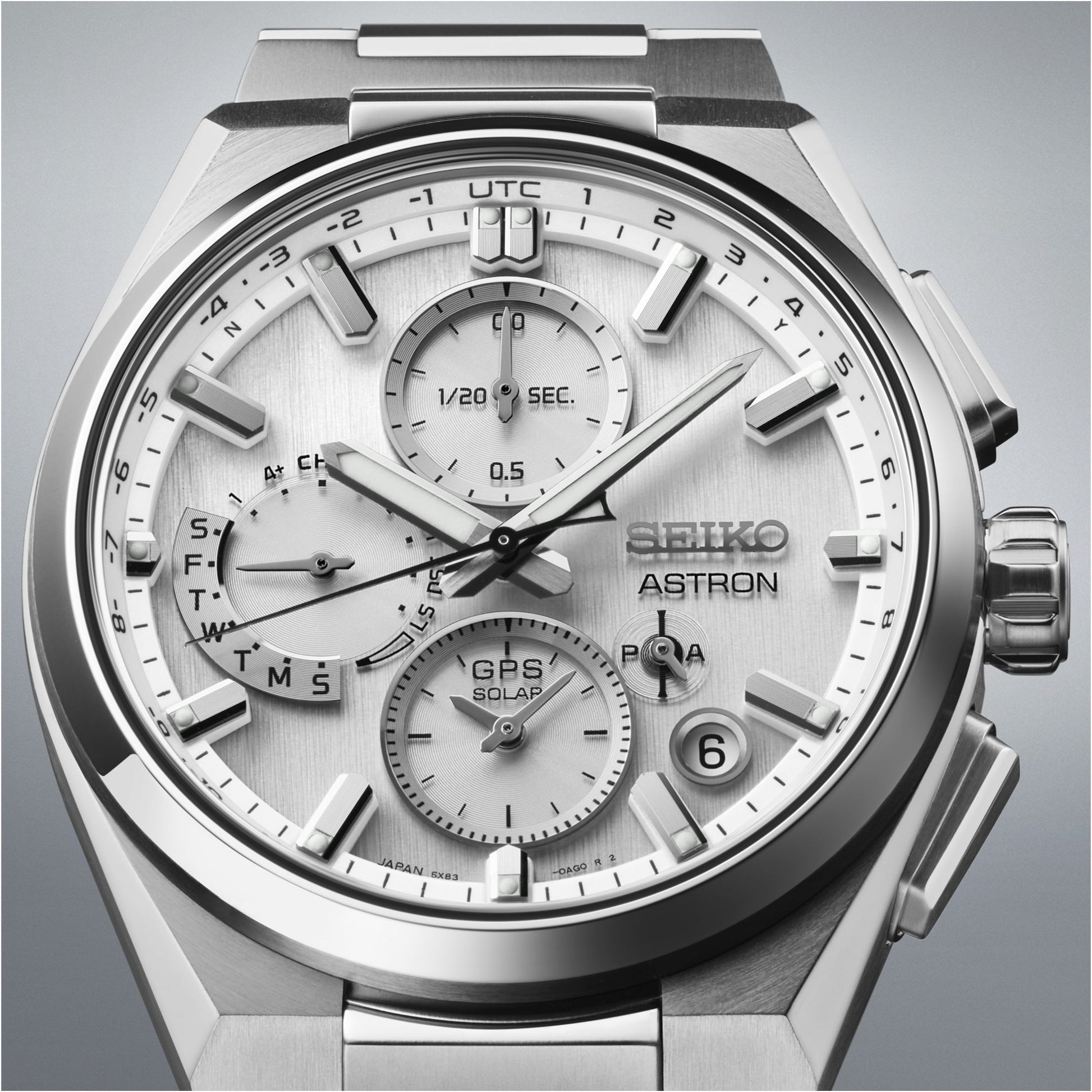Discover the Seiko Astron Nexter GPS Solar Chronograph - a fusion of rugged design and cutting-edge tech. Featuring the new Caliber 5X83 with 1/20-second stopwatch, dual time zones, and faster time transfer. Available in crystal white, midnight blue, or asphalt gray, with a slim titanium bezel and hairline-pattern dial for ultimate precision and style.