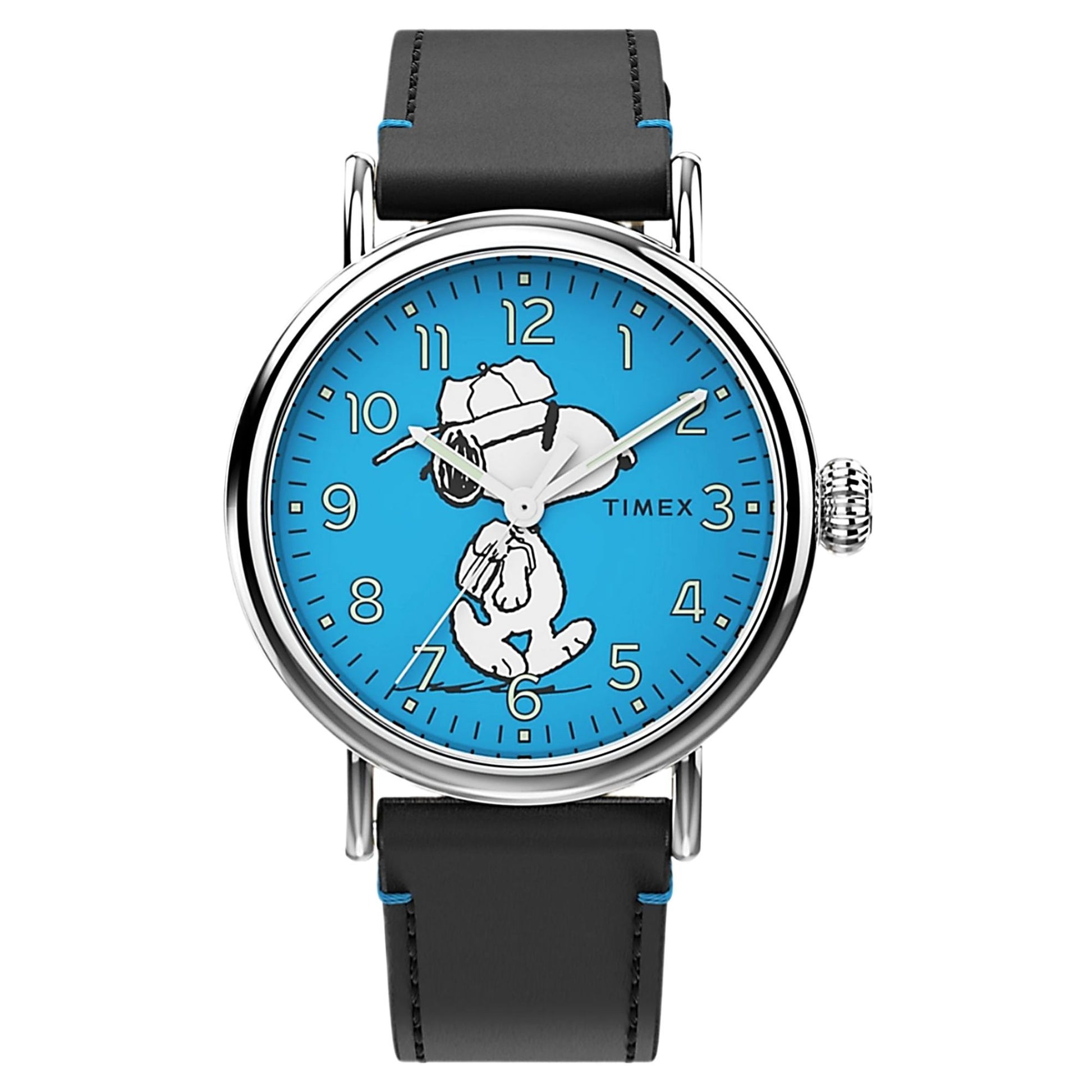 Gear up for the school year with confidence wearing our Peanuts beagle watch. The Timex Standard features a vibrant blue dial with Snoopy graphics and a sleek black leather strap. With an Indiglo backlight and 50-meter water resistance, this watch is perfect for tackling any nerves as you embrace the new academic year.