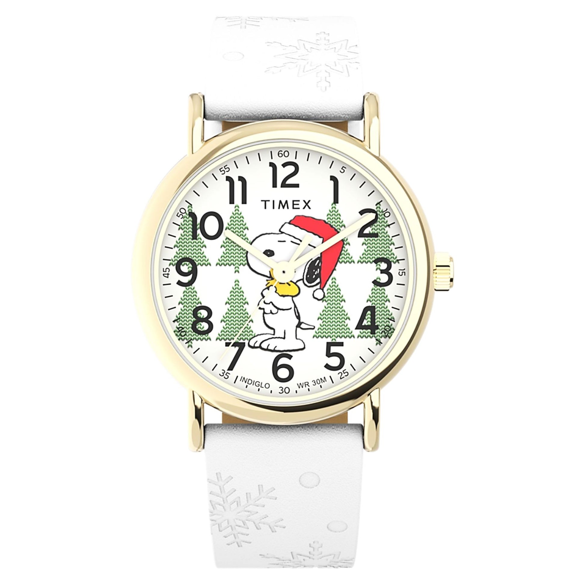 Discover the Timex Weekender x Peanuts Holiday watch TW2W24100, featuring Snoopy and Woodstock on a festive white dial with a snowflake-embossed leather strap. This 38mm gold-tone watch includes quartz accuracy, Indiglo night-light, and water resistance to 30 meters.