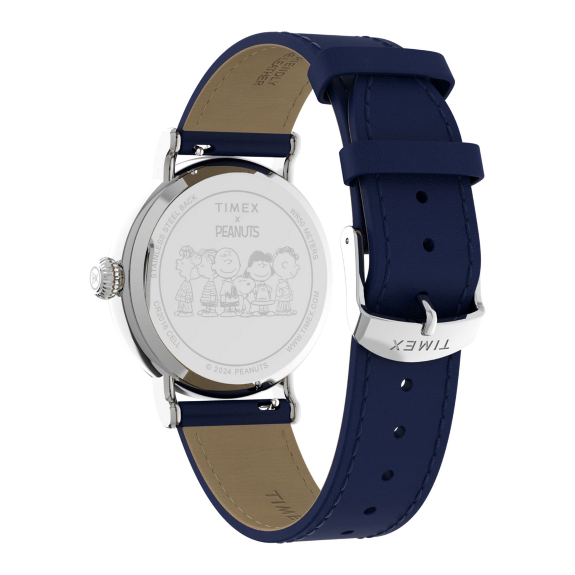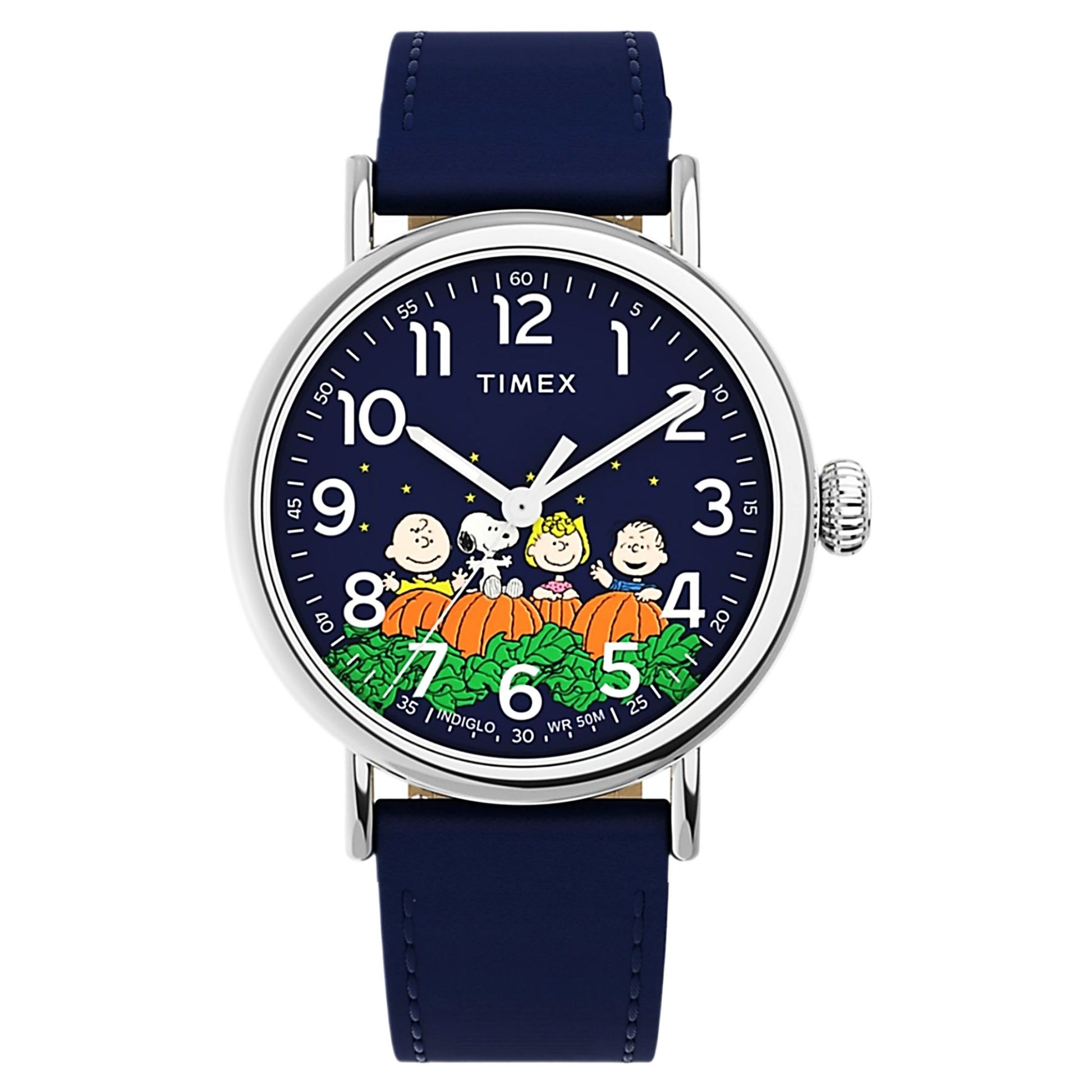 Discover the charm of the Peanuts gang as they accompany Linus in the pumpkin patch on our Timex Standard watch. This stylish timepiece boasts a 40mm silver-tone case, a prominent onion crown, and a blue natural leather strap certified by the Leather Working Group (LWG). With luminous hands and our exclusive INDIGLO backlight, it's perfect for any occasion.