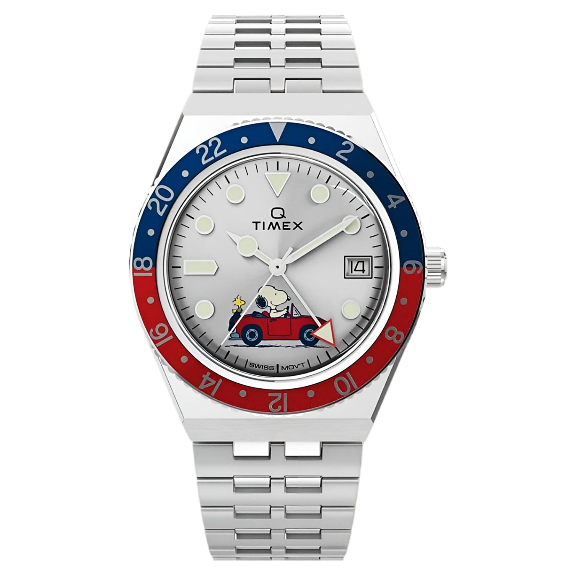 Experience adventure with Snoopy and Woodstock on the Q Timex GMT watch. This striking timepiece features a Swiss GMT movement for tracking a second time zone, housed in a durable 38mm stainless-steel case with a matching bracelet. Luminous hands and hour markers enhance readability, while the bold blue and red two-toned bezel adds flair, and quick-release spring bars offer convenience.