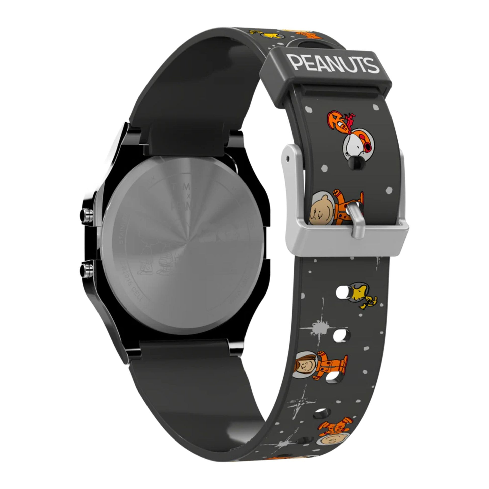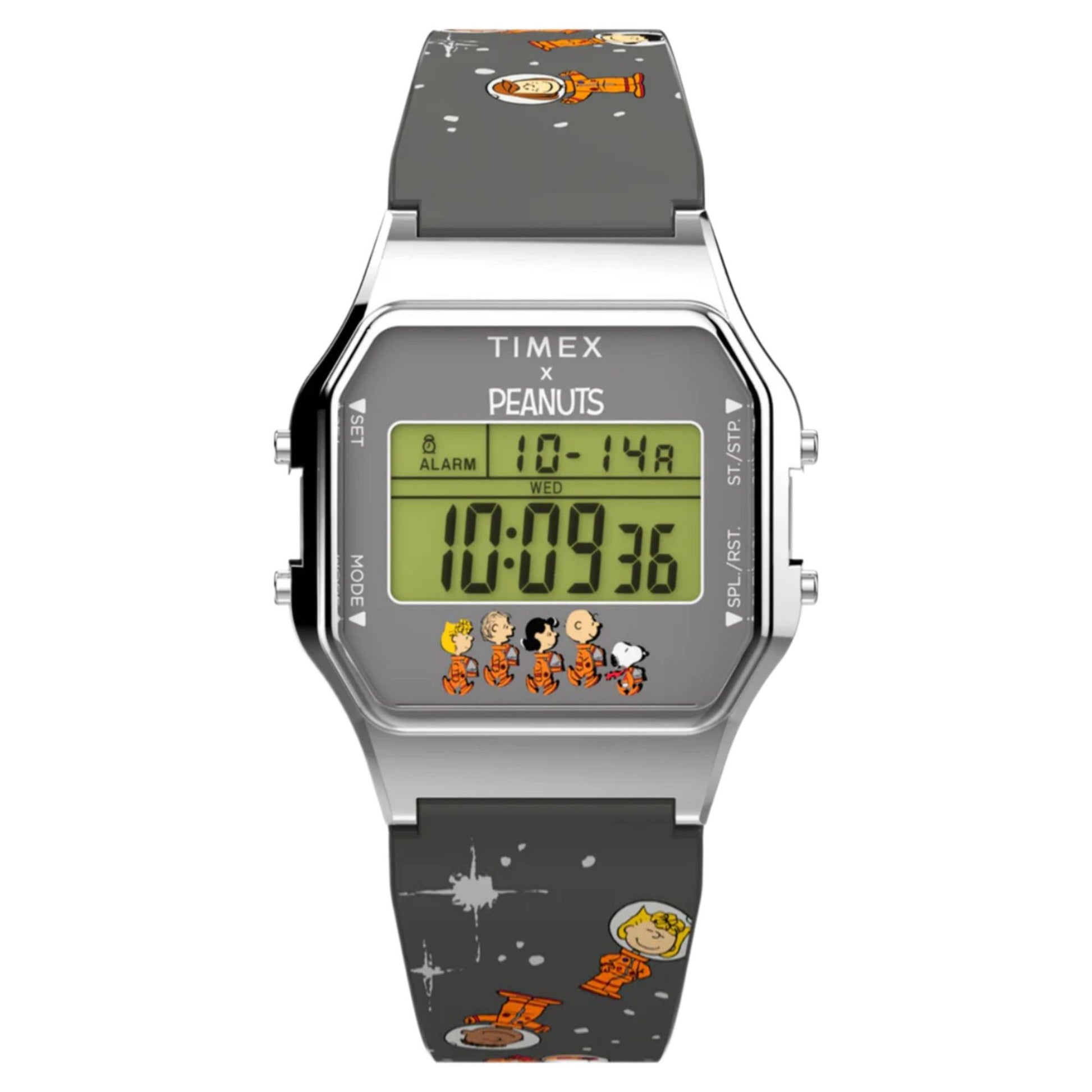 Discover the Timex x Peanuts Space Collection T80 watch, featuring Snoopy and the gang floating against a cosmic backdrop on a dark grey lens. This 34mm retro-style digital watch includes a chronograph, alarm, and timer with a flexible black resin strap for nostalgic, space-inspired style.