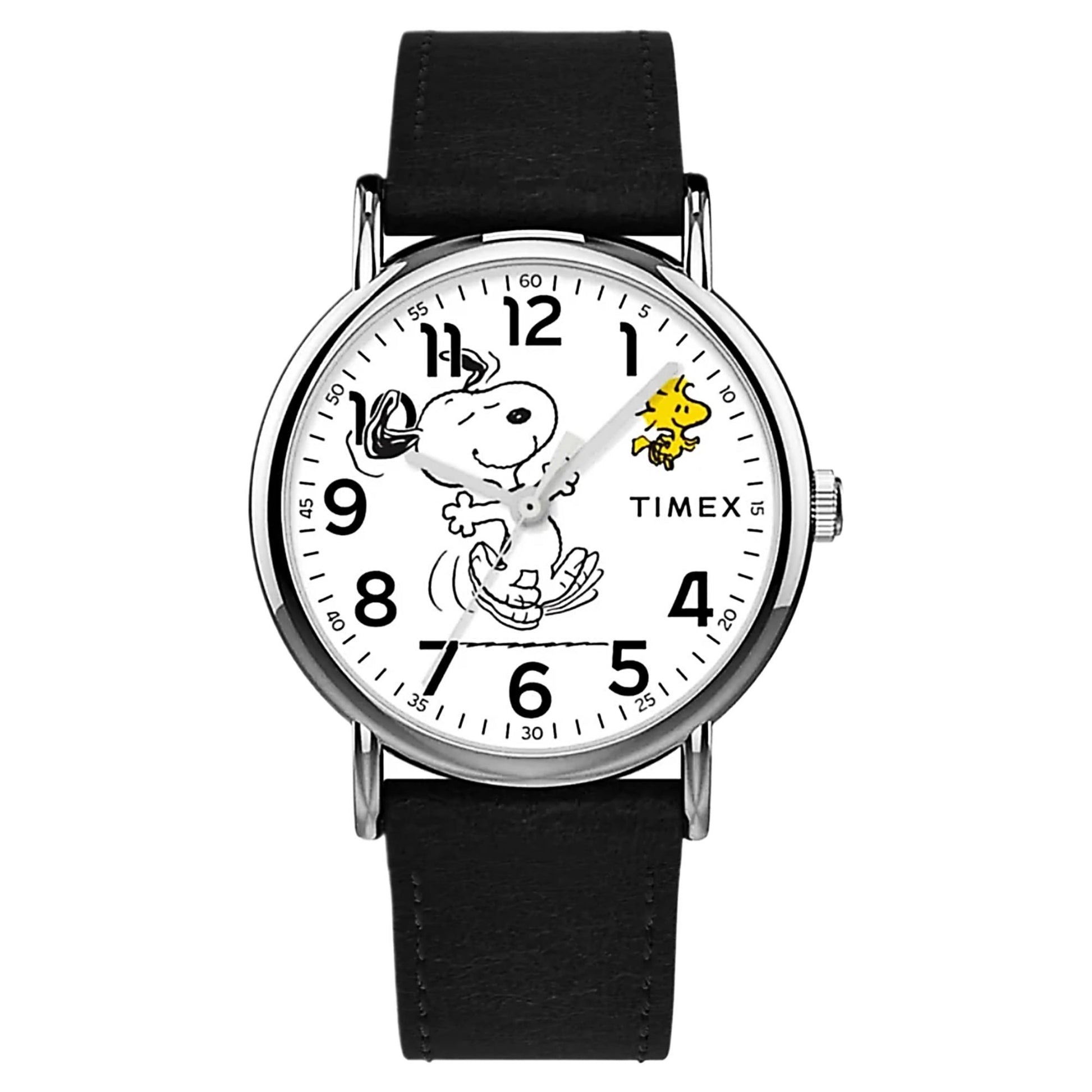 Discover the playful Timex Weekender x Peanuts Snoopy Dancing watch, featuring a charming dancing Snoopy graphic on a clean white dial. This 38mm watch combines a silver-tone brass case, black leather strap, and quartz accuracy for fun, everyday style.